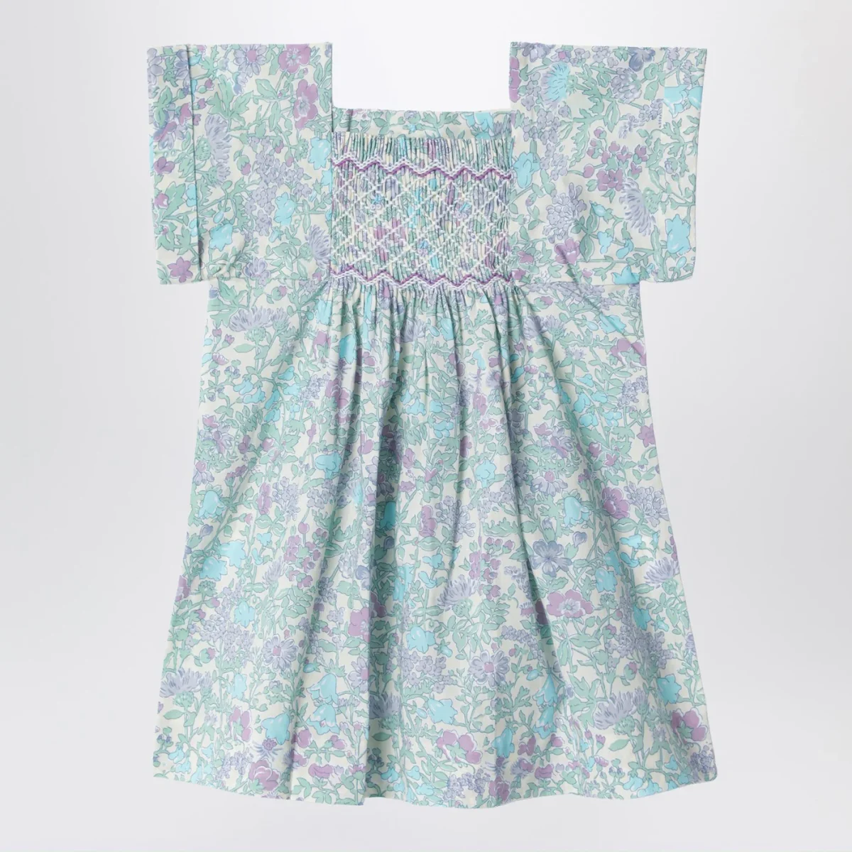 Abitino di Bonpoint in cotone con motivo floreale all over• punto smock ricamato sul davanti• maniche corte• bottoncini sul retro