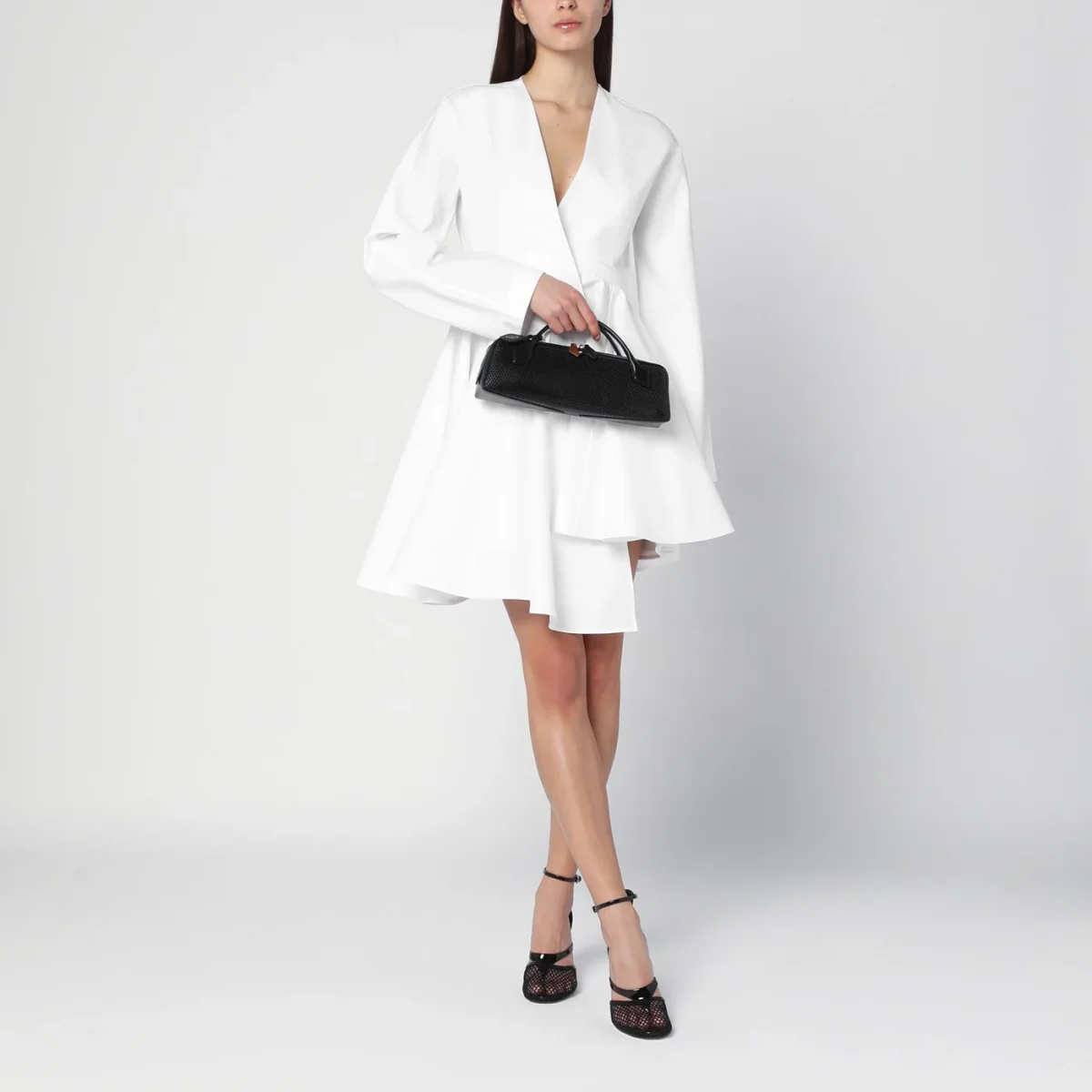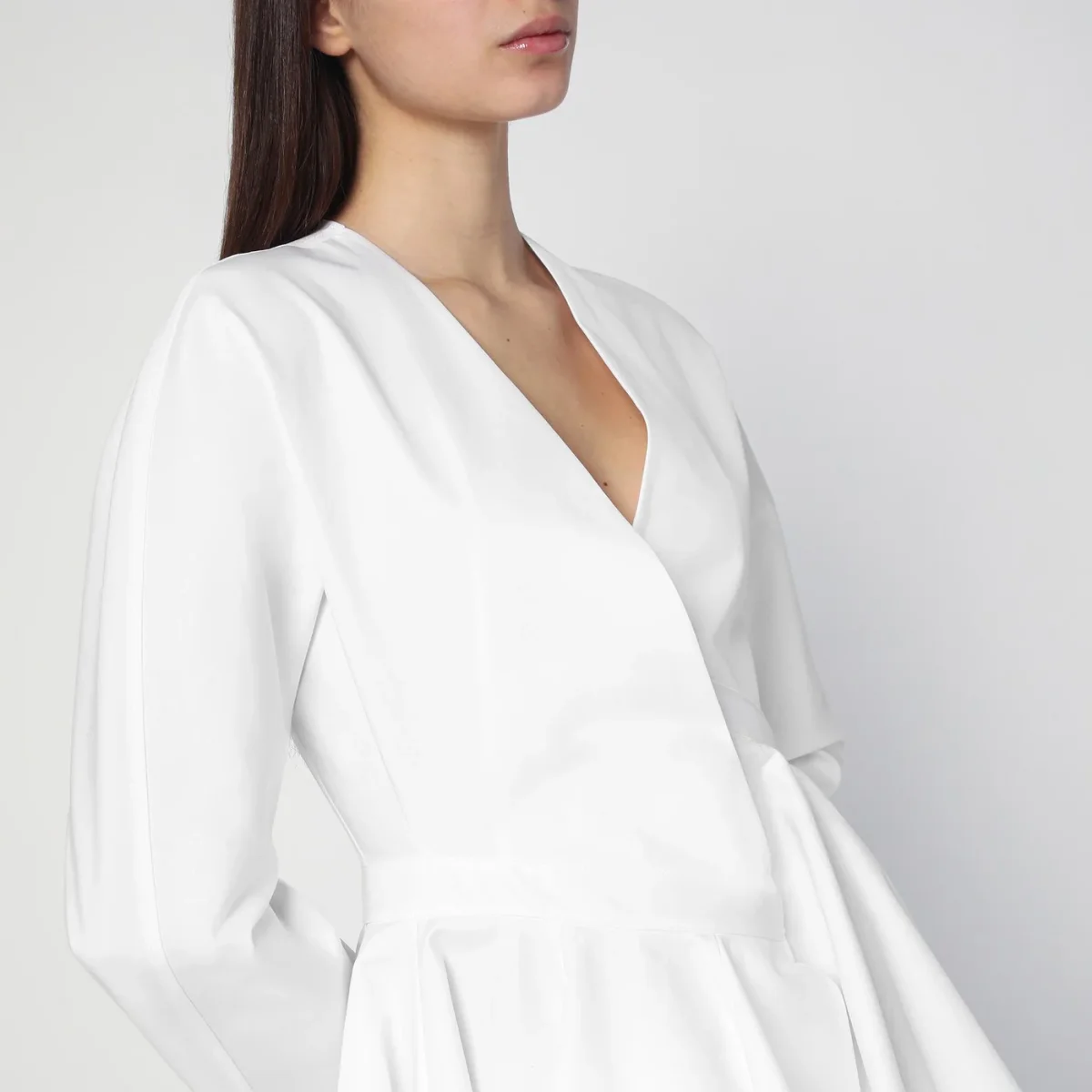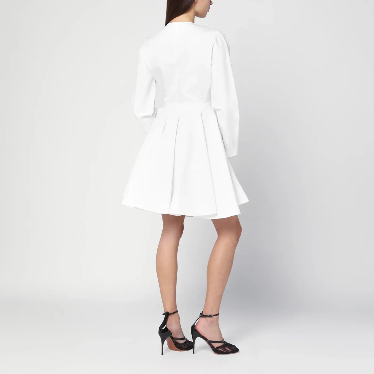Mini abito di Alaïa in popeline di cotone bianco, caratterizzato da scollo a V profondo, maniche lunghe, lunghezza media al ginocchio, cintura in vita integrata, gonna ampia e design a trapezio.