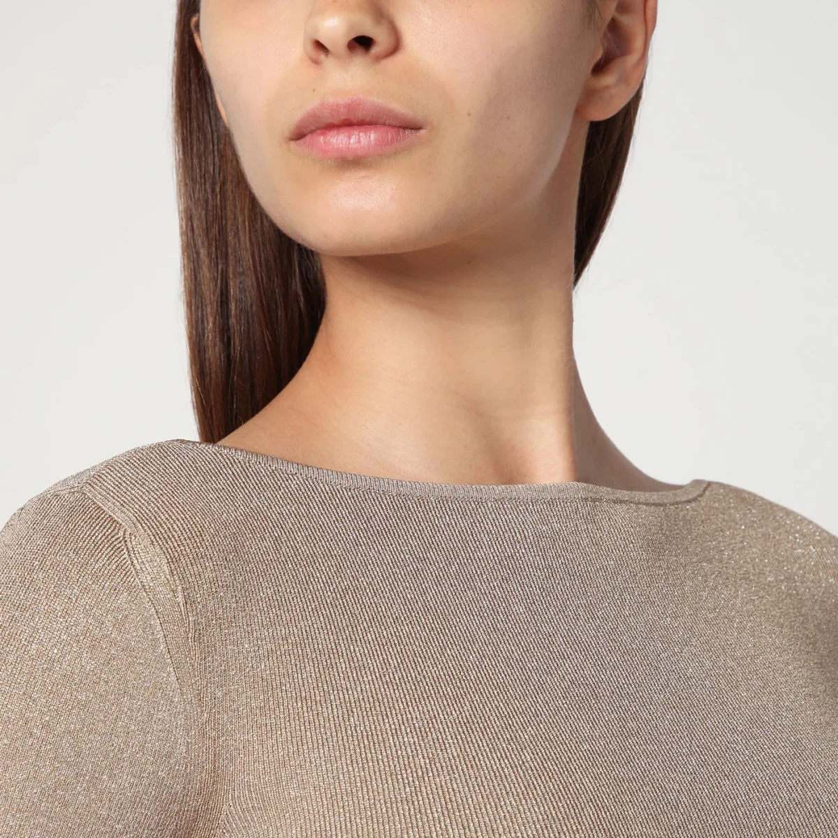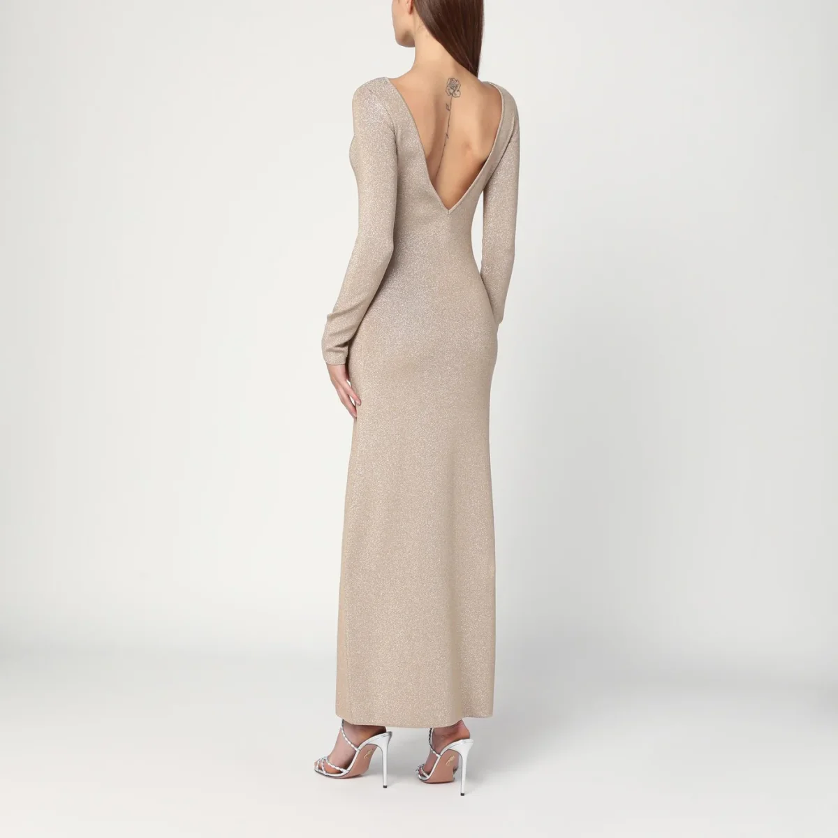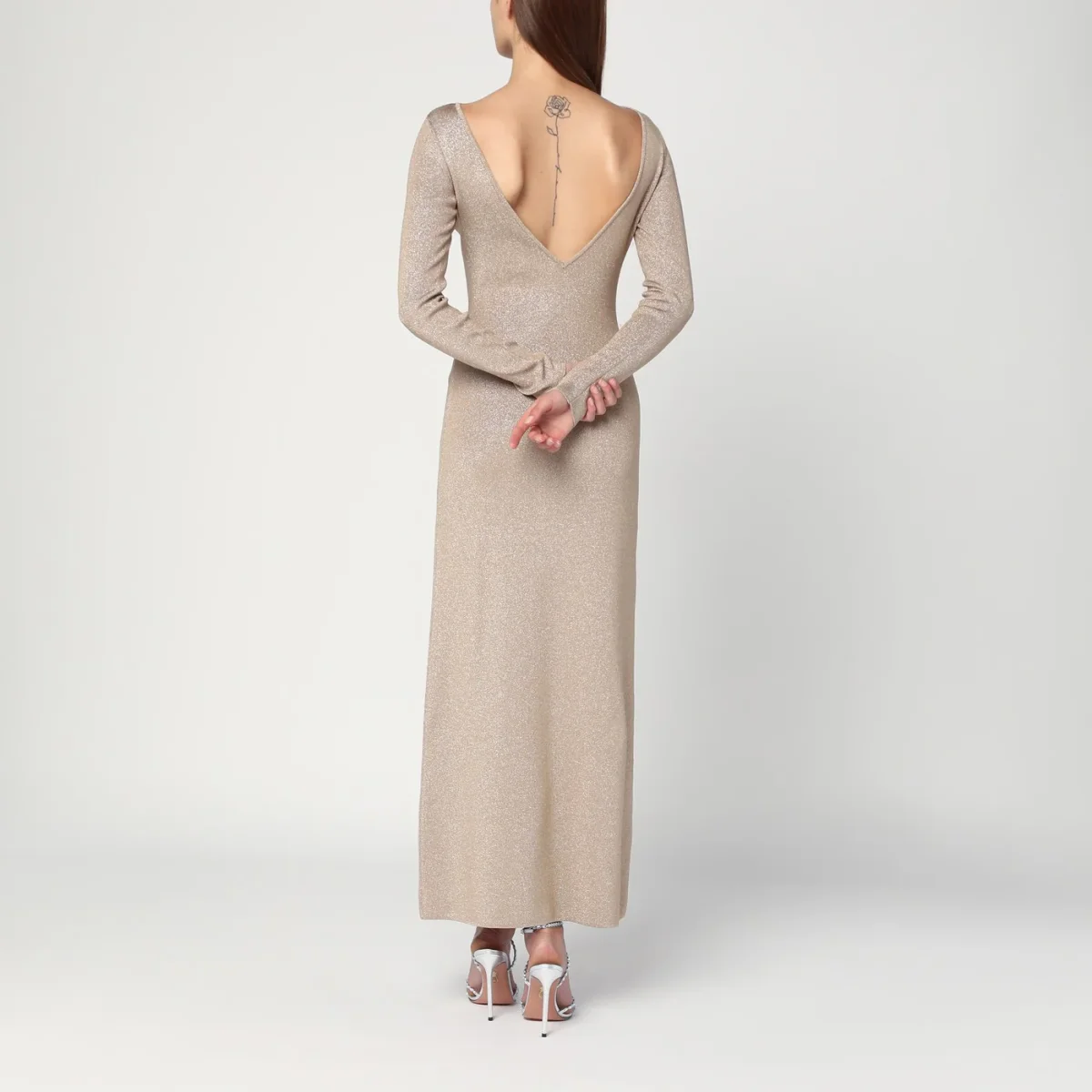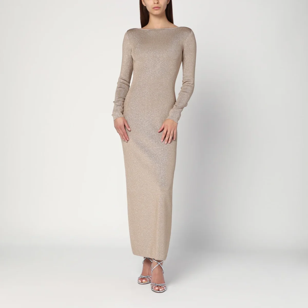 Abito lungo di Max Mara Pianoforte in filato di viscosa e lurex color pomice, caratterizzato da silhouette aderente, profondo scollo a V posteriore, maniche lunghe a giro e design sfoderato.