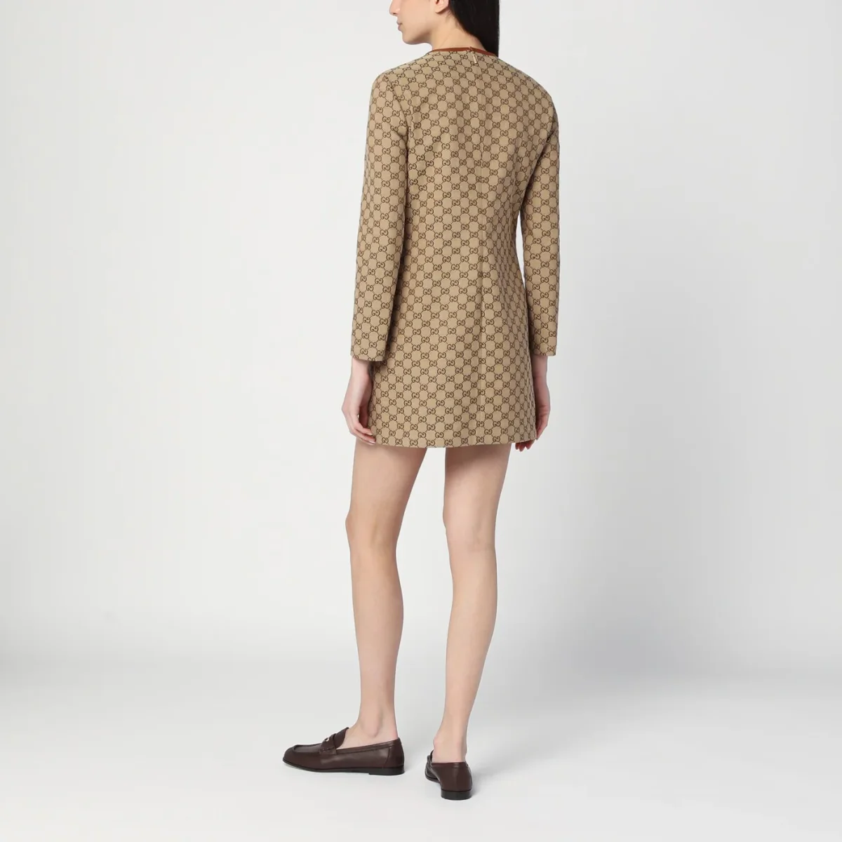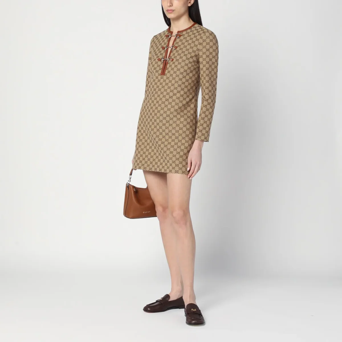 Abito girocollo di Gucci in tessuto GG color cammello, caratterizzato da finiture in pelle marrone, manica lunga, scollo con morsetti e chiusura con zip.