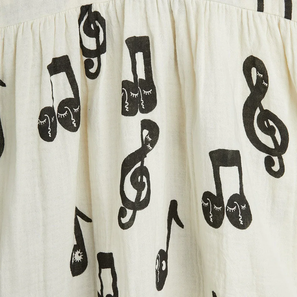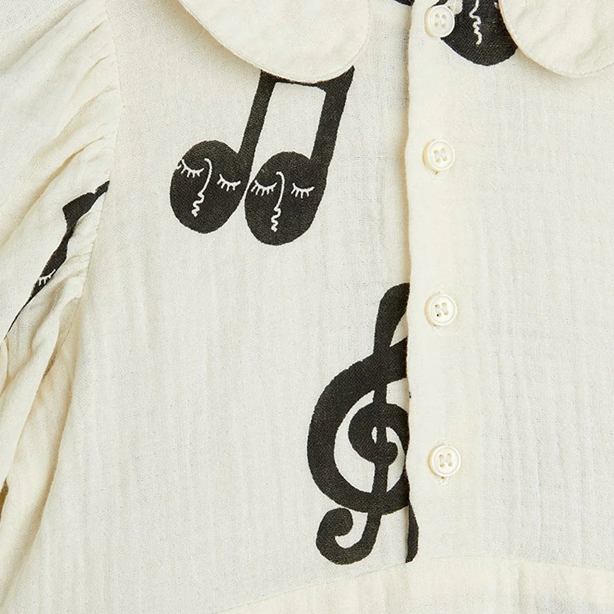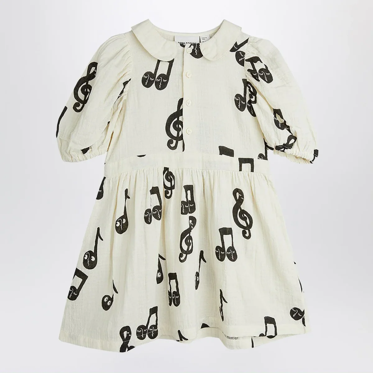 Abito di Mini Rodini in cotone bianco con note musicali a contrasto all over, caratterizzato da bottoncini sul davanti, maniche a sbuffo e colletto tondo.