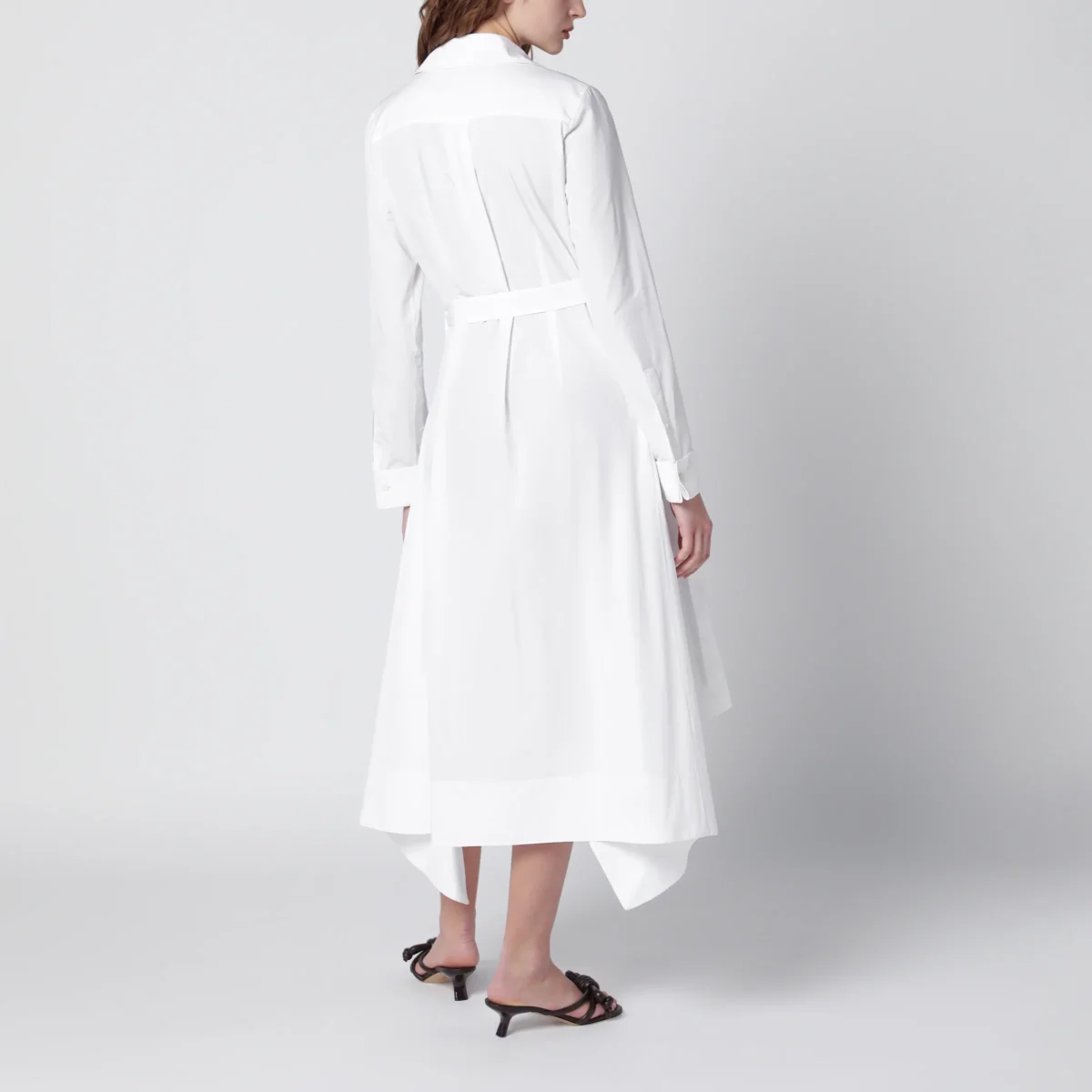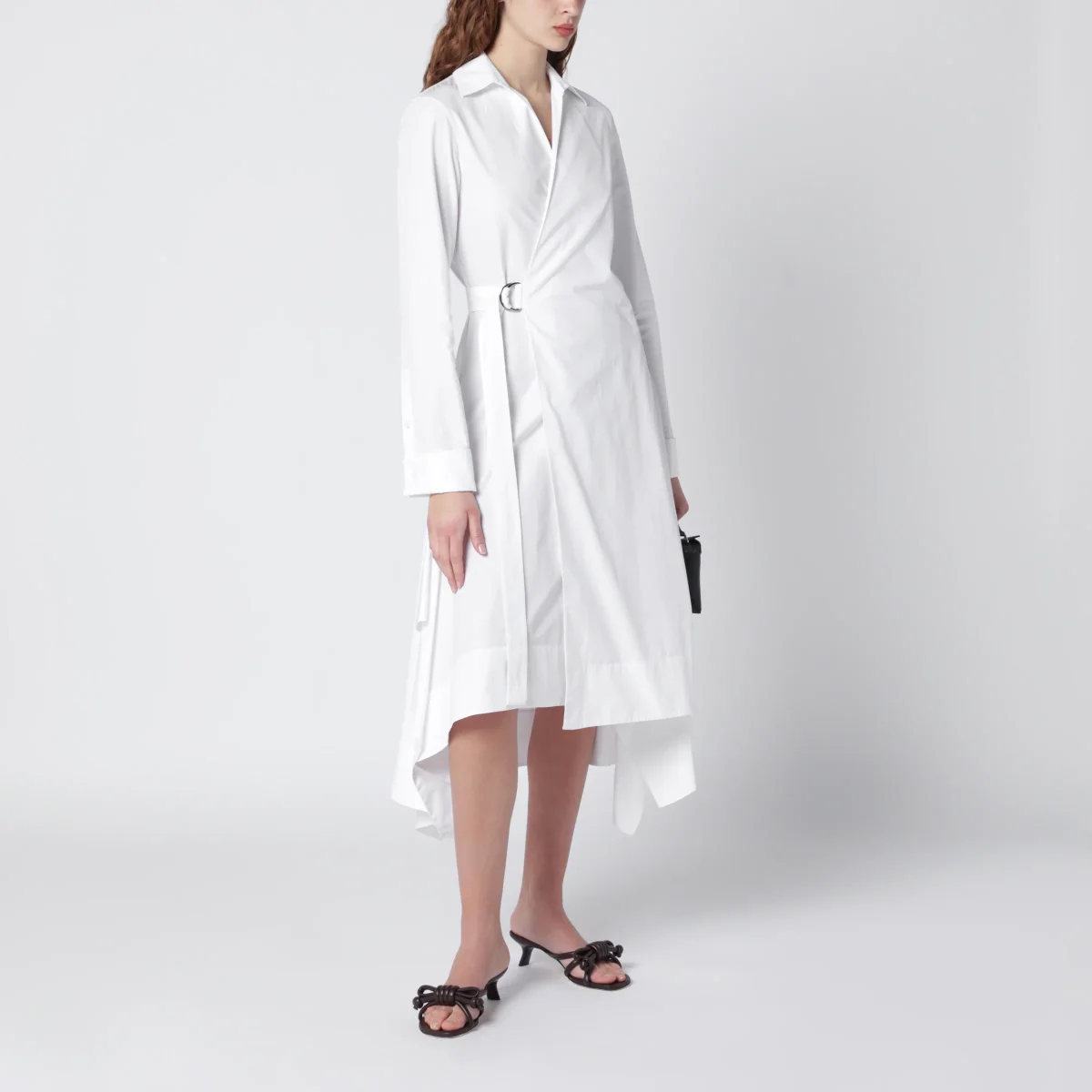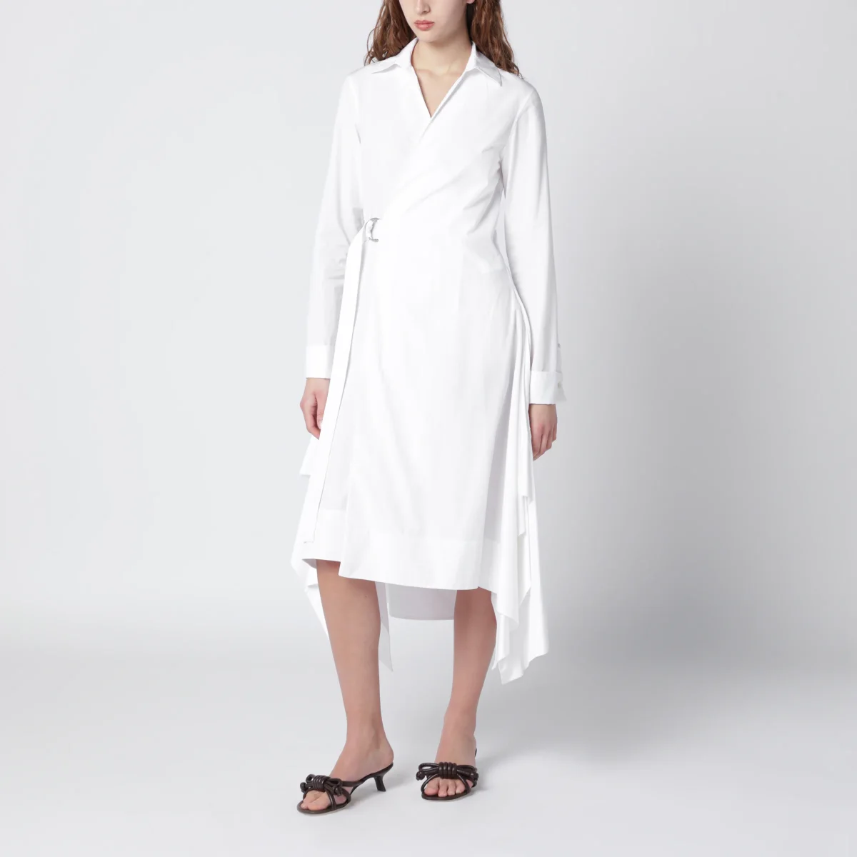 Abito drappeggiato in jersey di seta• Colore: Bianco• Silhouette asimmetrica drappeggiata• Apertura sul retro• Motivo Anagram in metallo oversize• Vestibilità regular e lunghezza media• Scollo all’americana• Spalline sottili