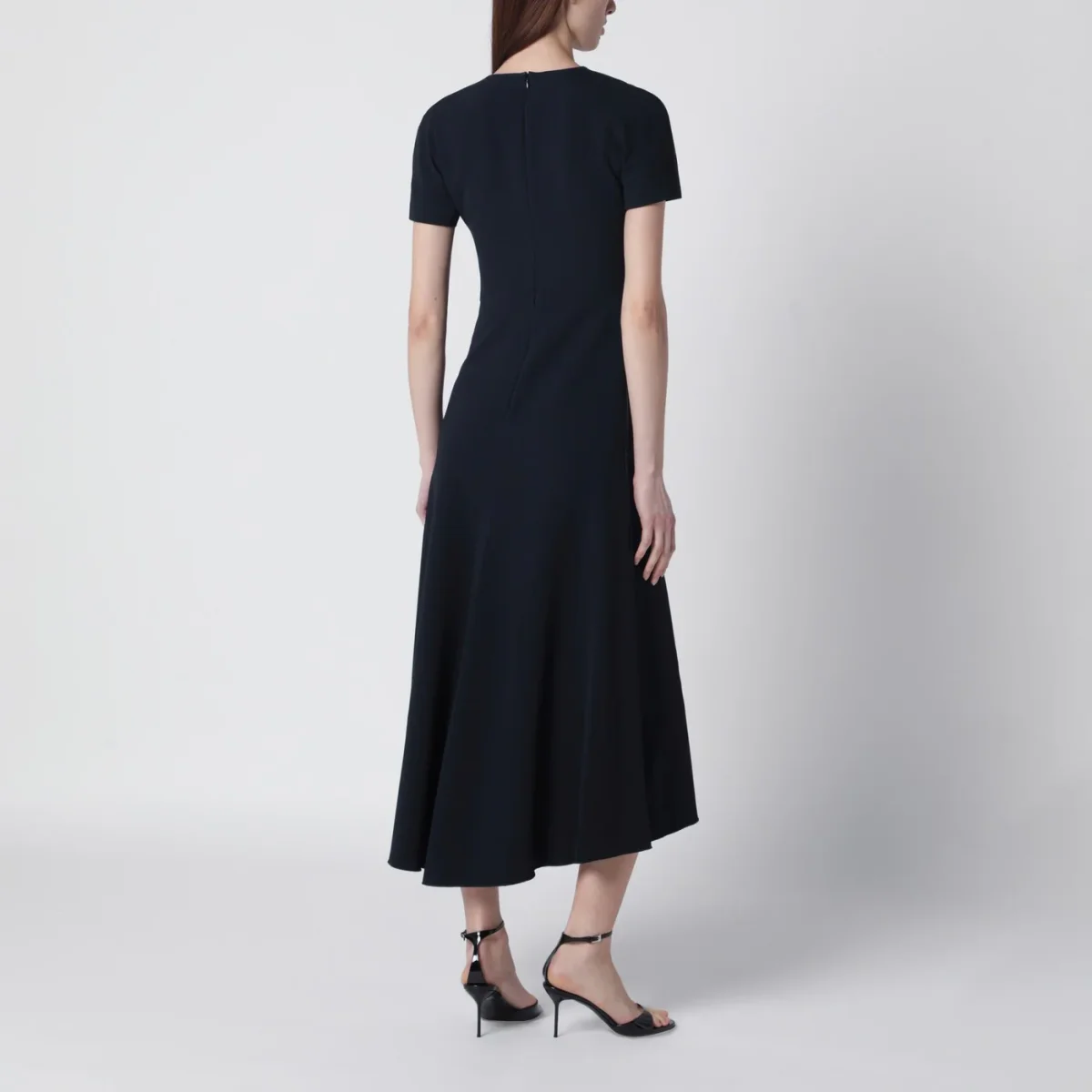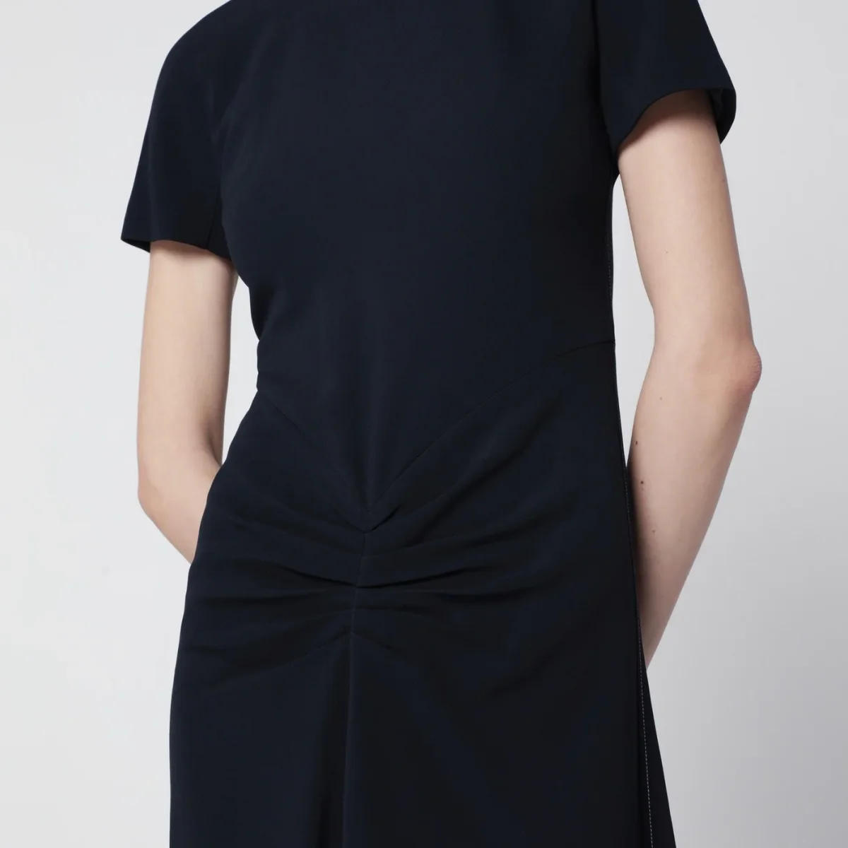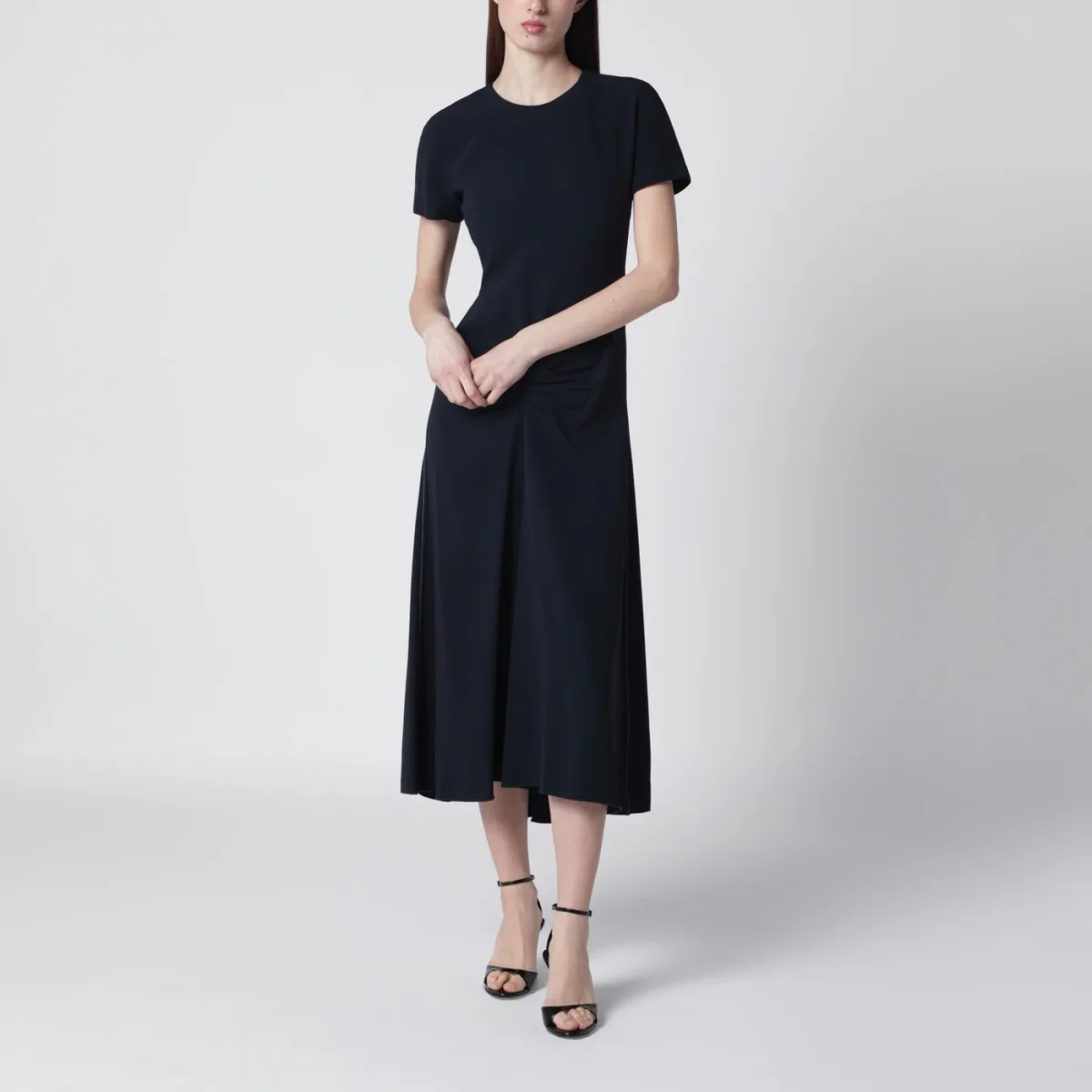 Abito midi girocollo di Victoria Beckham in jersey blu navy, caratterizzato da maniche corte, chiusura posteriore con zip e vita con dettaglio arricciato sul davanti.
