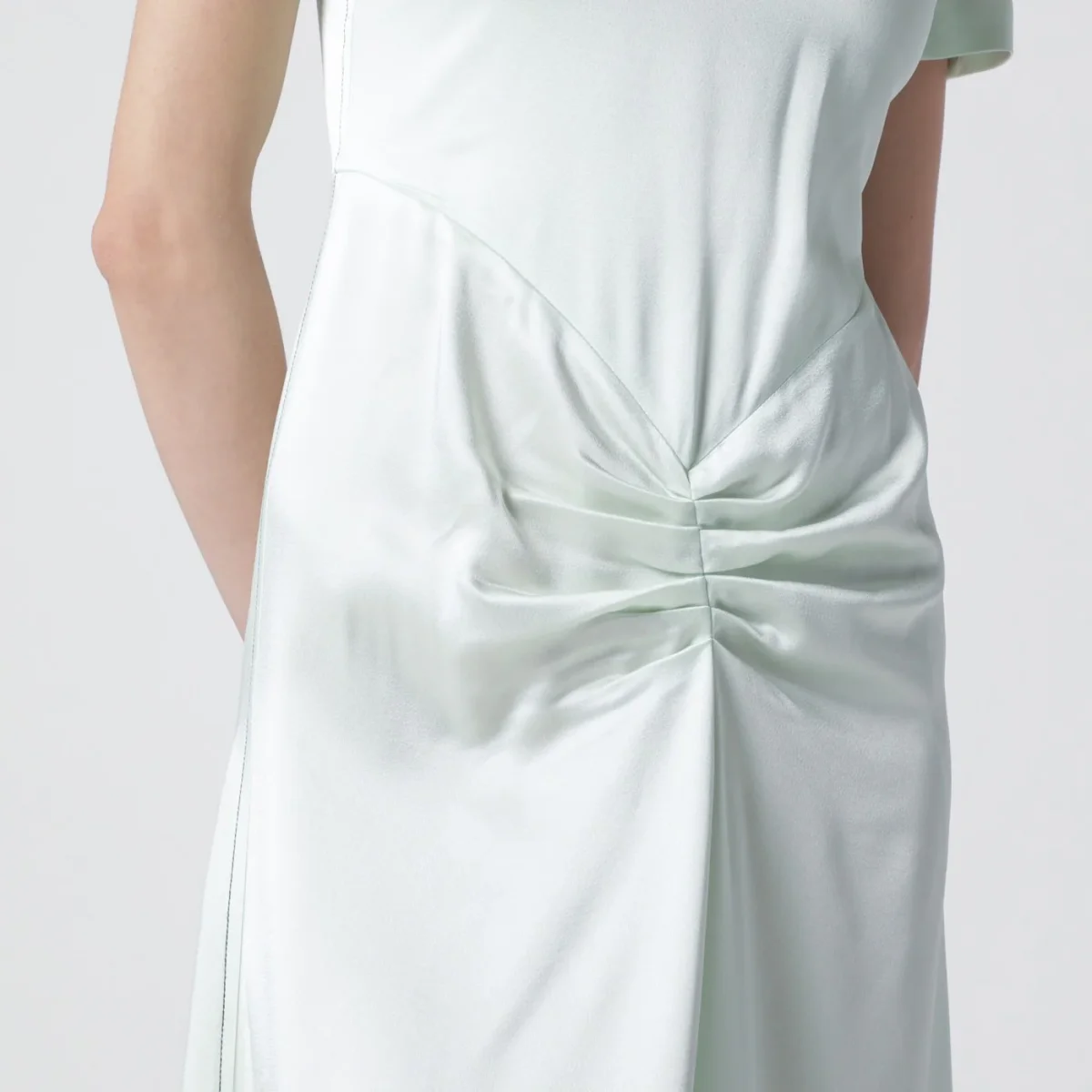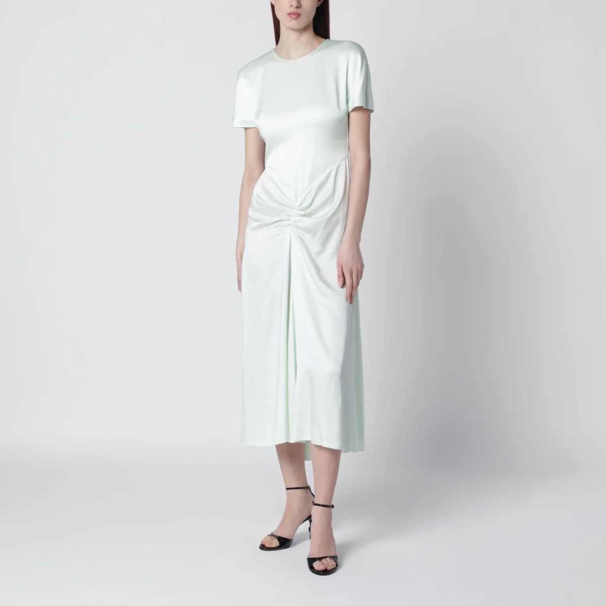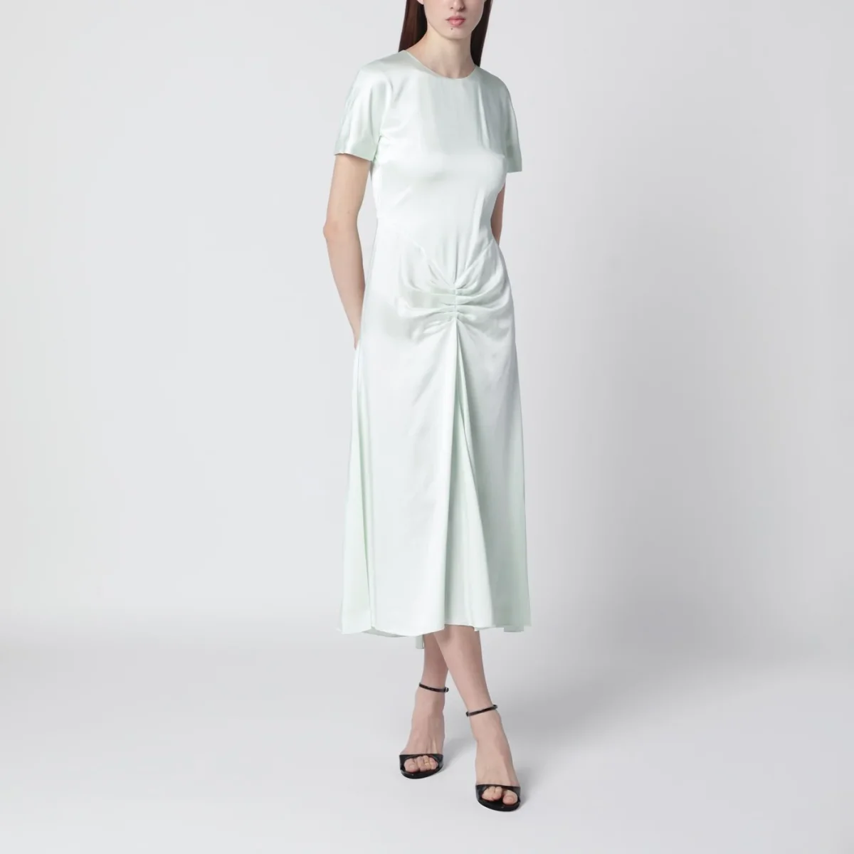 Abito midi girocollo di Victoria Beckham in jersey color aloe, caratterizzato da maniche corte, chiusura posteriore con zip e vita con dettaglio arricciato sul davanti.
