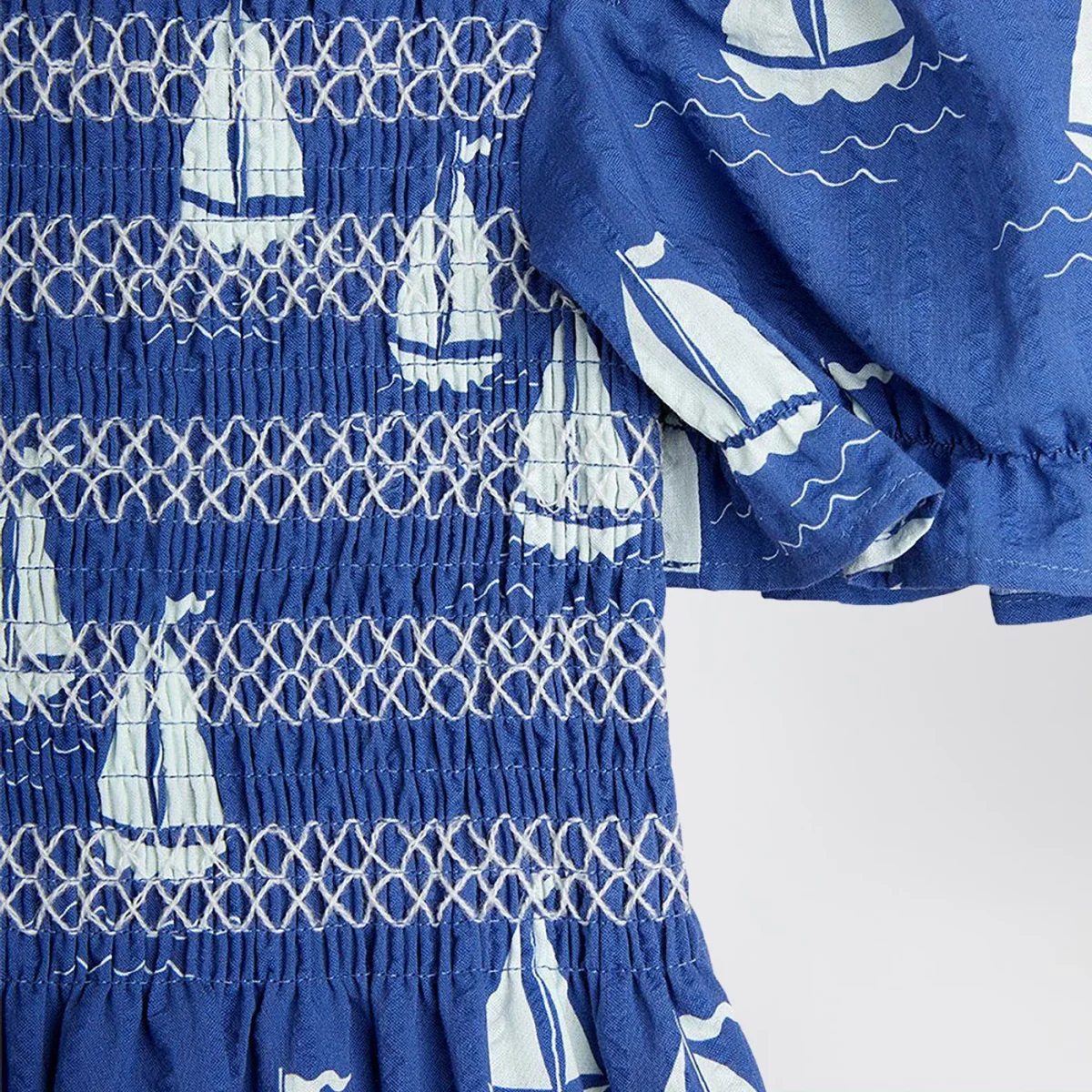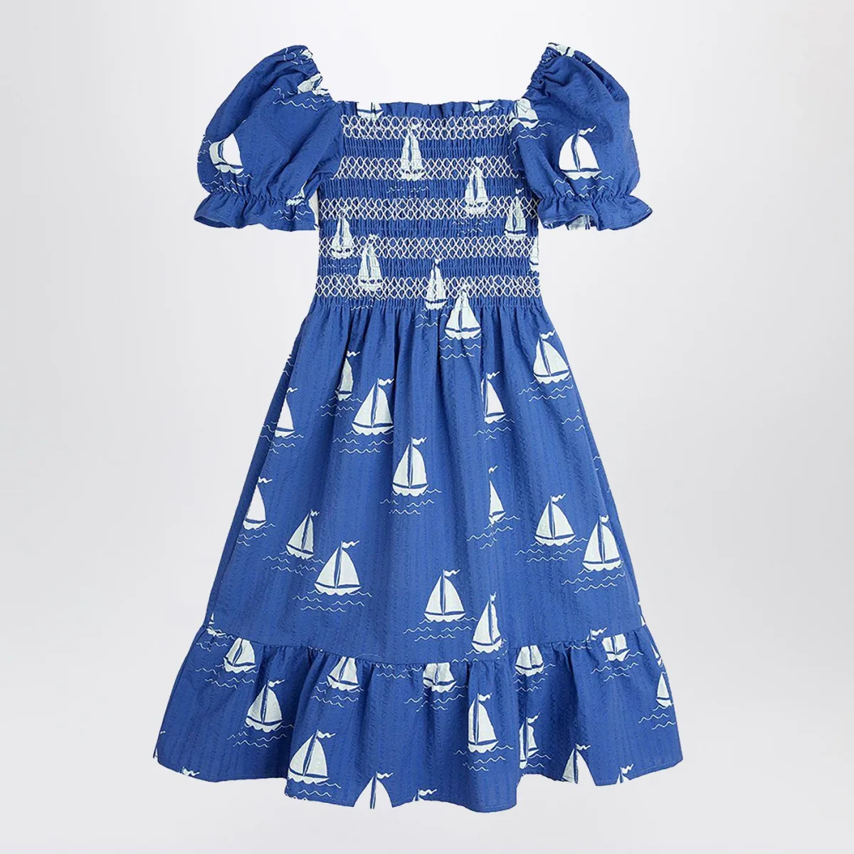 Abito di Mini Rodini in cotone blu chiaro, caratterizzato da drappeggio elastico sul petto, maniche corte a sbuffo, gonna lunga con volant e barche a vela a contrasto all over.