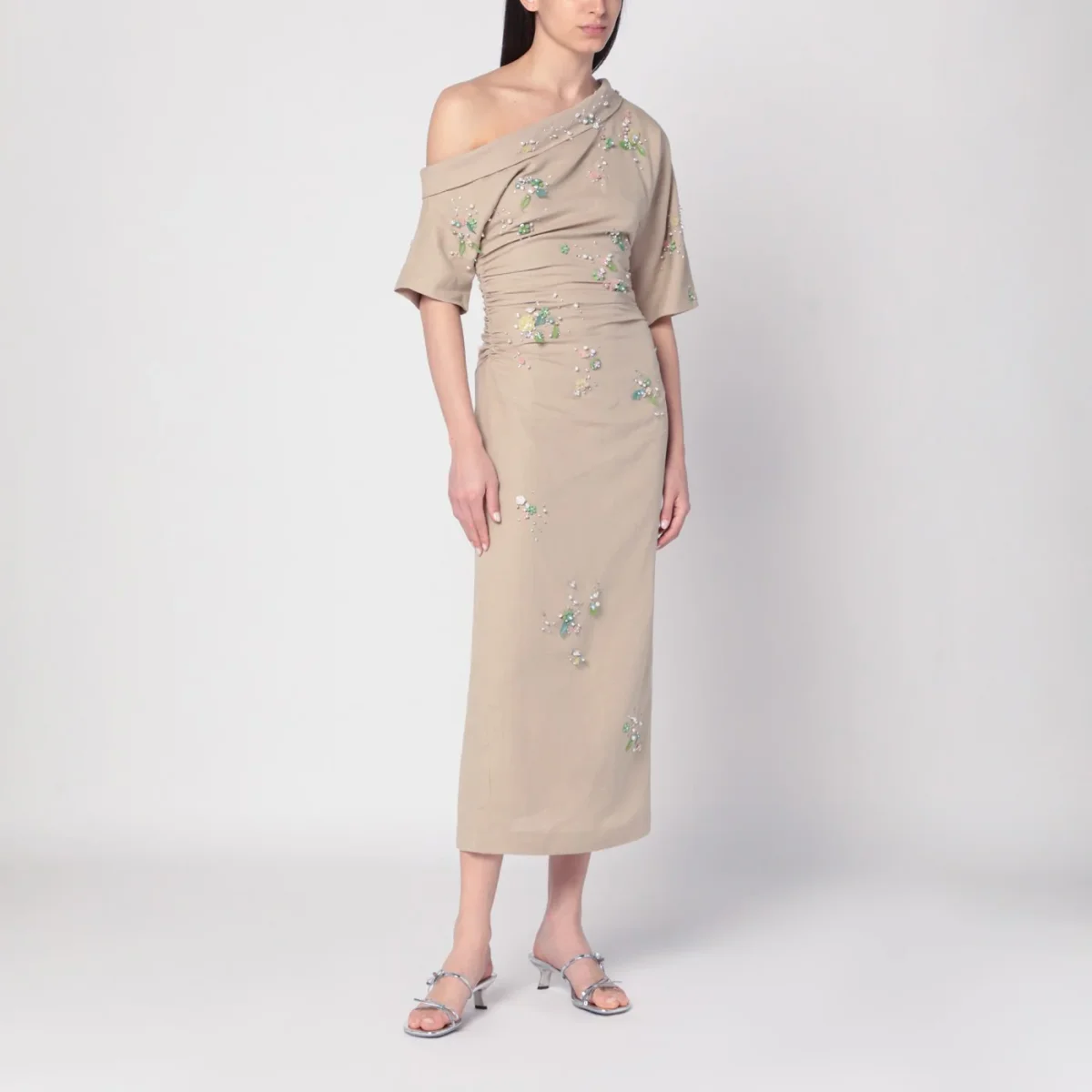 Abito midi di Bernadette in misto cotone e lino beige, caratterizzato da design con spalla scoperta, vita accentuata, ricami con perline all over e spacco posteriore.