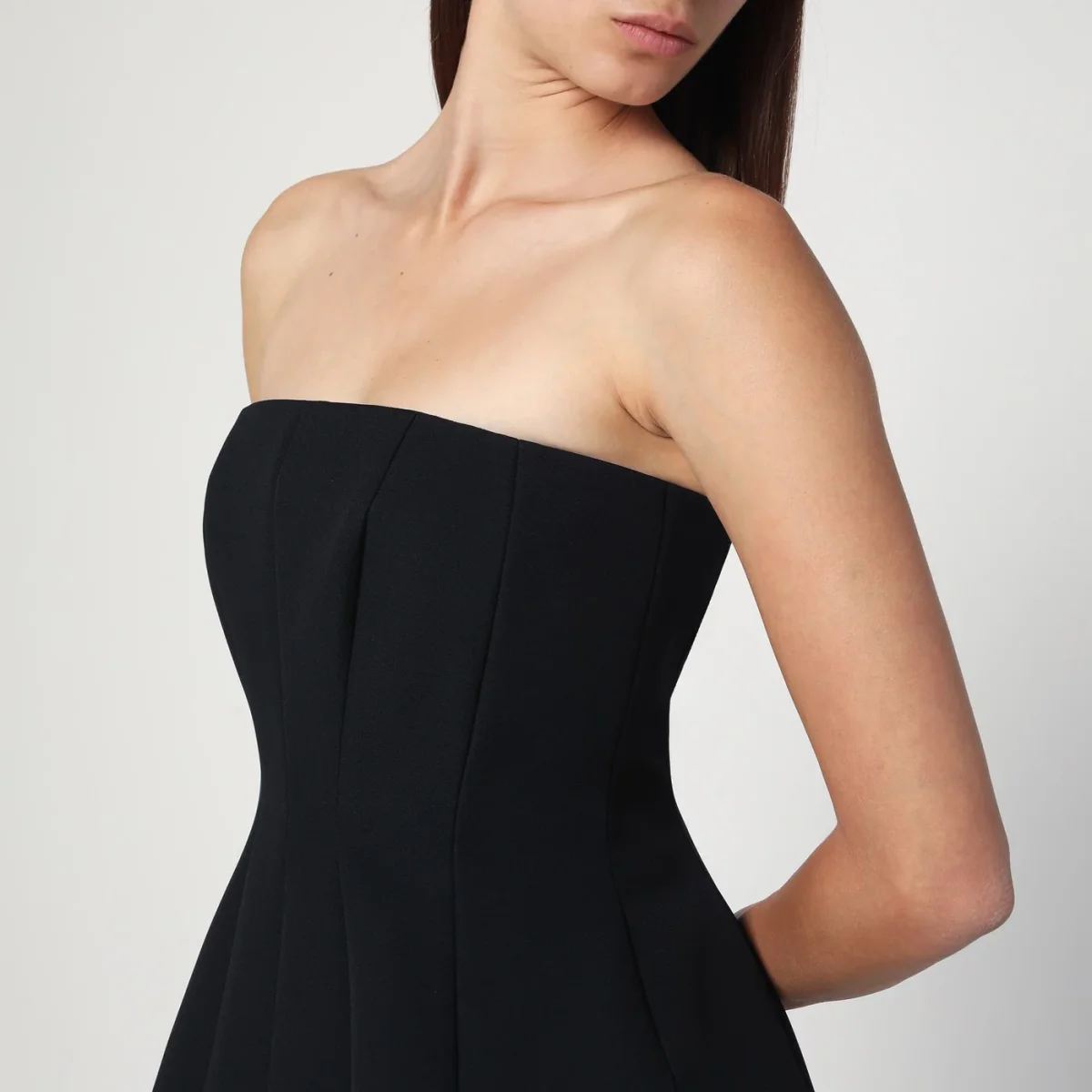 Abito corto bustier di Max Mara Pianoforte in sablé stretch nero, caratterizzato d silhouette sagomata con motivo di tagli verticali aderente in vita, chiusura con zip sul retro, due tasche inserite nei fianchi e sottogonna rimovibile.