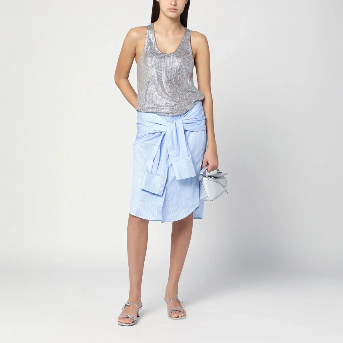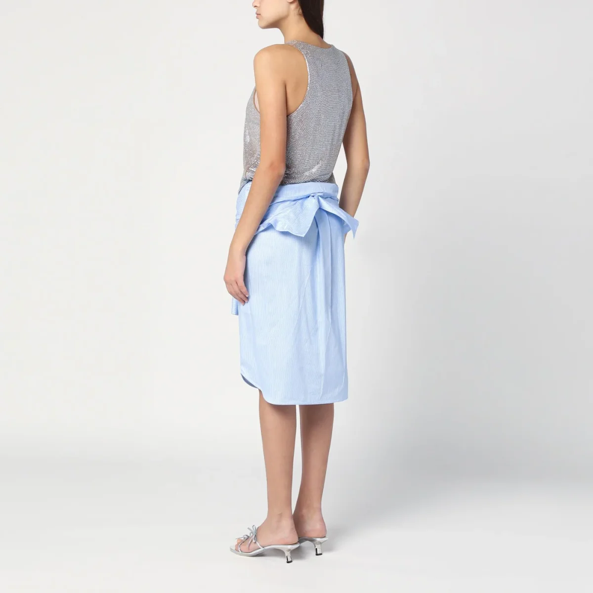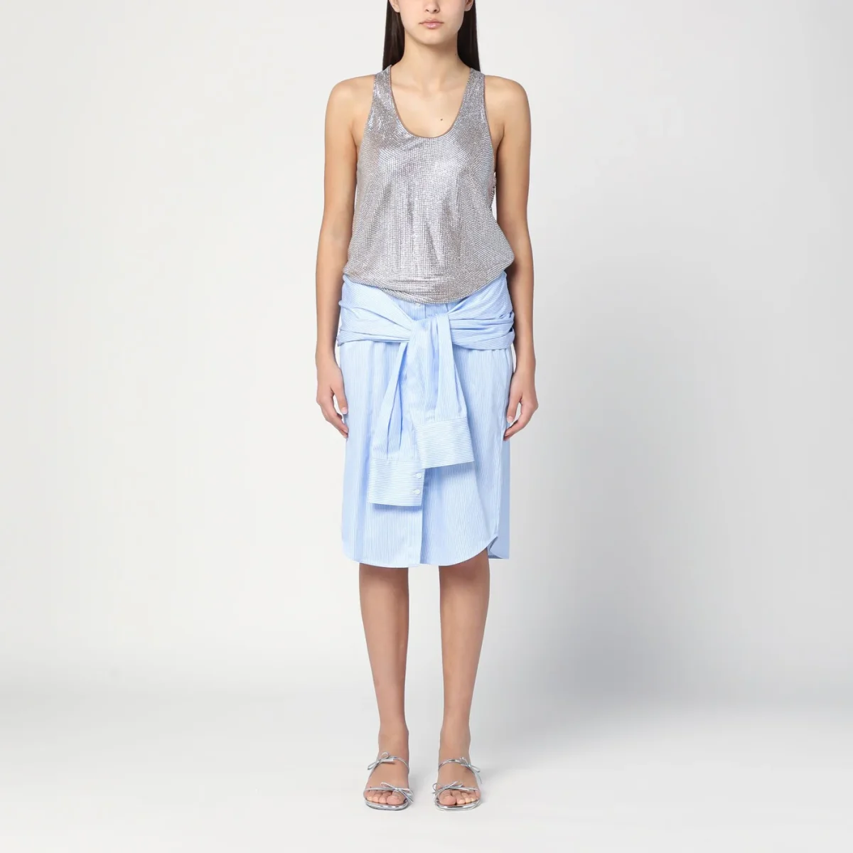Abito smanicato di Giuseppe di Morabito caratterizzato da parte superiore smanicata con strass all over, parte inferiore con design a camicia incrociata in cotone azzurra, ampio scollo e chiusura laterale con zip.