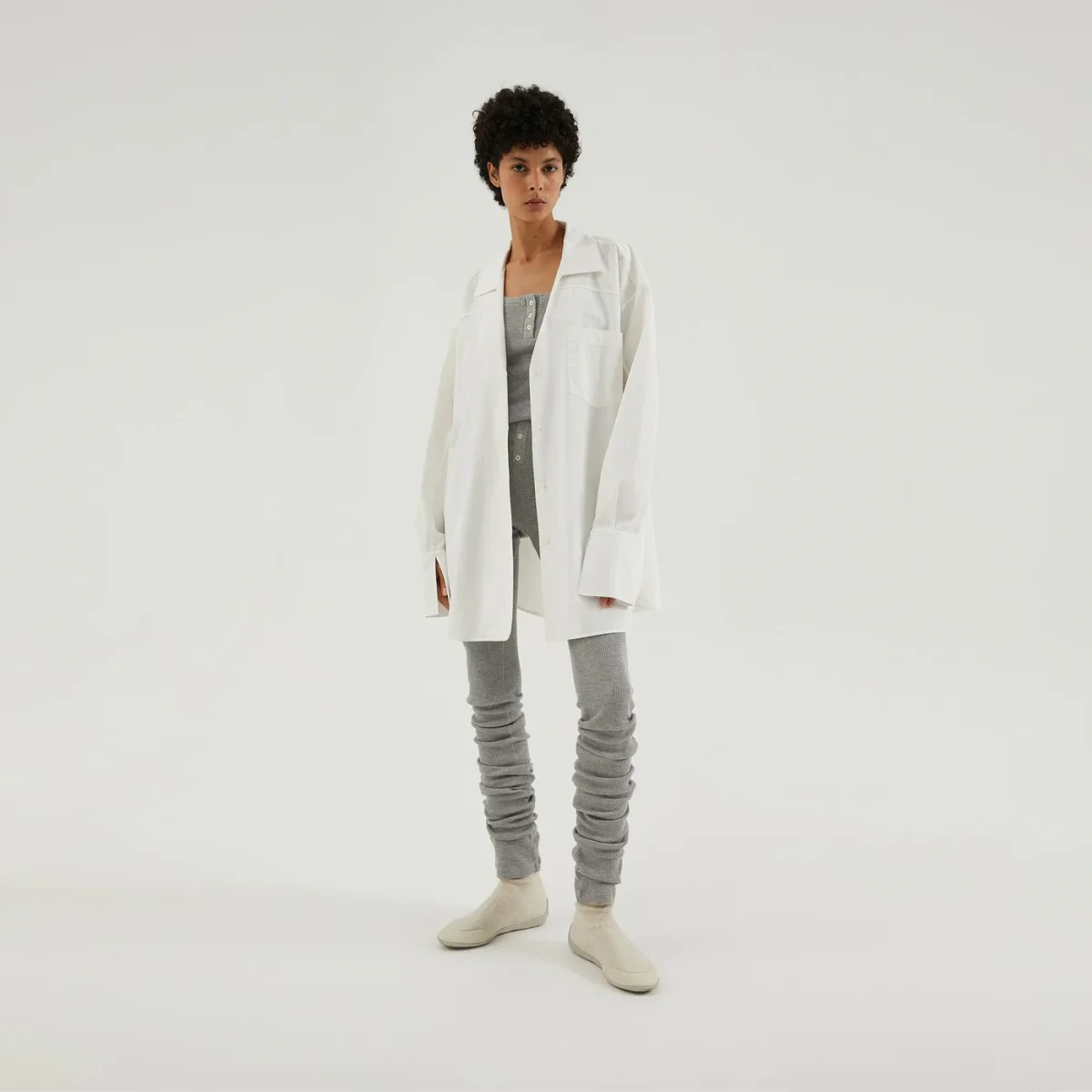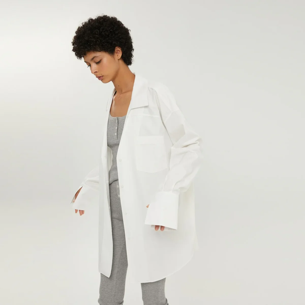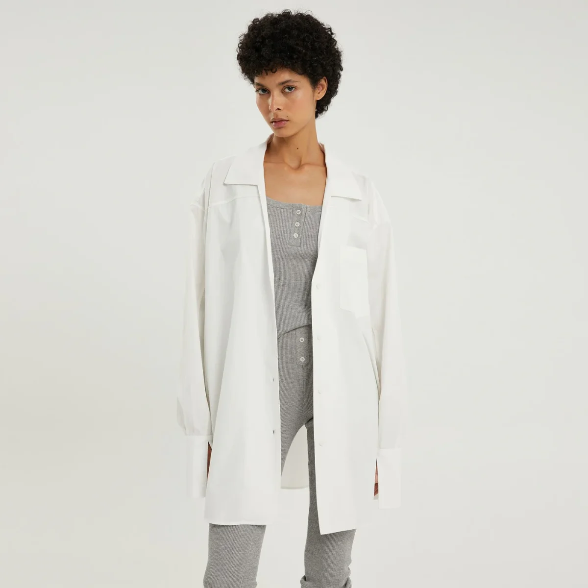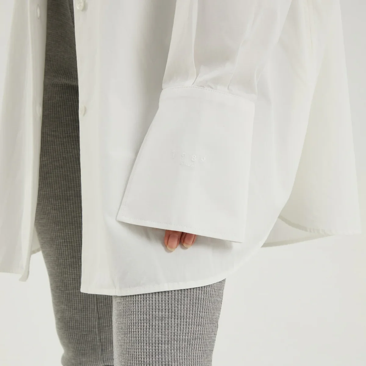 Abito camicia oversize in popeline di 1989 Studio con colletto aperto, scollo a V, chiusura frontale con bottoni, tasca sul petto, polsini lunghi con bottoni e orlo curvo.
