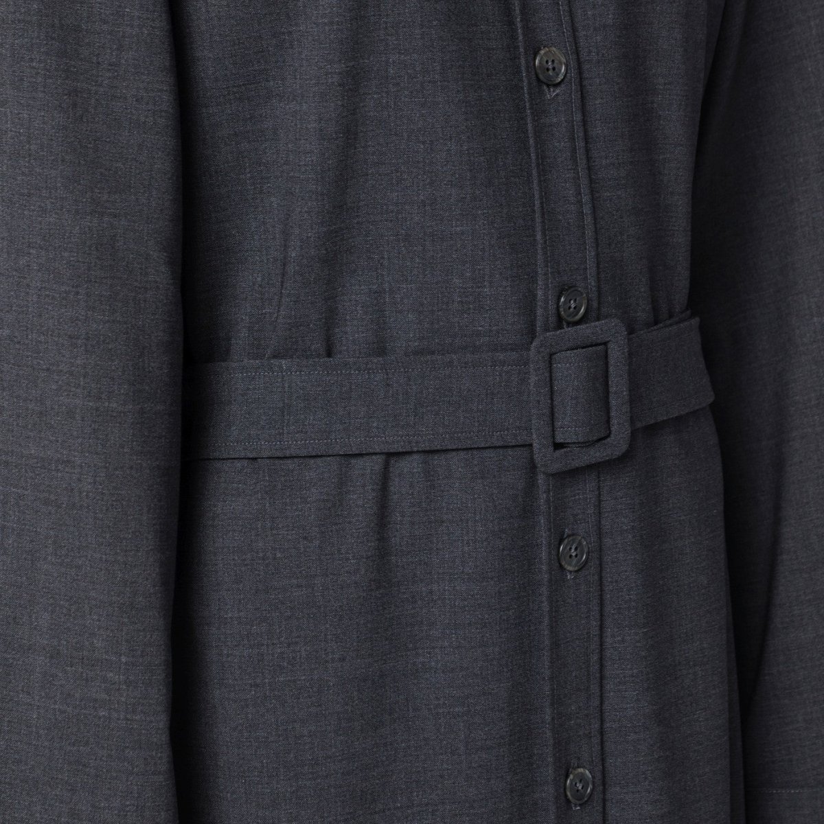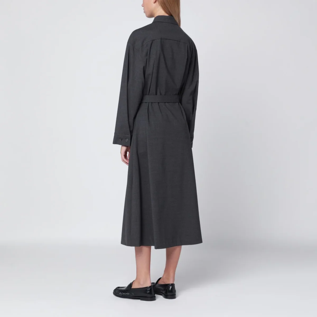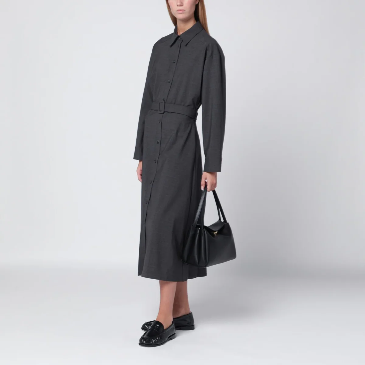 Abito chemisier midi di P.A.R.O.S.H. in lana vergine grigio antracite, caratterizzato da abbottonatura frontale, maniche lunghe con polsi con bottoni, colletto classico e cintura in vita regolabile.