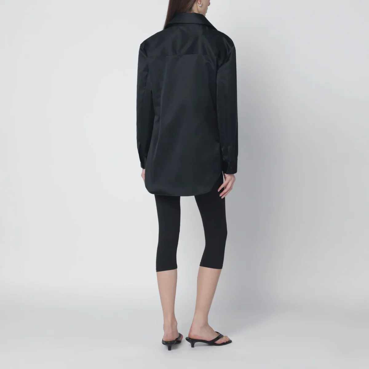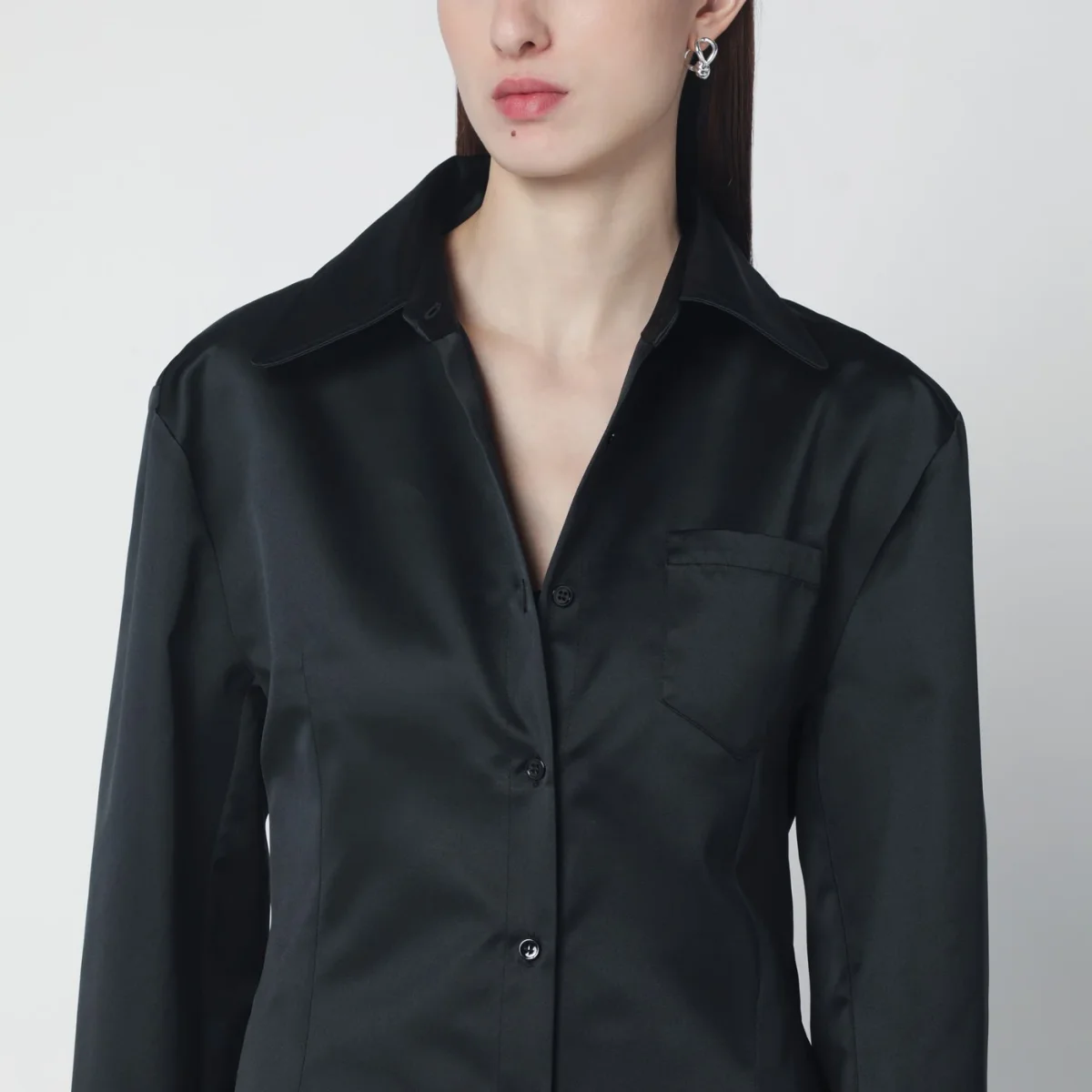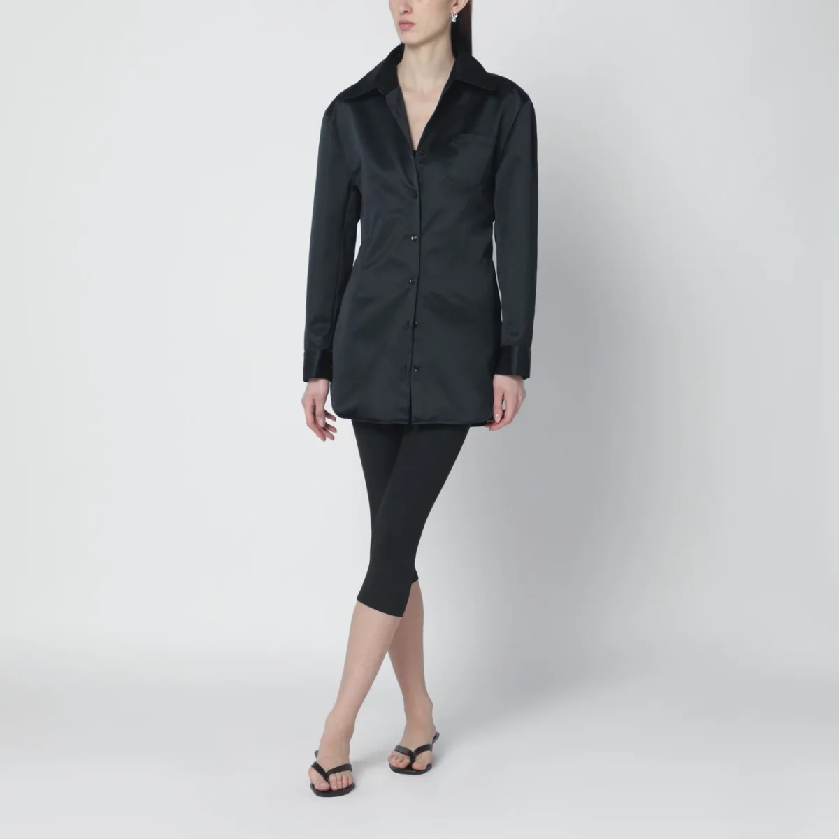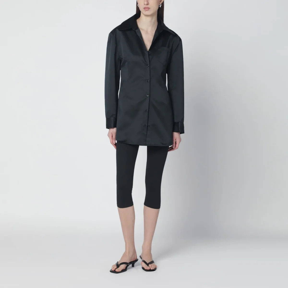 Abito chemisier in raso lucido nero•colletto a punta• maniche lunghe con polsini con bottoni• una tasca applicata sul petto• chiusura frontale con bottoni• design più aderente in vita• due tasche laterali• orlo curvo