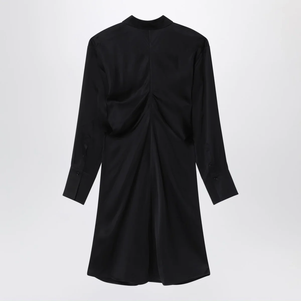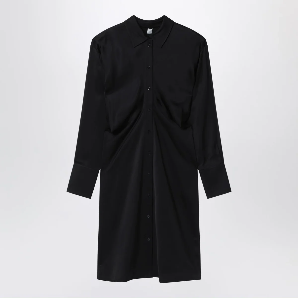 Abito midi di TOTEME in raso nero, con collo a punta, abbottonatura frontale e polsini con bottoni.