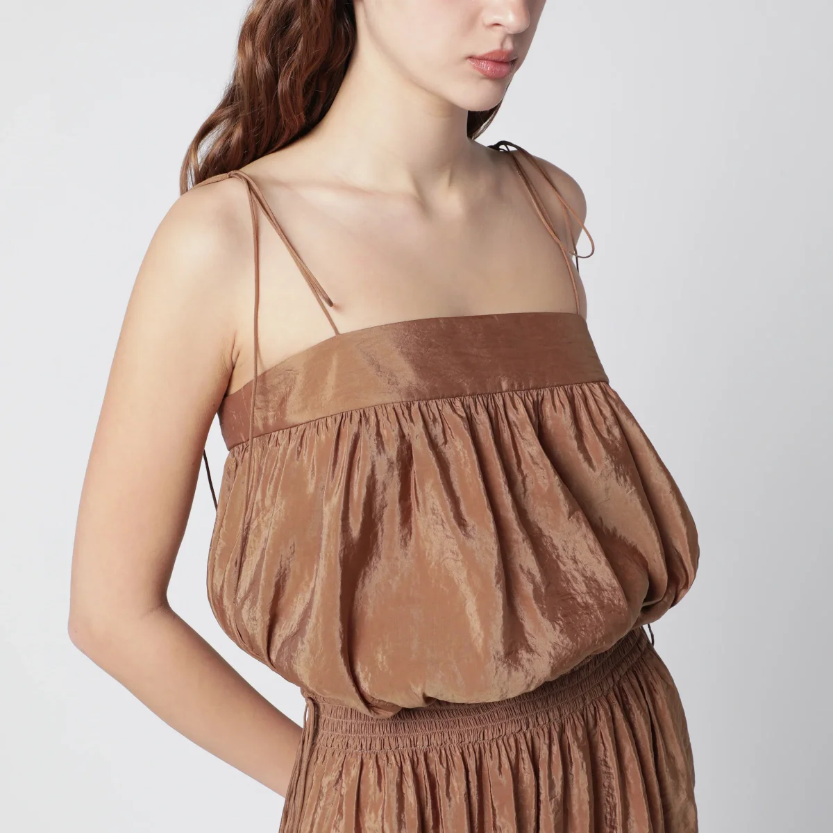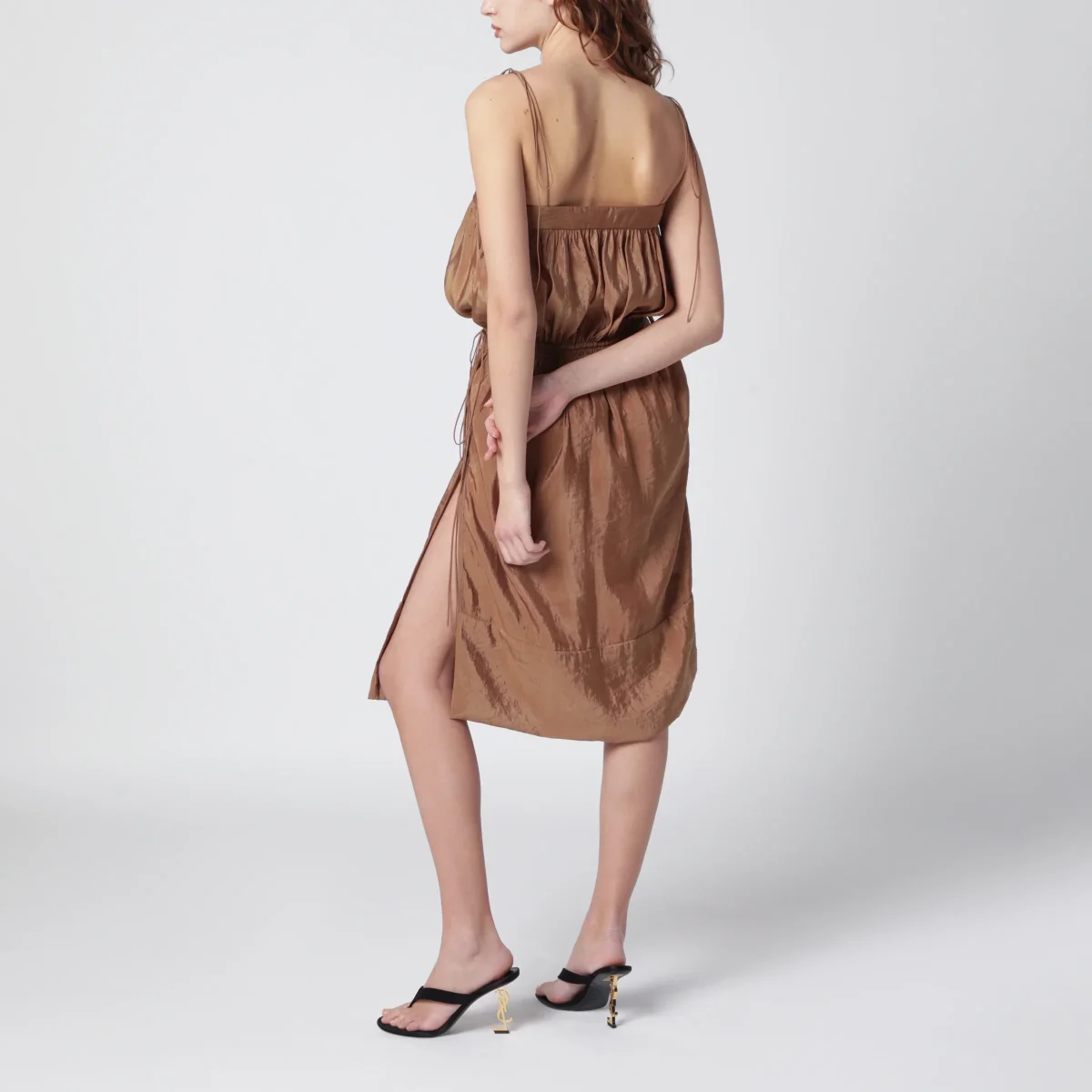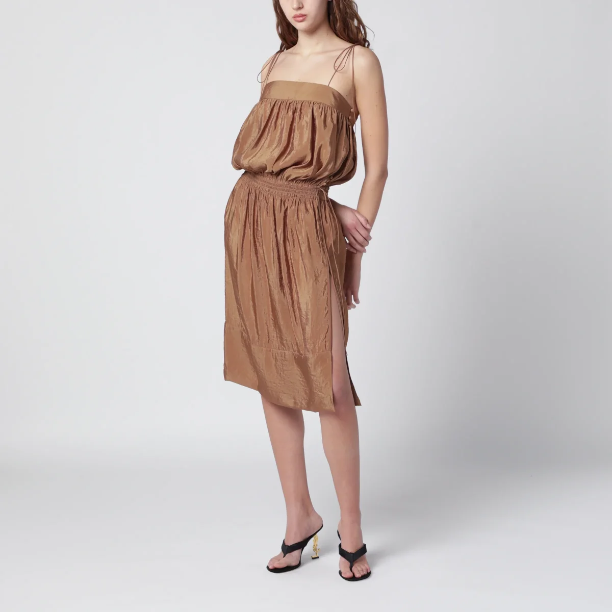 Abito di Saint Laurent in misto nylon• Colore: Caramello• Spalline sottili• Spacco laterale• Vita elasticizzata• Bottoncini laterali