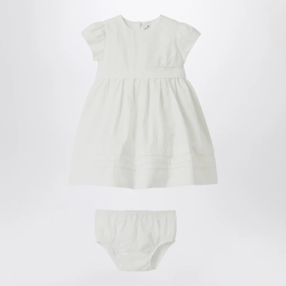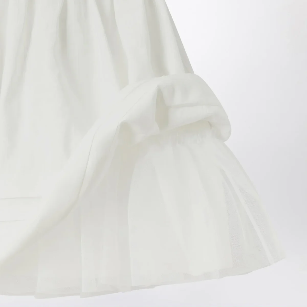 Abito girocollo de Il Gufo in popeline di viscosa bianco, caratterizzato da maniche corte a sbuffo, ampia gonna con motivo orizzontale sul fondo stile plissé, sottoveste interna in cotone con balza in tulle, chiusura con zip sul retro e culotte elastica.