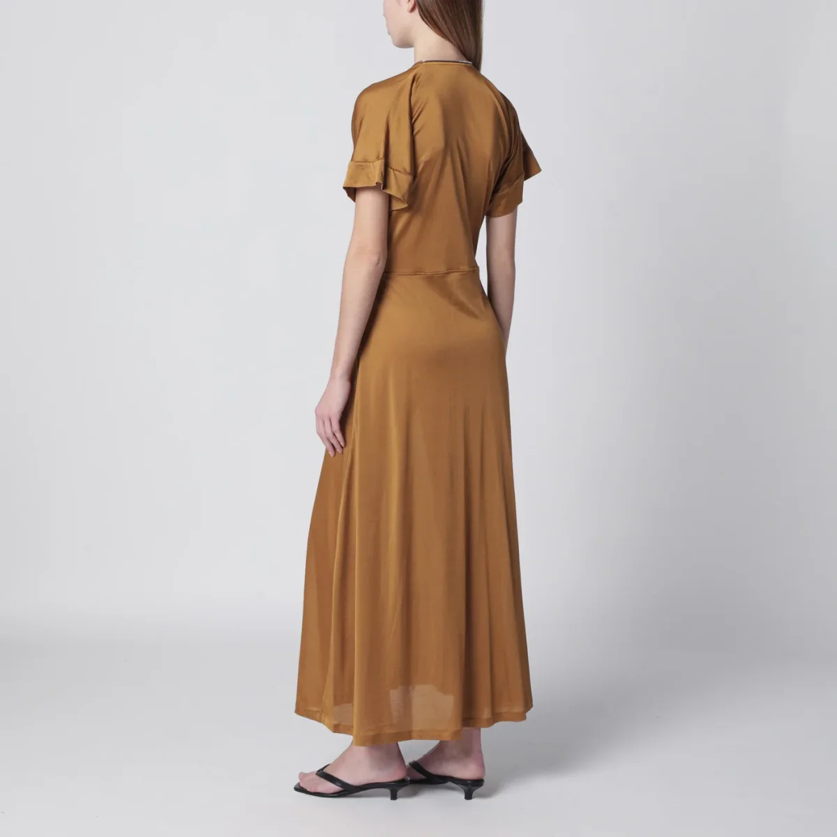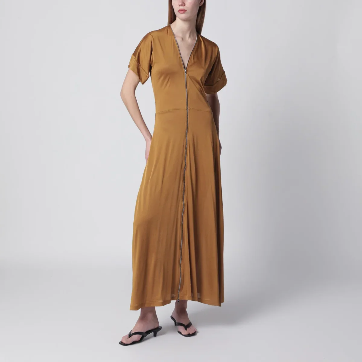 Abito lungo di Lemaire in jersey di cotone e viscosa marrone cannella• chiusura frontale con doppia zip• maniche corte svasate• taglio aderente• scollo a V