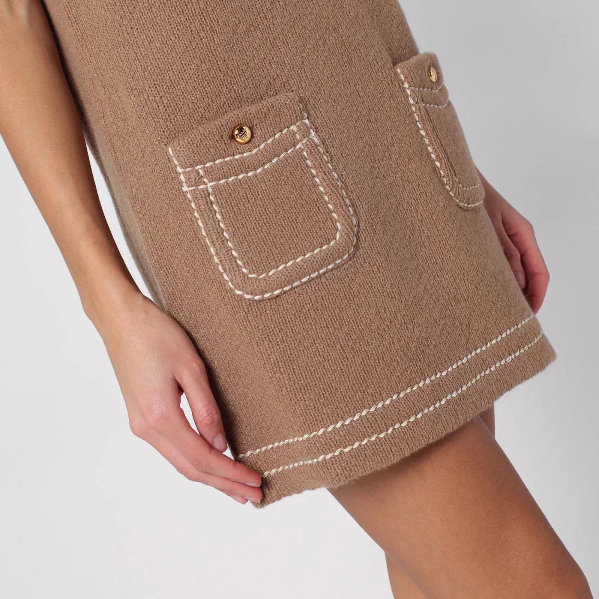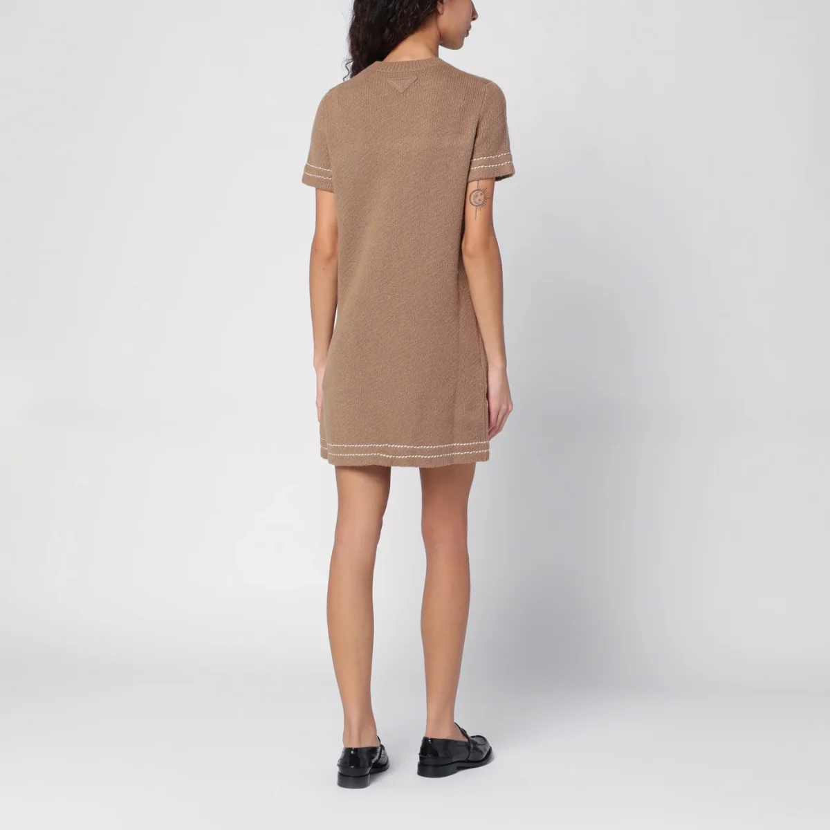 Abito corto di Prada in cashmere color cammello, caratterizzato da design girocollo a costine, maniche corte, tasche frontali con bottoni e dettagli con cutire a contrasto.