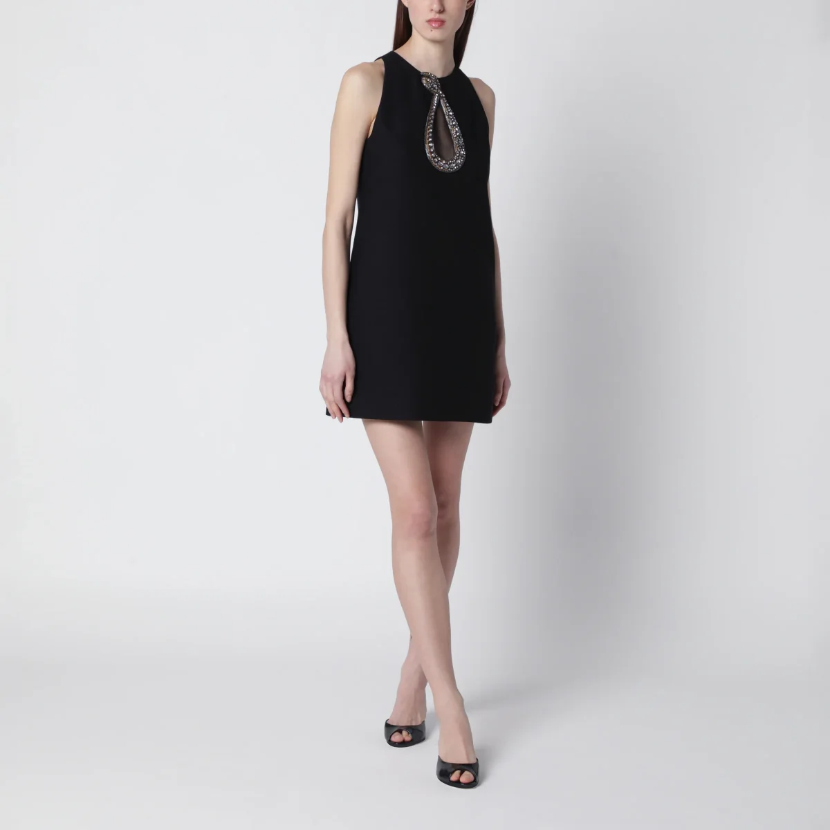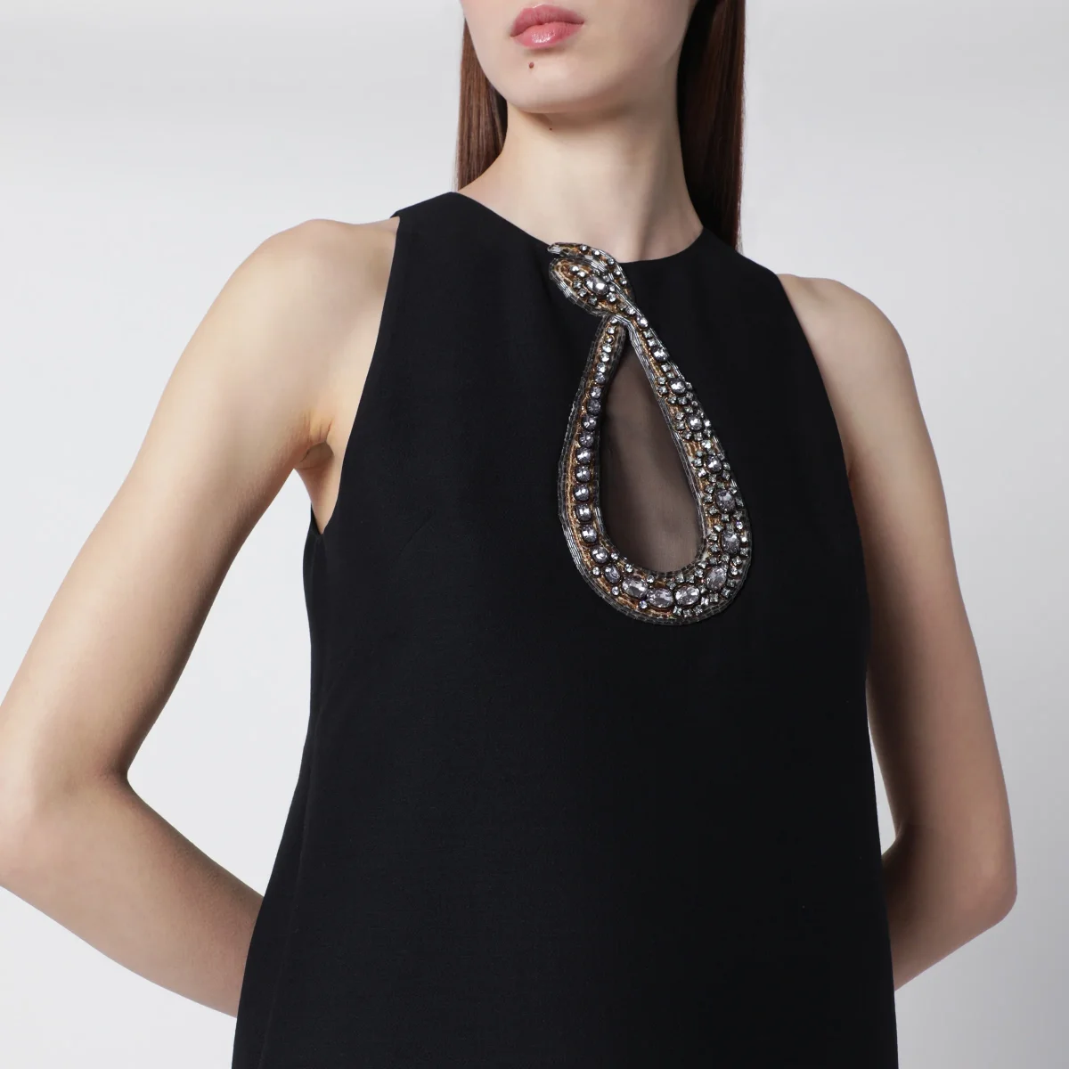 Abito corto di Valentino Garavani in crepe couture• Colore: Nero• Ricamo a serpente di strass• Inserto a goccia in chiffon sul davanti• Dettaglio tasche• Chiusura posteriore con zip e gancino