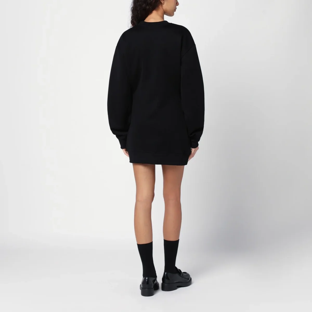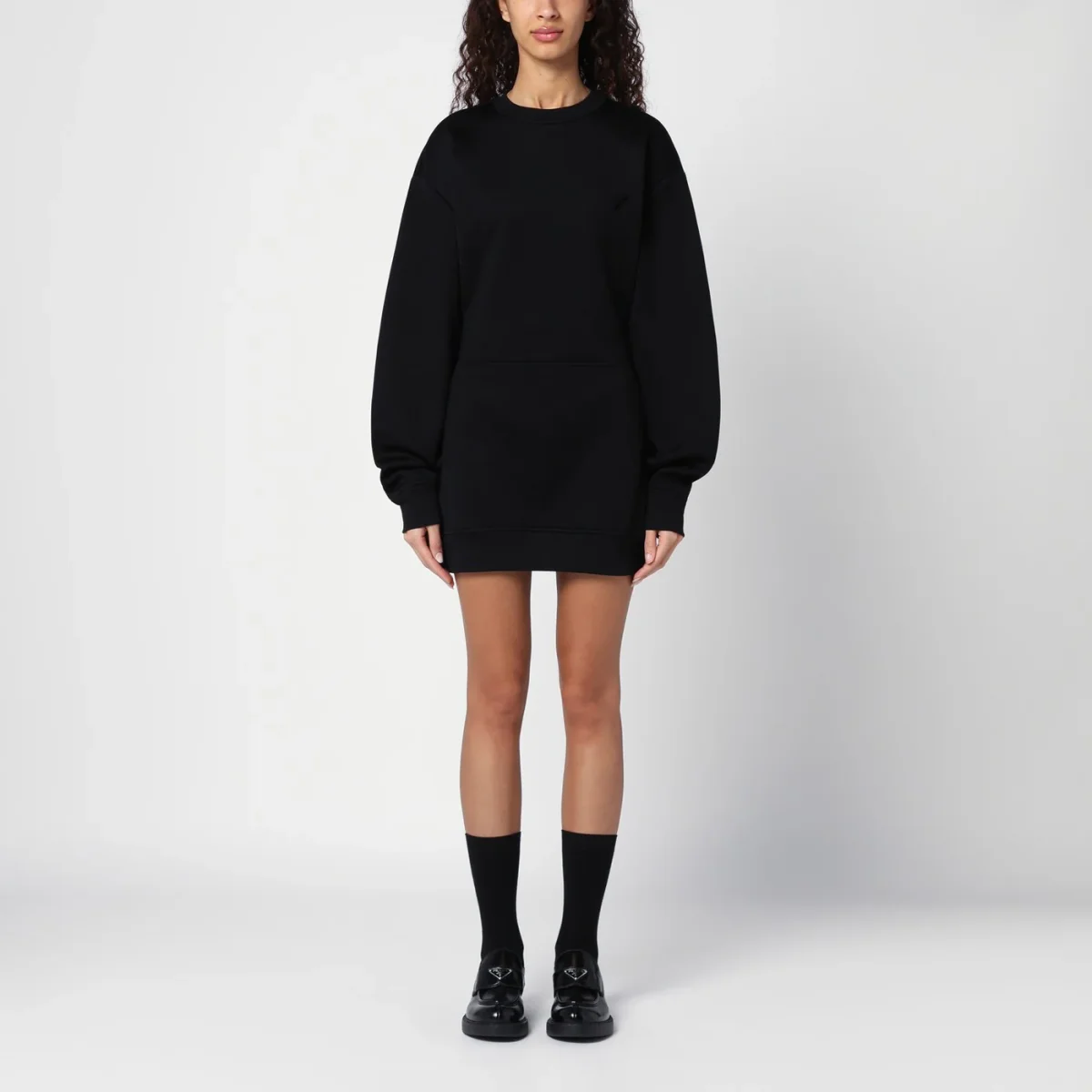 Abito corto di Prada in cotone felpato nero, caratterizzato da design girocollo, logo triangolo sul petto, tasca frontale a marsupio, polsini e orlo a costine.