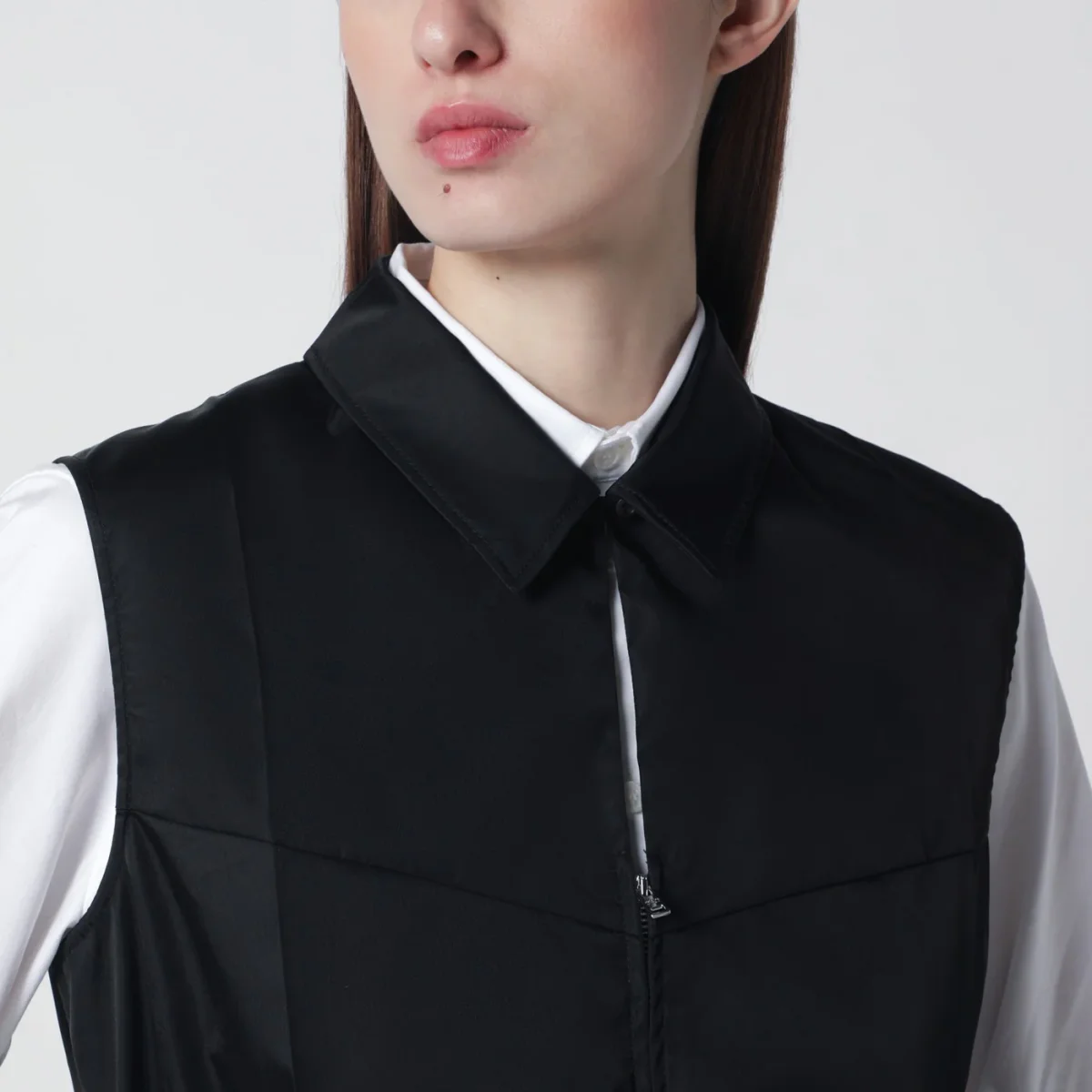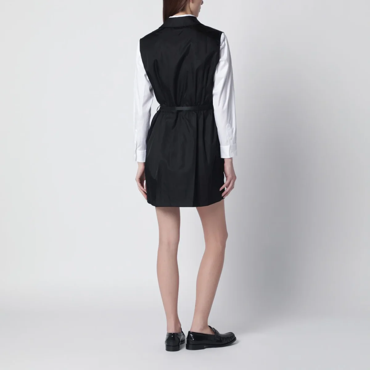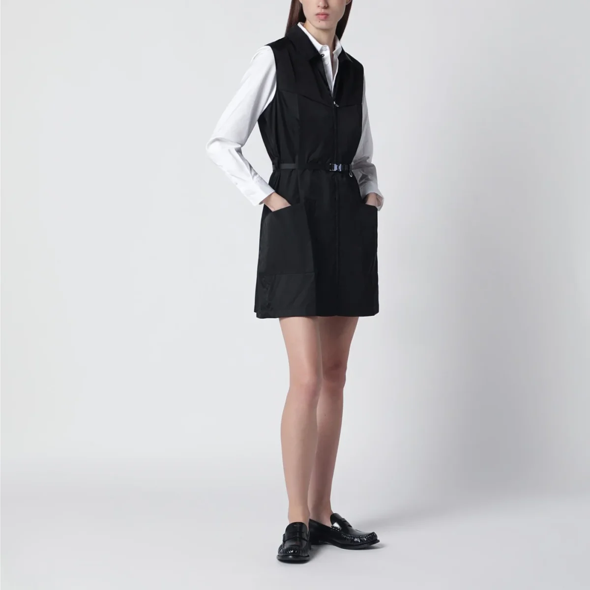 Abito corto smanicato di Prada in Re-Nylon nero• colletto a camicia• chiusura sul davanti con zip• logo triangolo in tessuto sul retro• due tasche applicate sul davanti• cintura in vita regolabile con moschettone• dettaglio occhiello in metallo