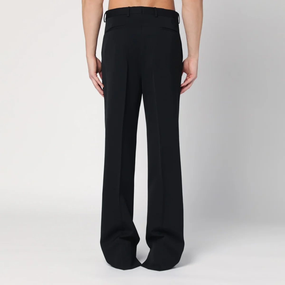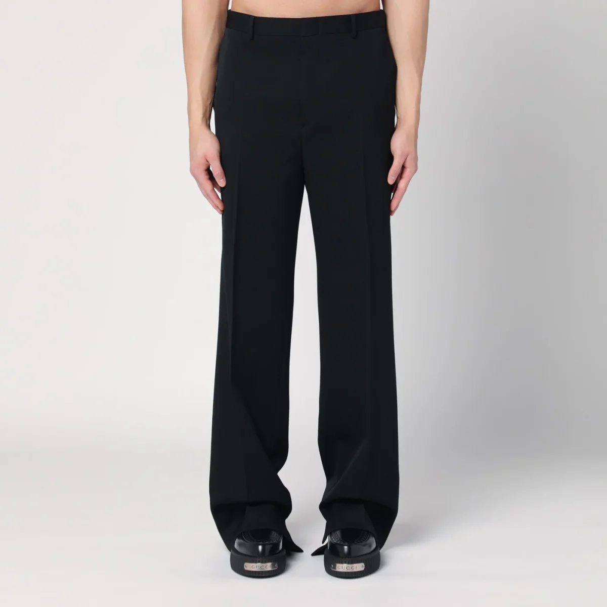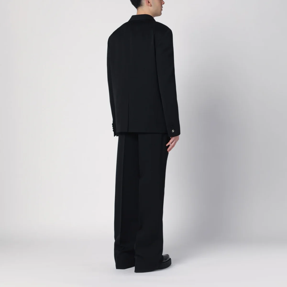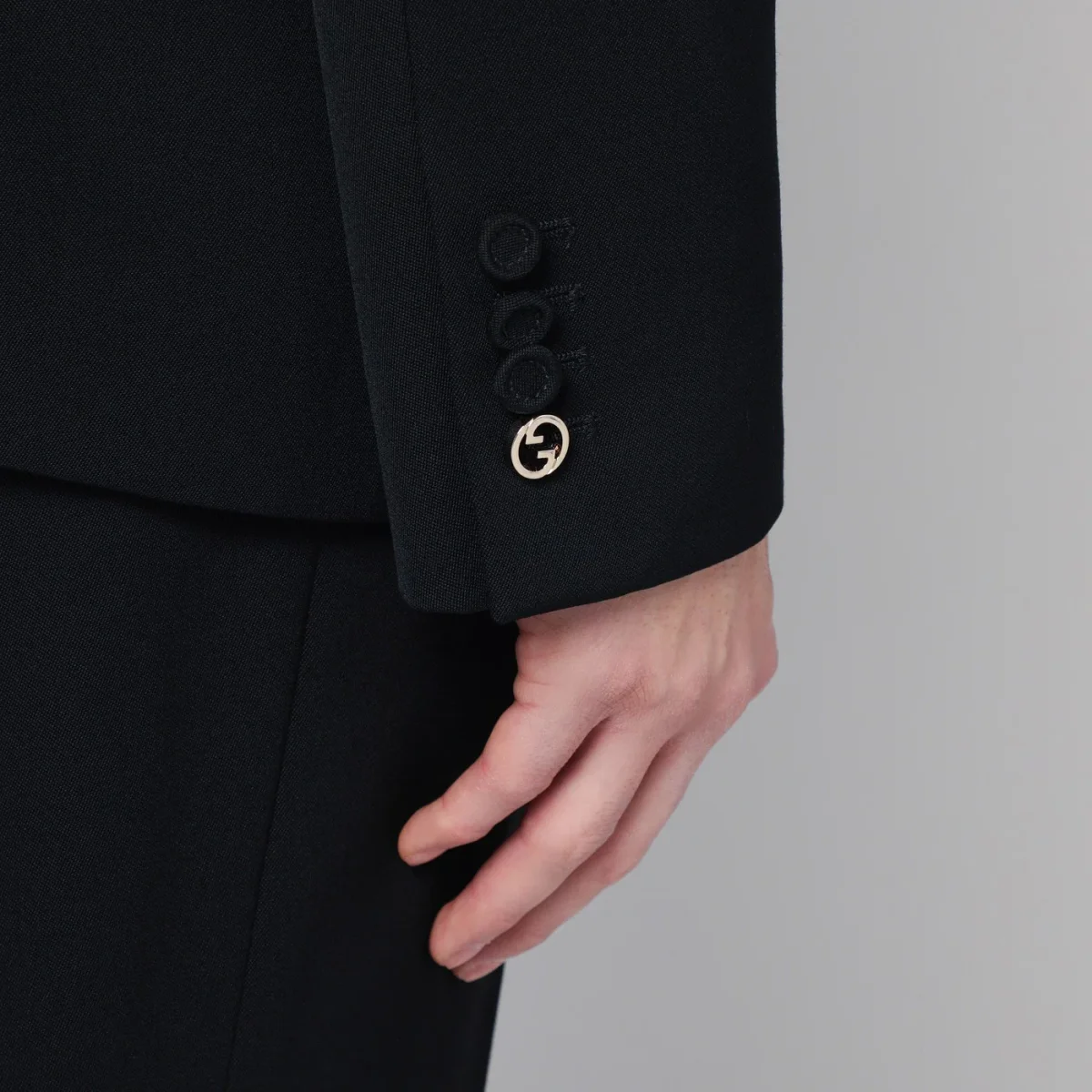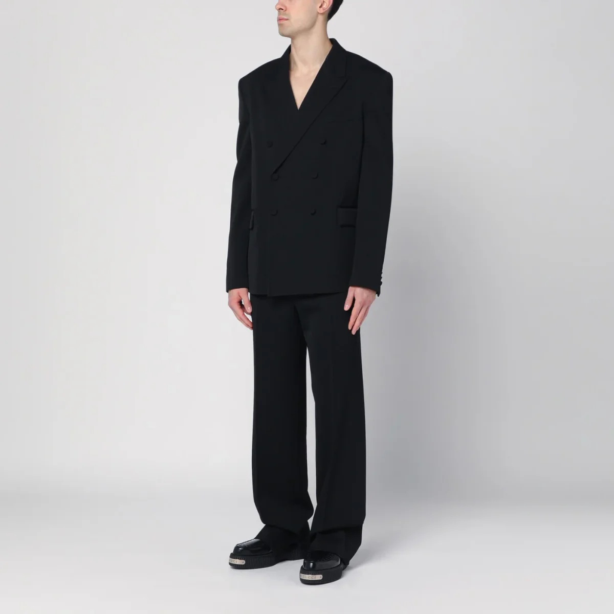 Abito doppiopetto di Gucci in lana nero, caratterizzato da giacca con revers a lancia, chiusura frontale con bottoni rivestiti, una tasca a filetto sul petto, maniche lunghe con polsi con bottoni di cui uno con incrocio GG tondo color oro, due tasche con patta e spacco posteriore. Pantalone con chiusura frontale con zip e gancetto, passanti in vita, due tasche laterali a filetto, due tasche posteriori a filetto e orlo con spacco.