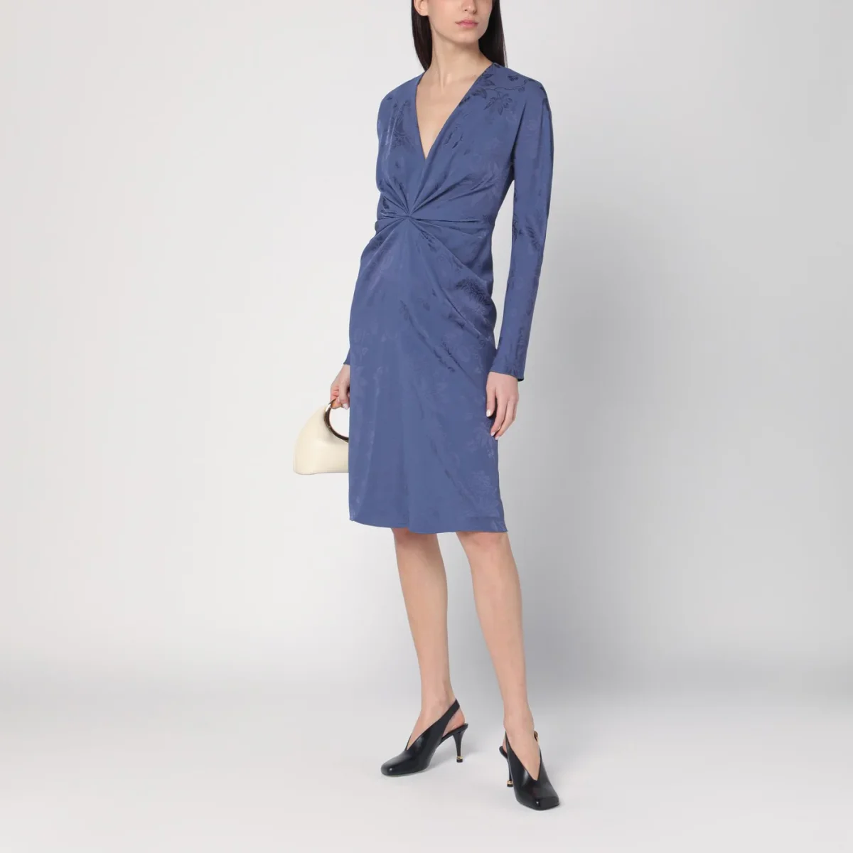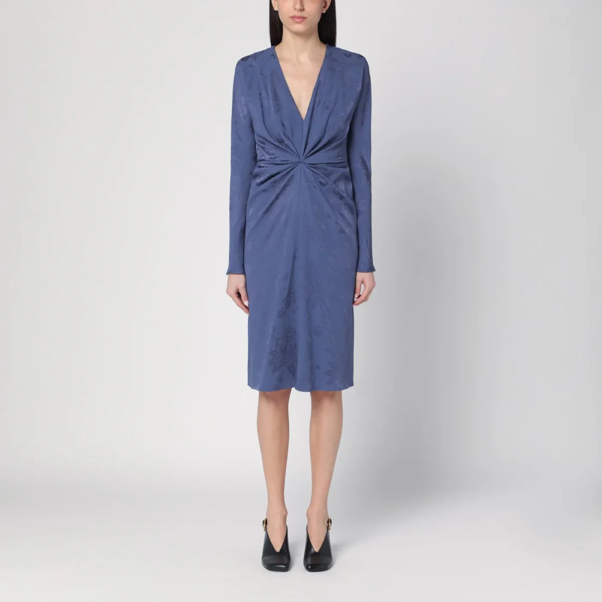Abito di Etro in misto viscosa effetto jacquard color fiordaliso, caratterizzato da manica lunga, scollo a V, dettaglio drappeggiato sul davanti e chiusura posteriore con zip.