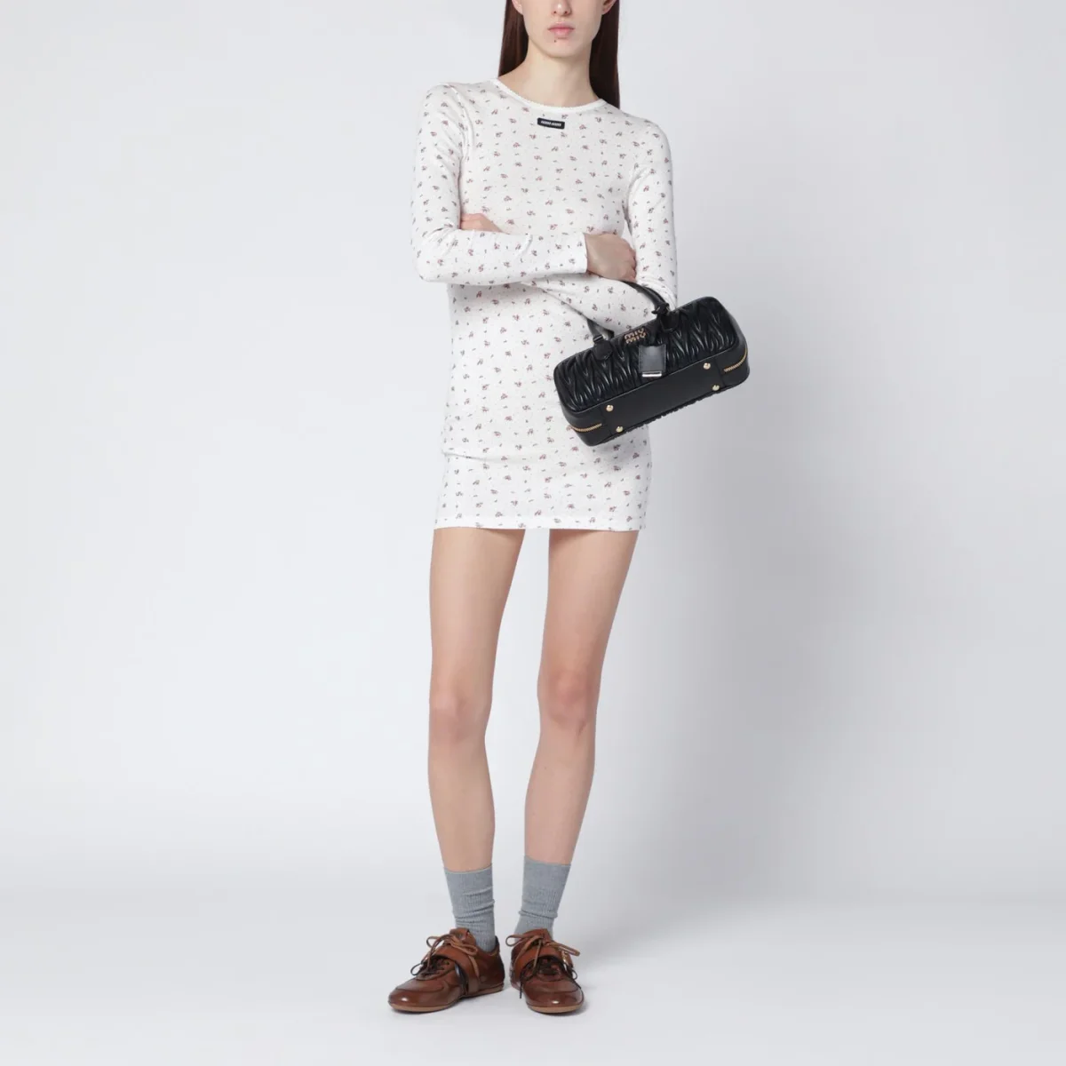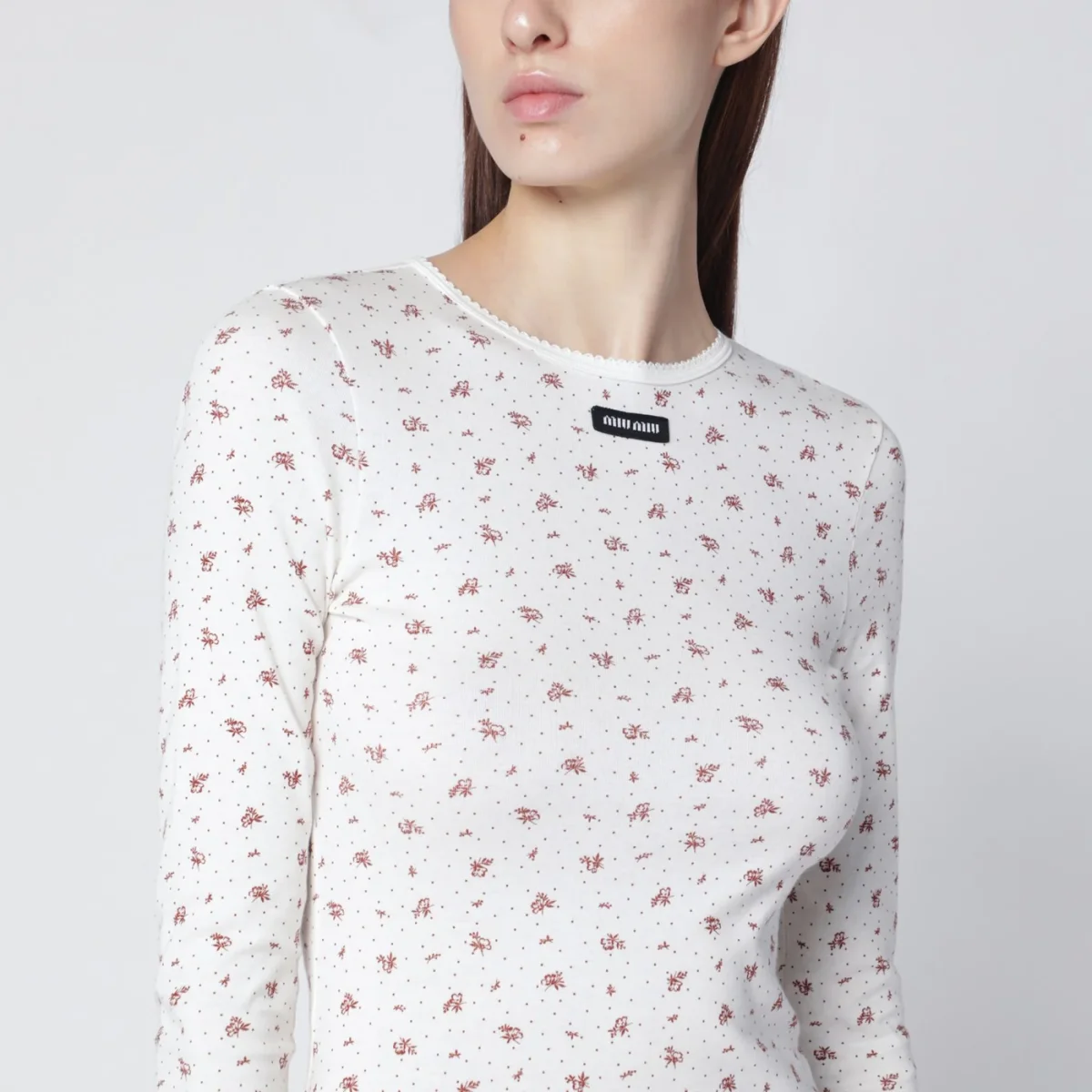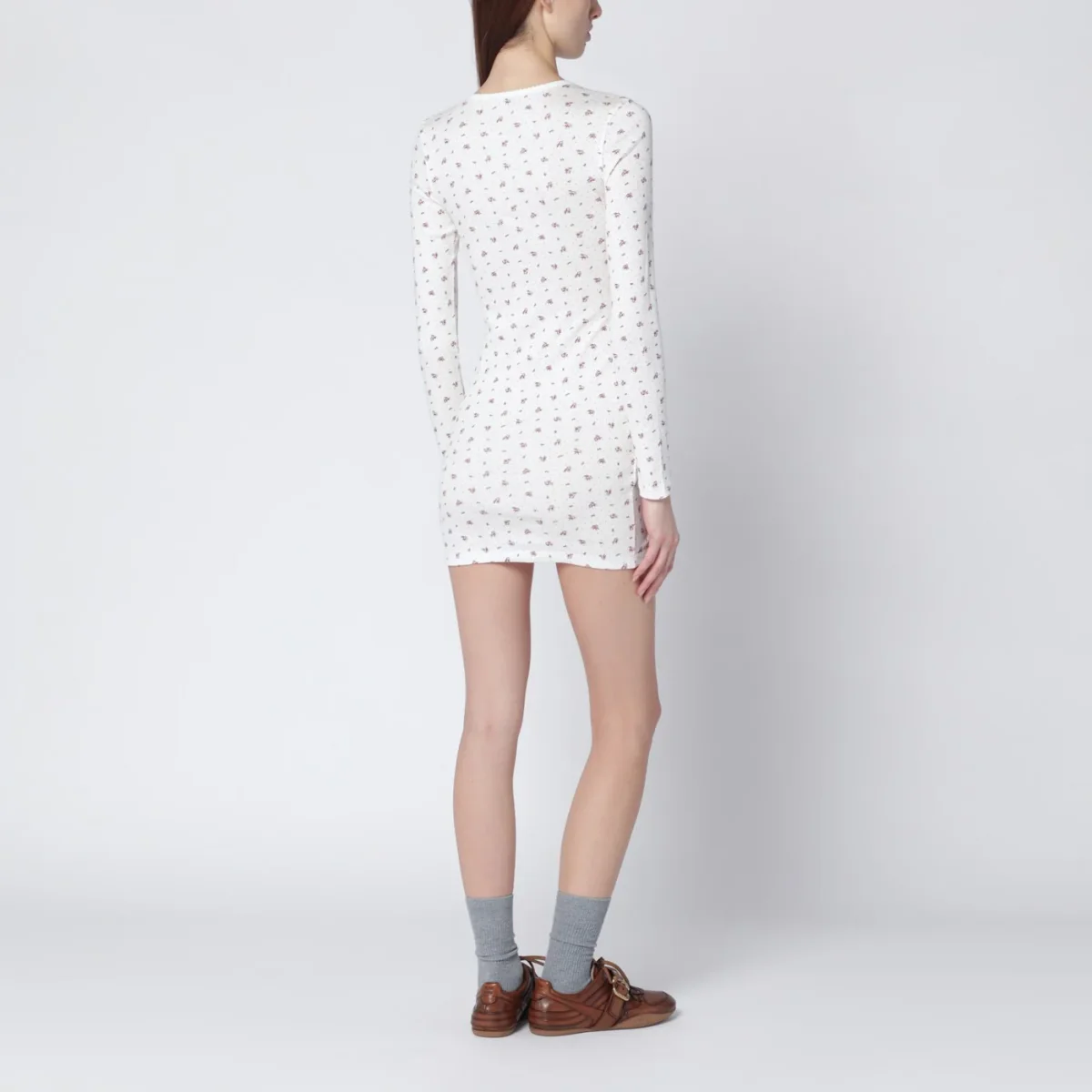 Mini abito girocollo di Miu Miu in jersey di cotone bianco• motivo floreale color tabacco all over• design a costine• vestibilità dritta• maniche lunghe• patch con logo lettering sul petto