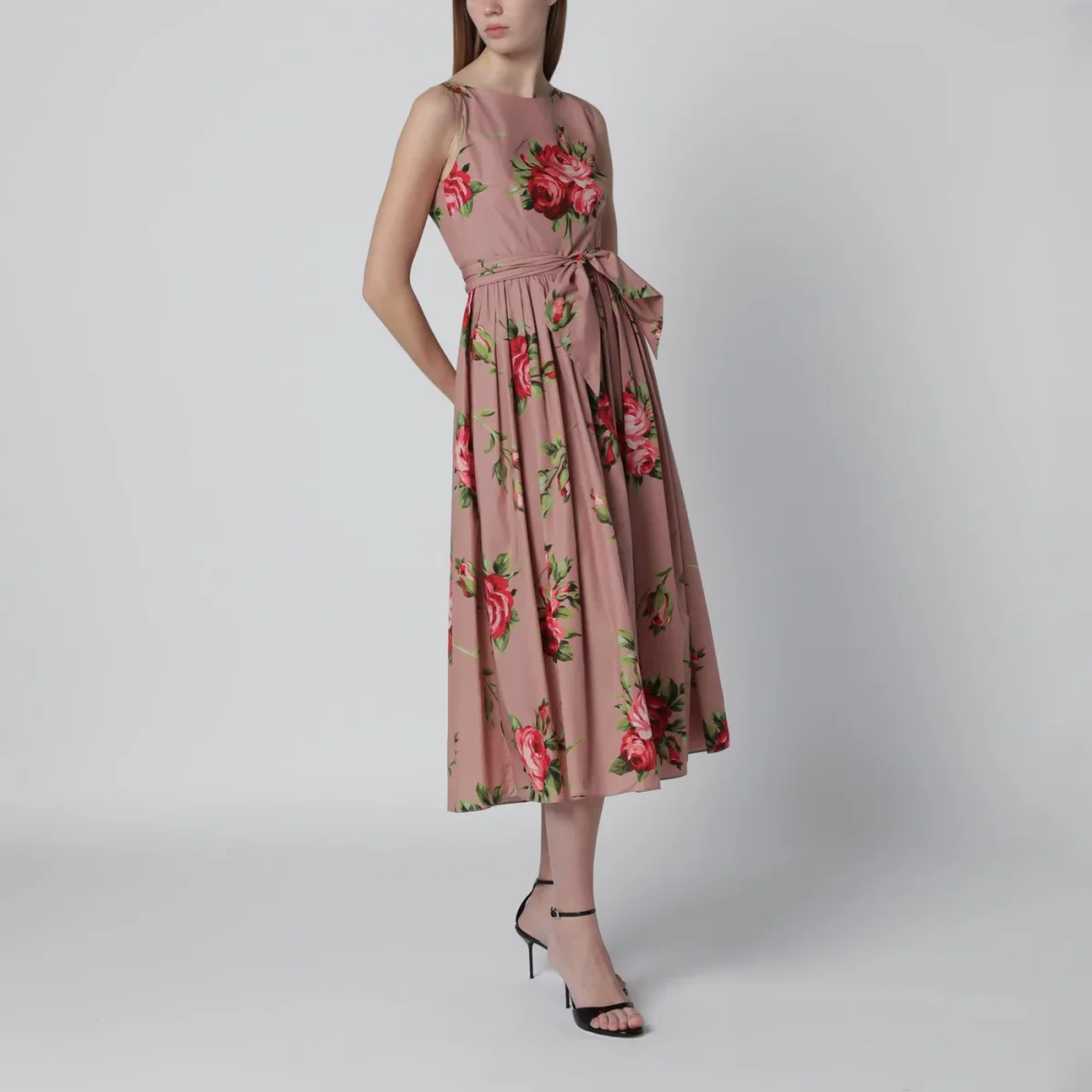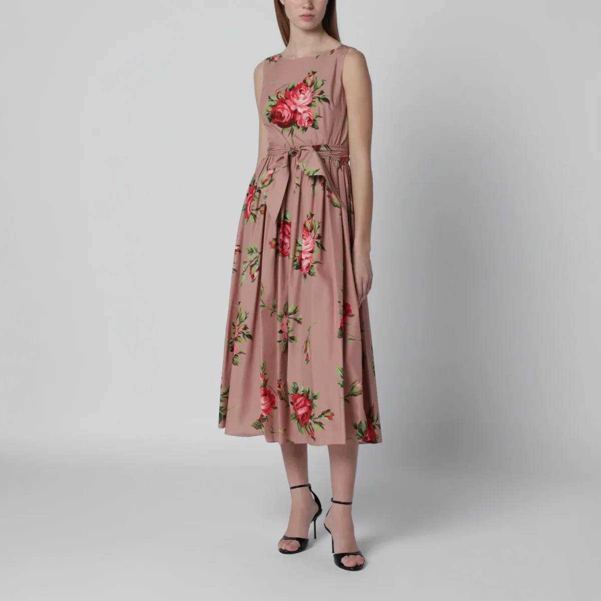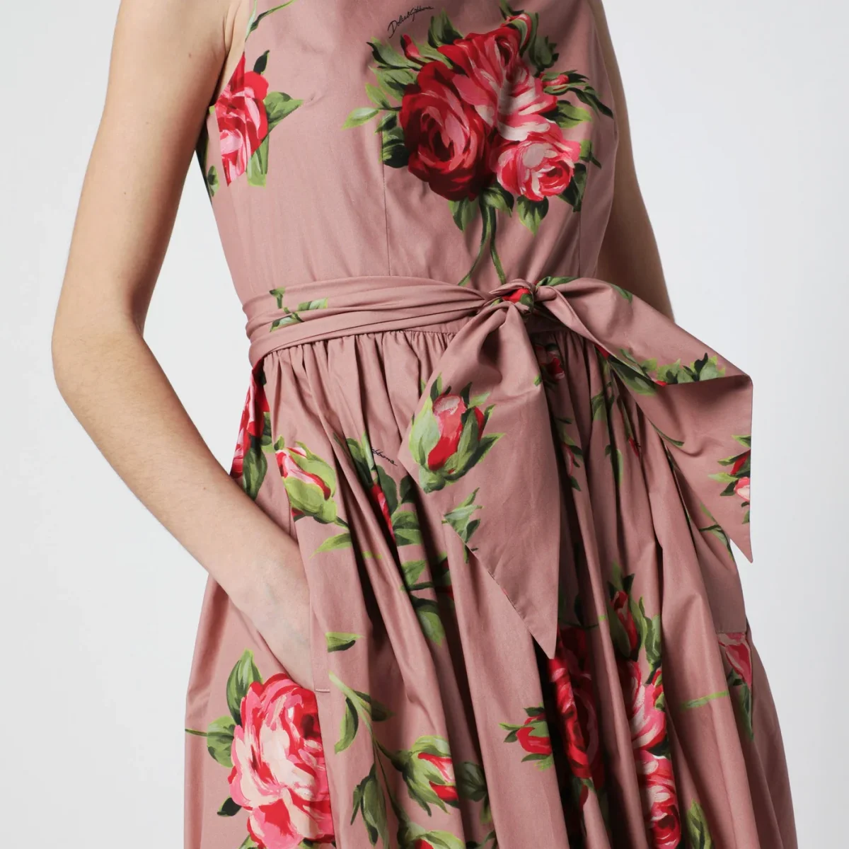 Abito midi smanicato di Dolce & Gabbana in cotone rosa antico con stampa floreale all over a contrasto• Scollo a barchetta• Gonna con pieghe• Arricciatura• Chiusura posteriore con zip• Due tasche laterali• Cintura in vita stile foulard