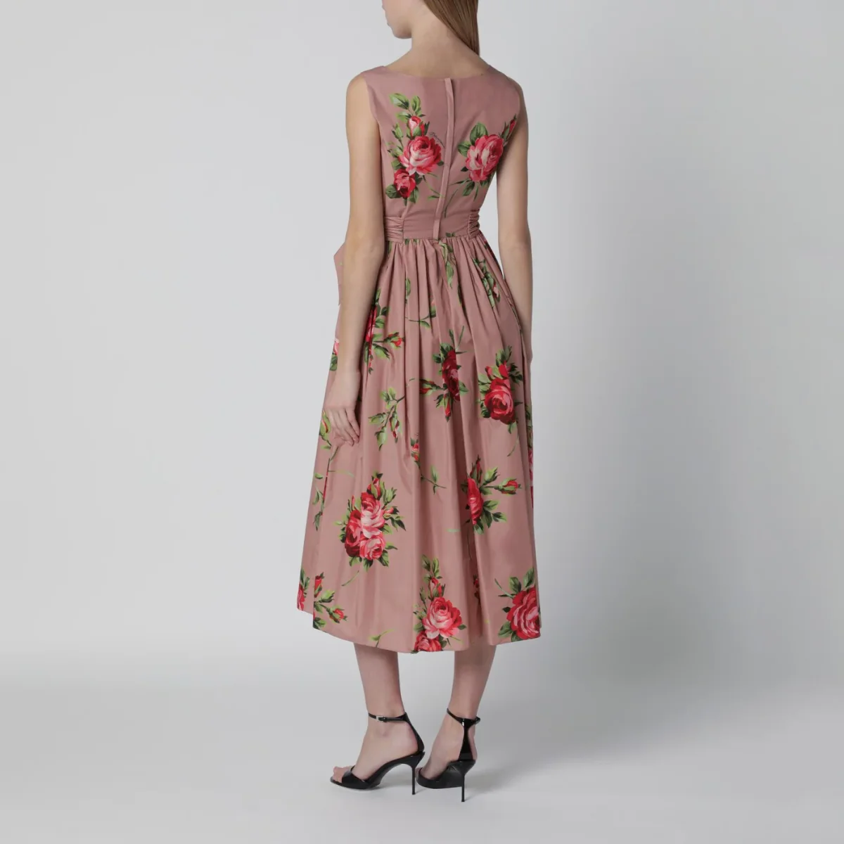 Abito midi smanicato di Dolce & Gabbana in cotone rosa antico con stampa floreale all over a contrasto