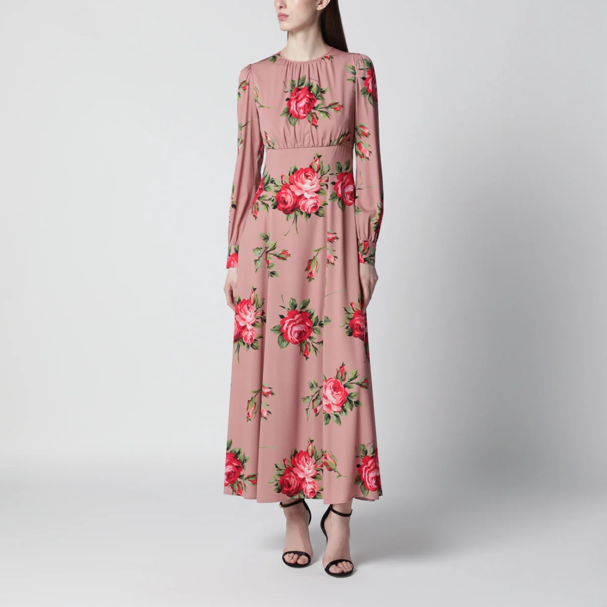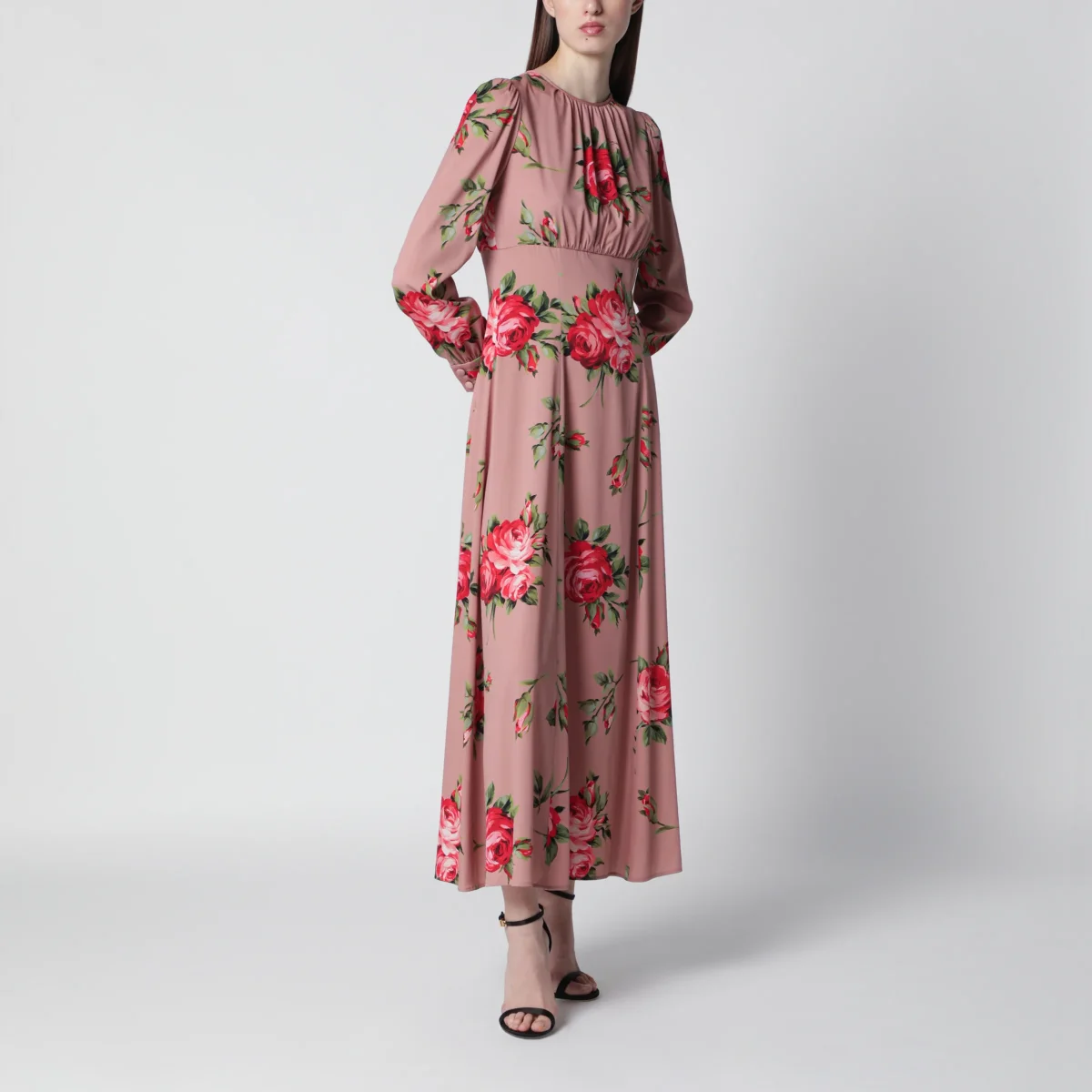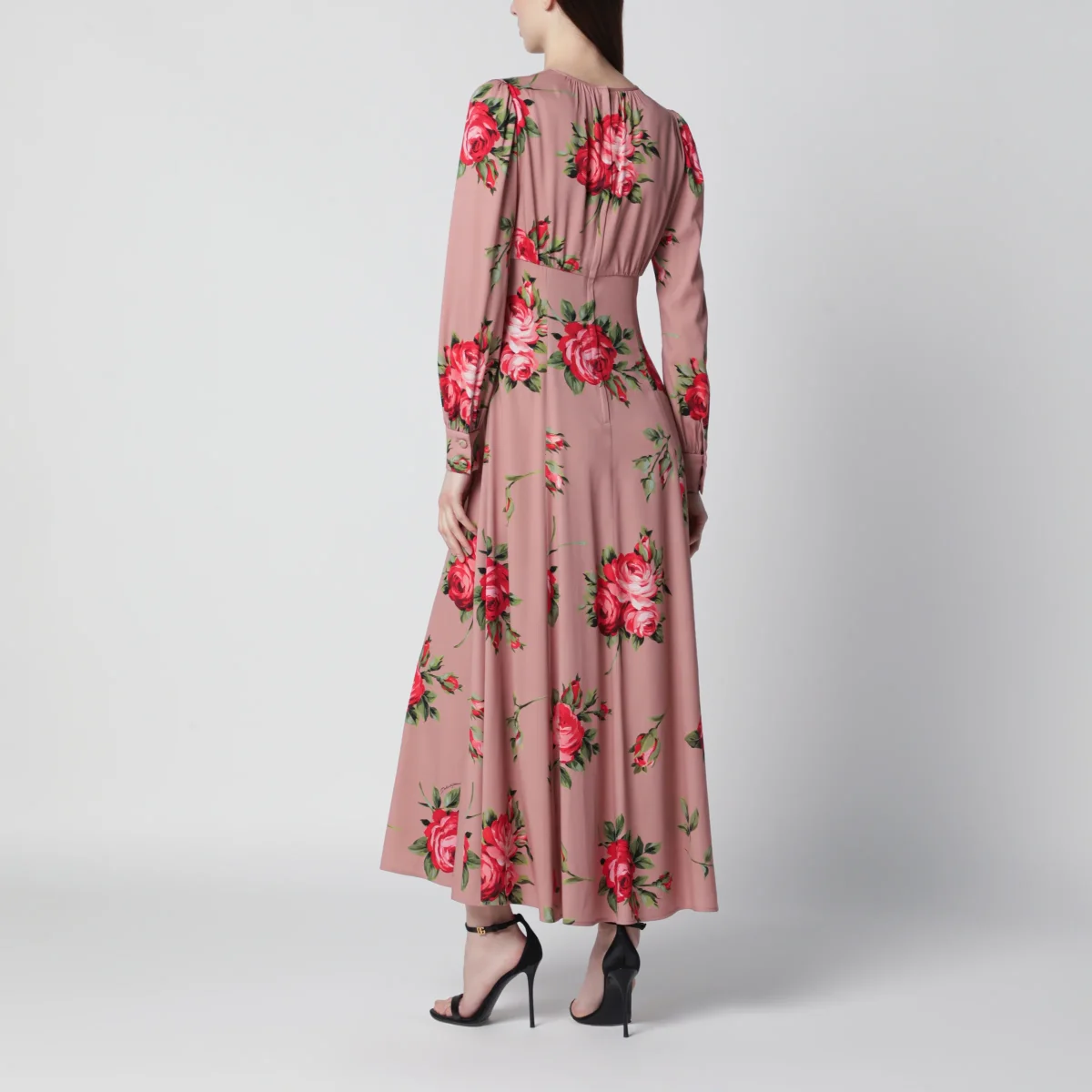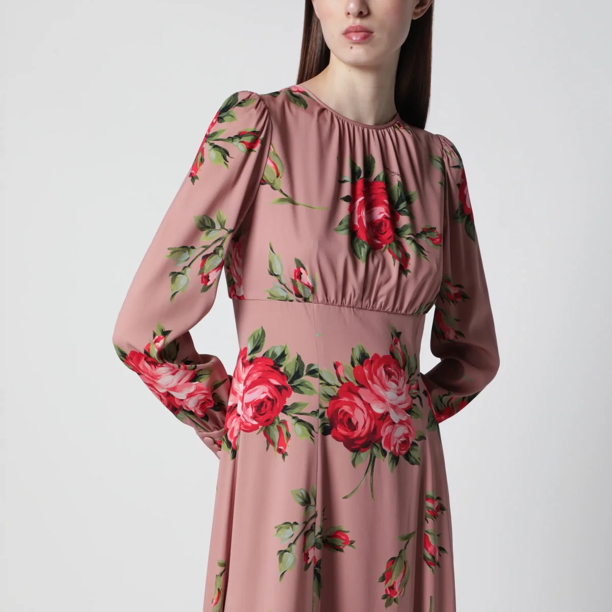 Abito in crêpe di misto seta di Dolce & Gabbana• Colore: Rosa con stampa Bouquet• Corpino con pinces sullo scollo• Maniche lunghe con polsi con bottoni• Chiusura posteriore con zip