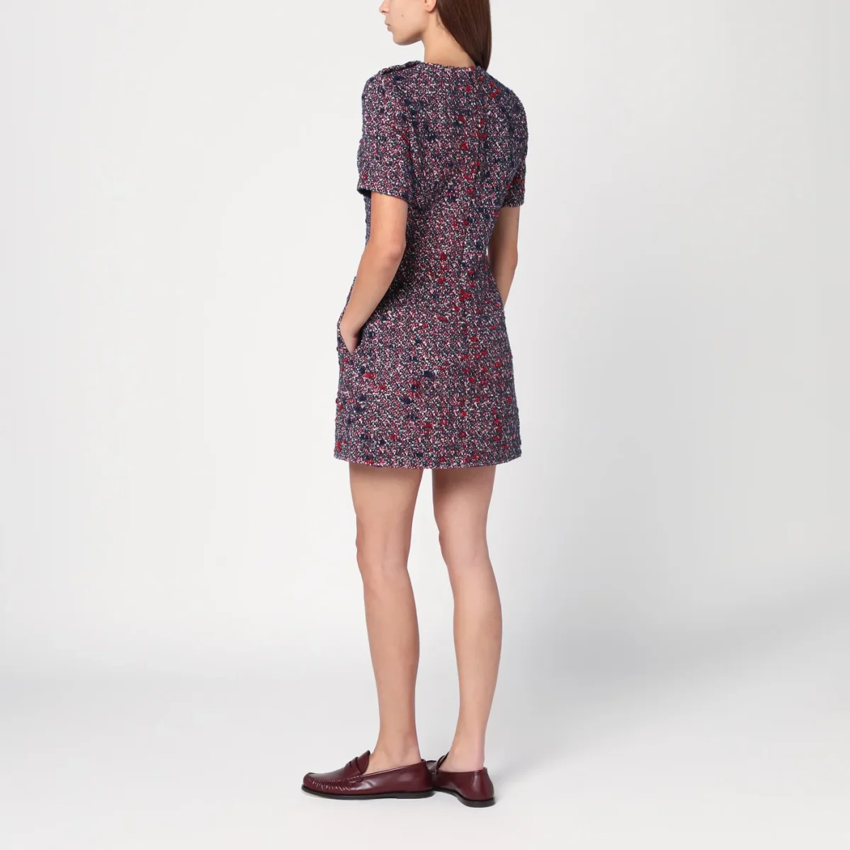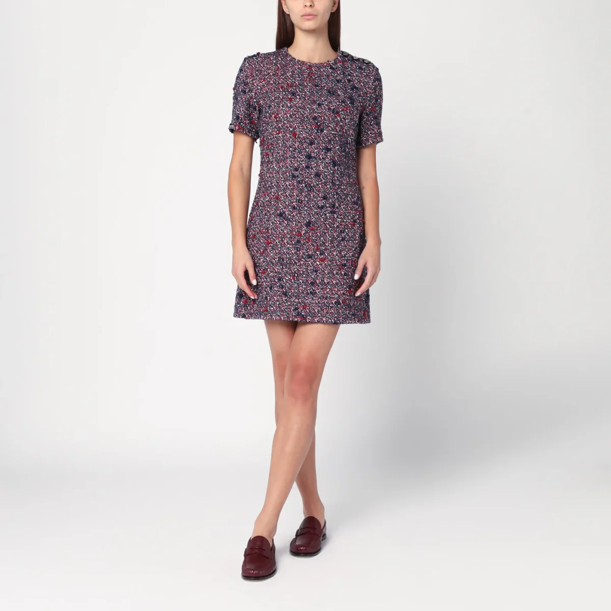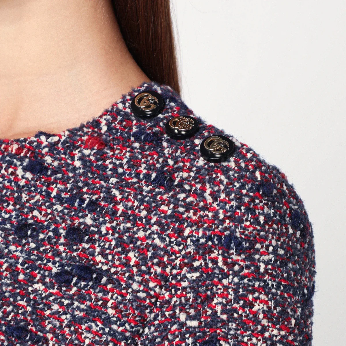 Abito girocollo di Gucci in misto lana bouclé blu e rosso, caratterizzato da maniche corte, chiusura posteriore con zip, bottoni con logo GG sulla spalla e due tasche laterali.