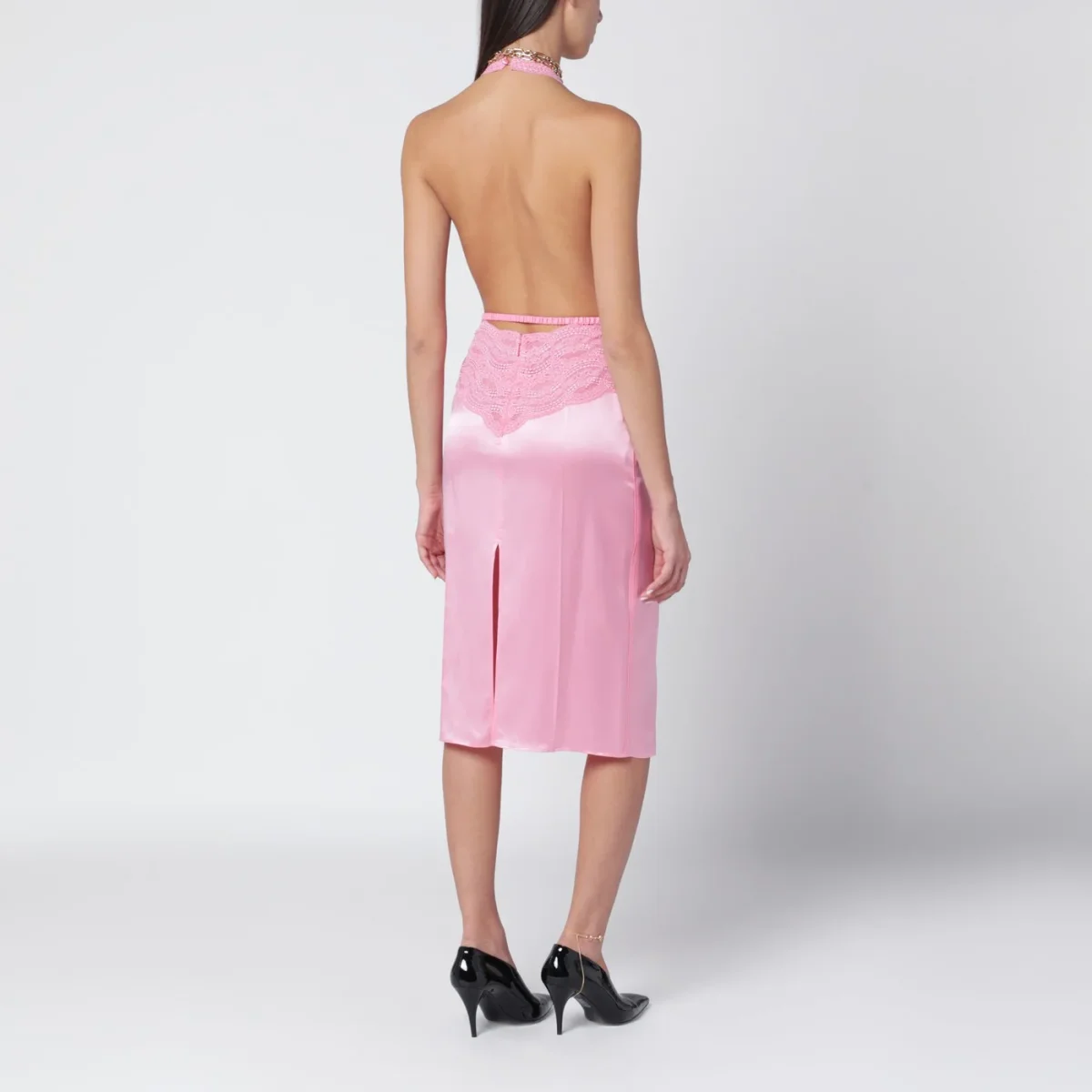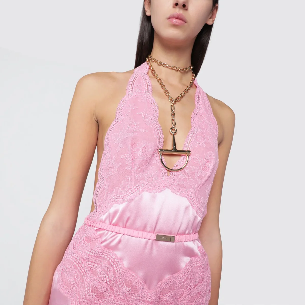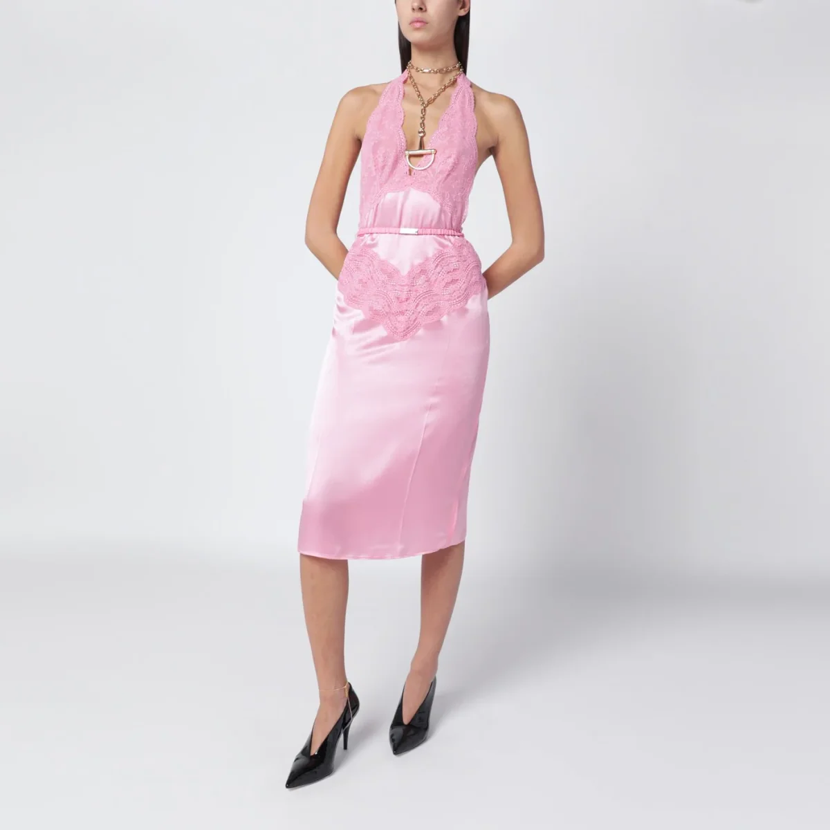 Abito midi di Gucci in seta rosa, caratterizzato da finiture in pizzo, scollatura all’americana, cintura elastica rimovibile con ruche, fibbia Gucci in metallo e apertura sul retro.