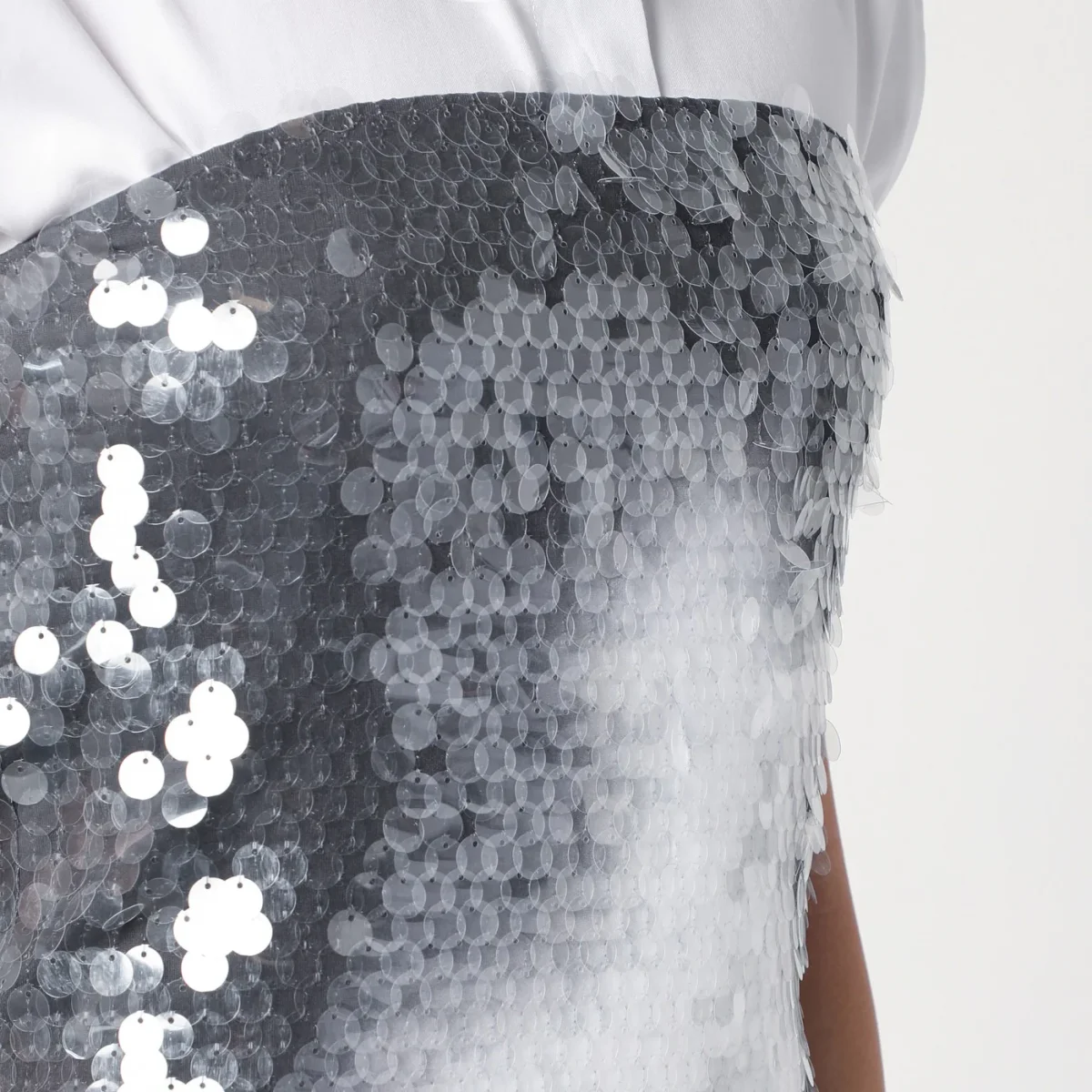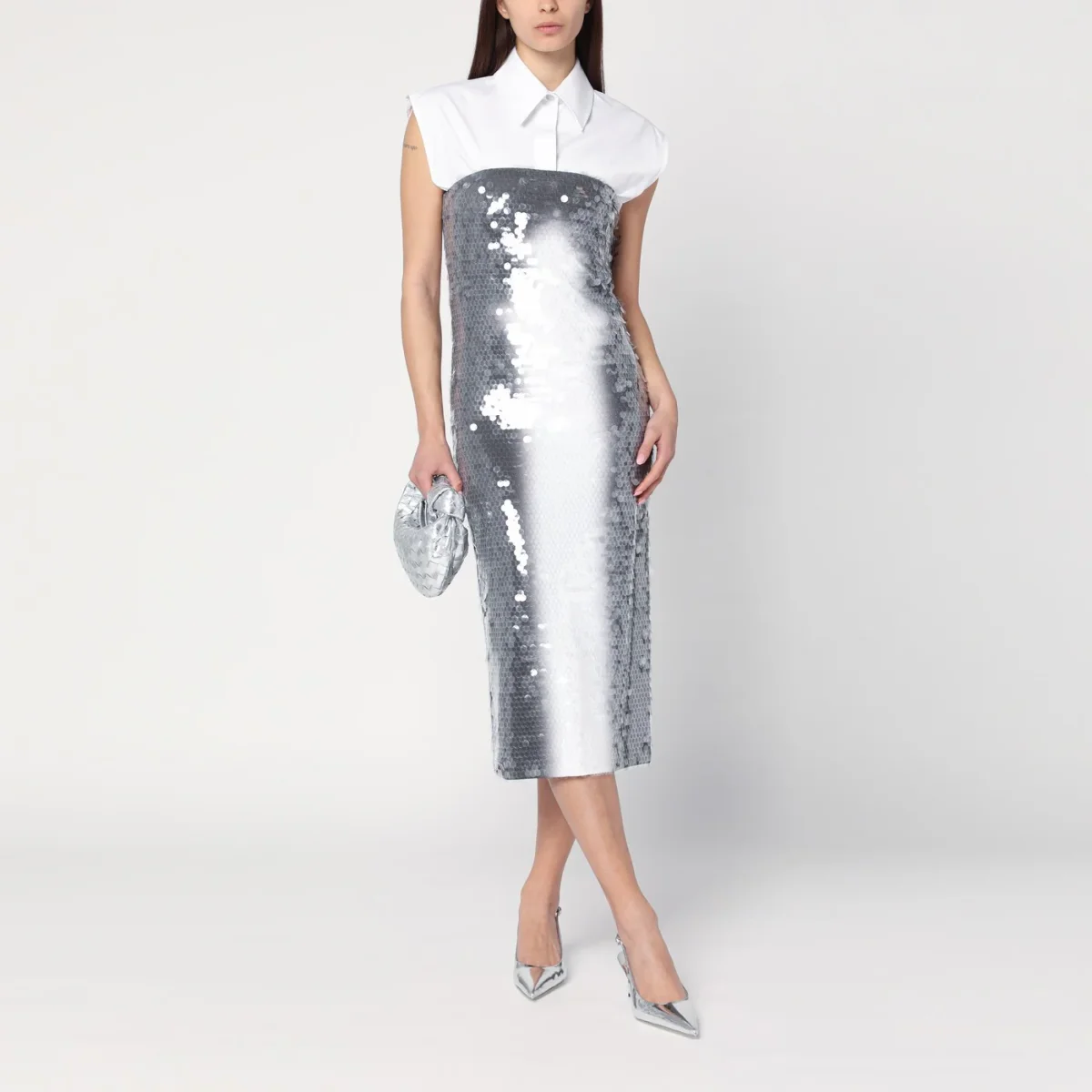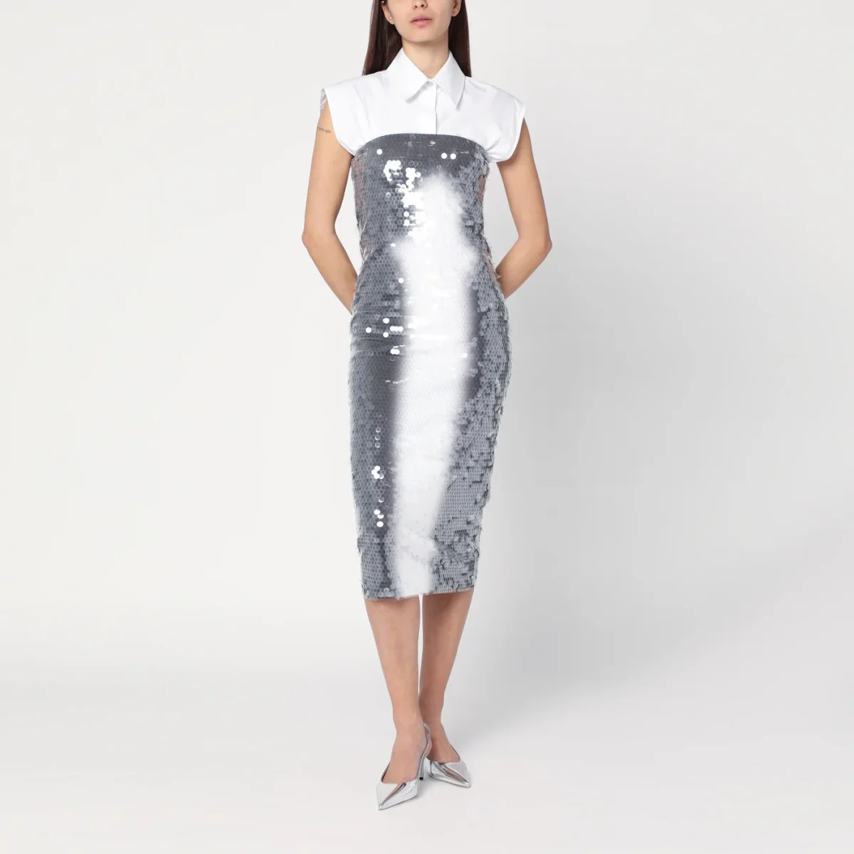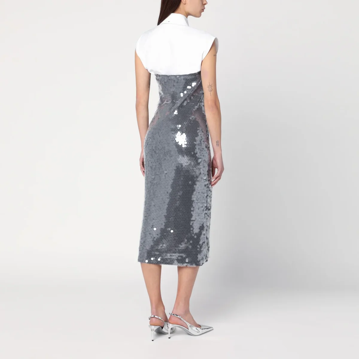 Abito longuette smanicato di Sportmax in jersey tecnico sfumato con paillette all over, caratterizzato da design aderente, scollo dritto, bustier interno foderato, chiusura laterale con zip e vestibilità regolare.