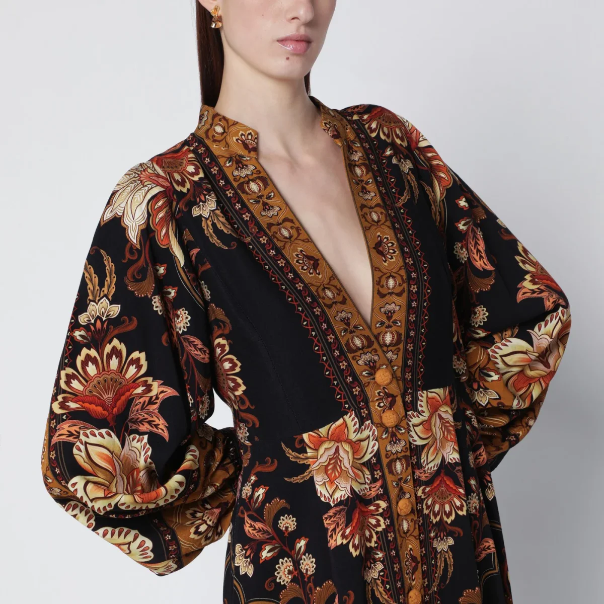 Abito lungo di Farm Rio in cotone nero• motivi floreali all over a contrasto•scollo a V• manica lunga a sbuffo con polsini con bottoni•chiusura con bottoni sul davanti
