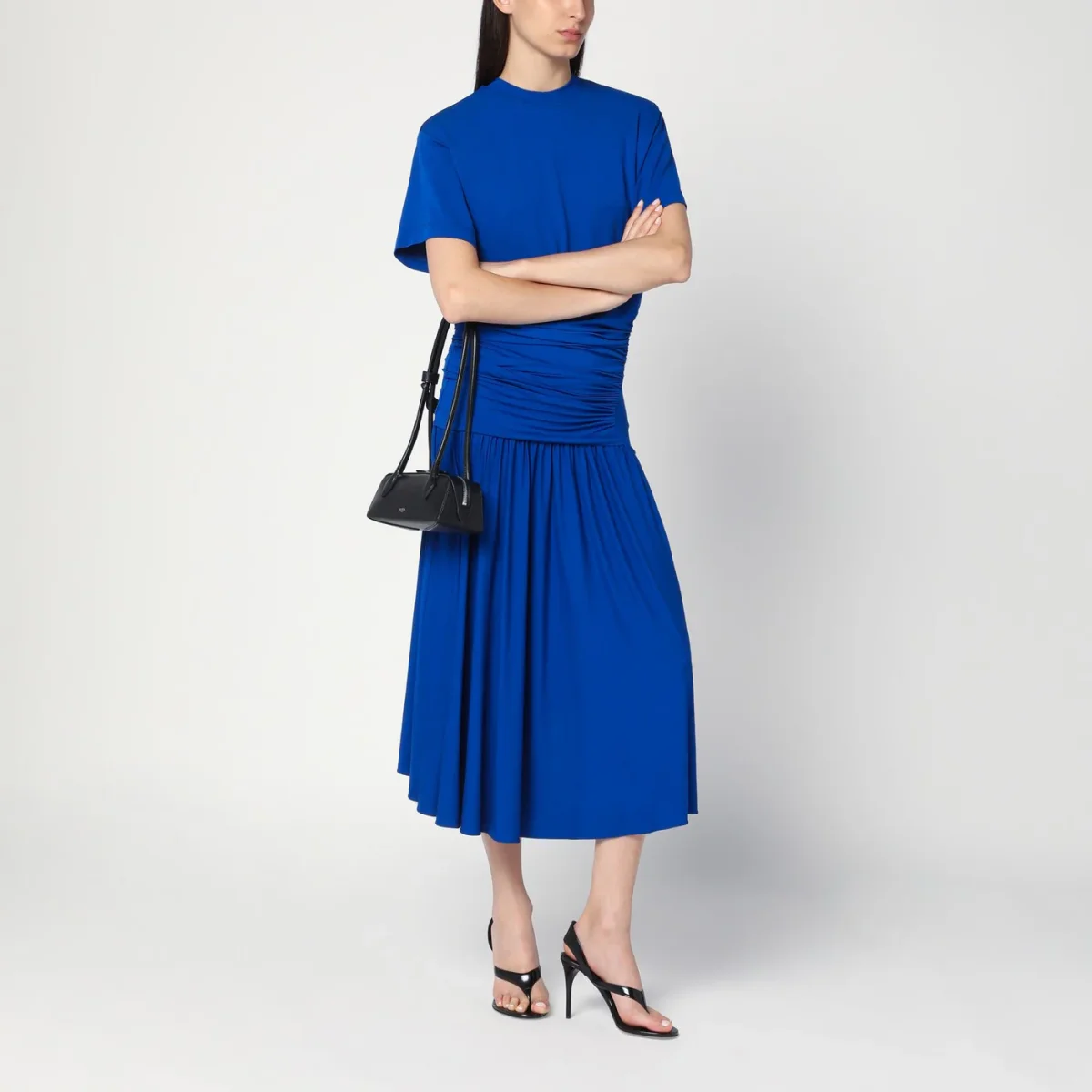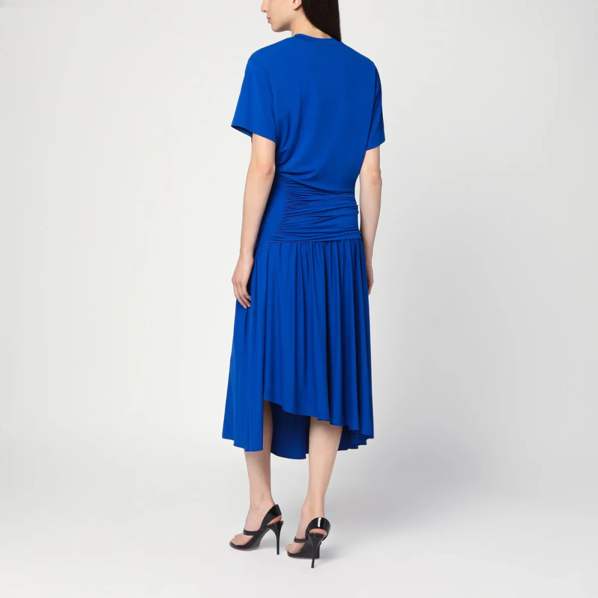 Abito lungo di Salvatore Ferragamo in jersey stretch blu, caratterizzato da dettaglio con drappeggio, maniche corte e gonna plissettata con orlo asimmetrico.