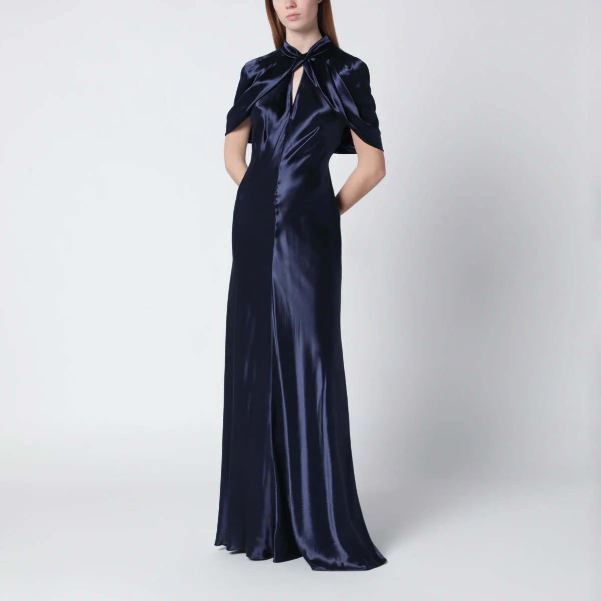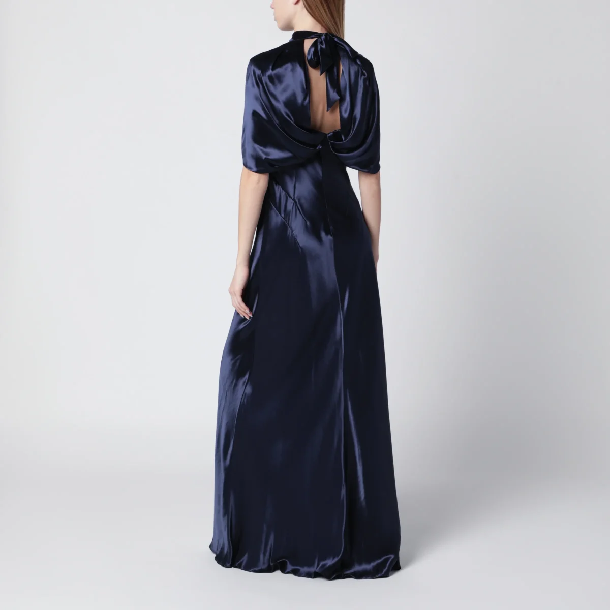 Abito in raso lucido di Alberta Ferretti• Colore: blu• Apertura frontale• Maniche corte a sbuffo• Collo alto• Chiusura posteriore con zip