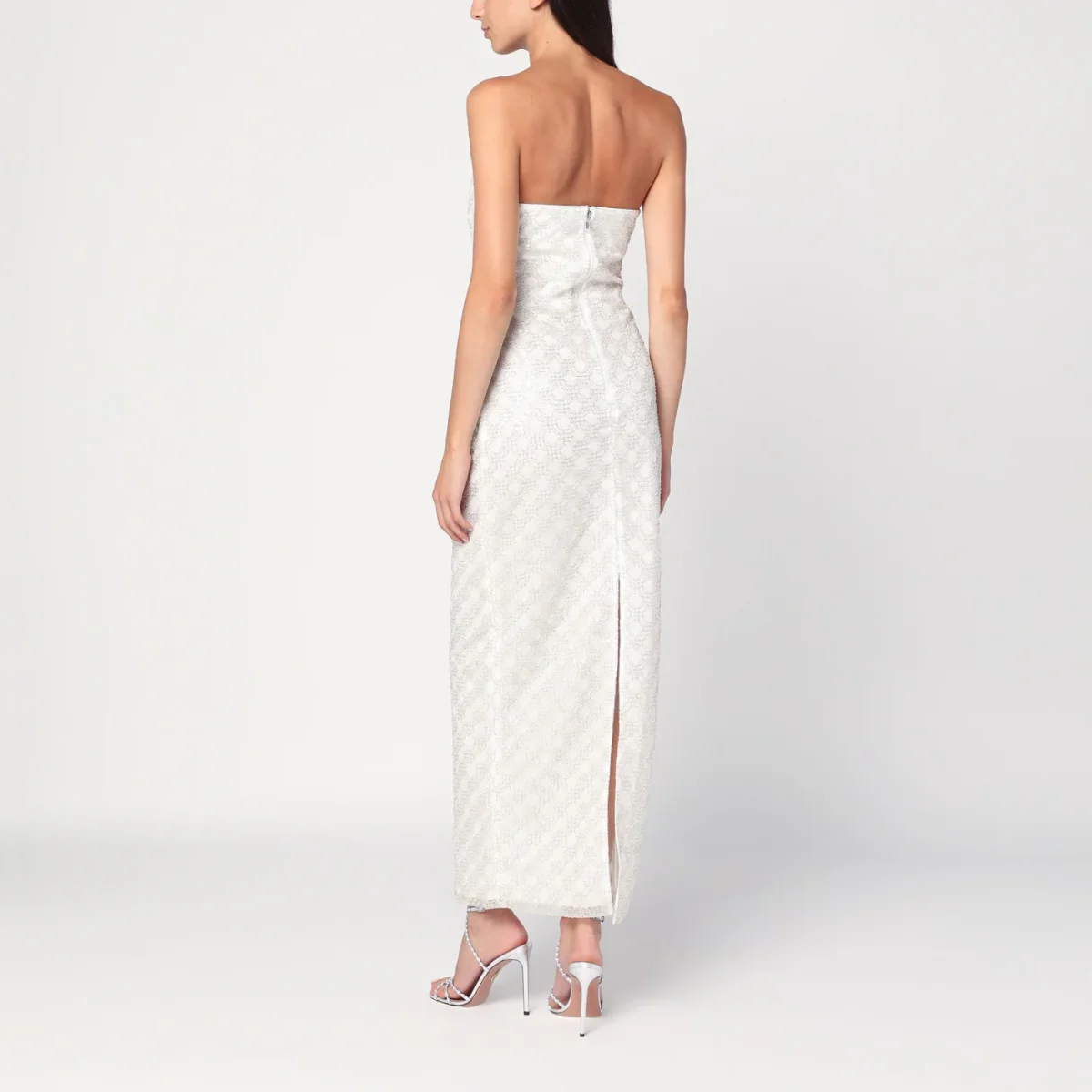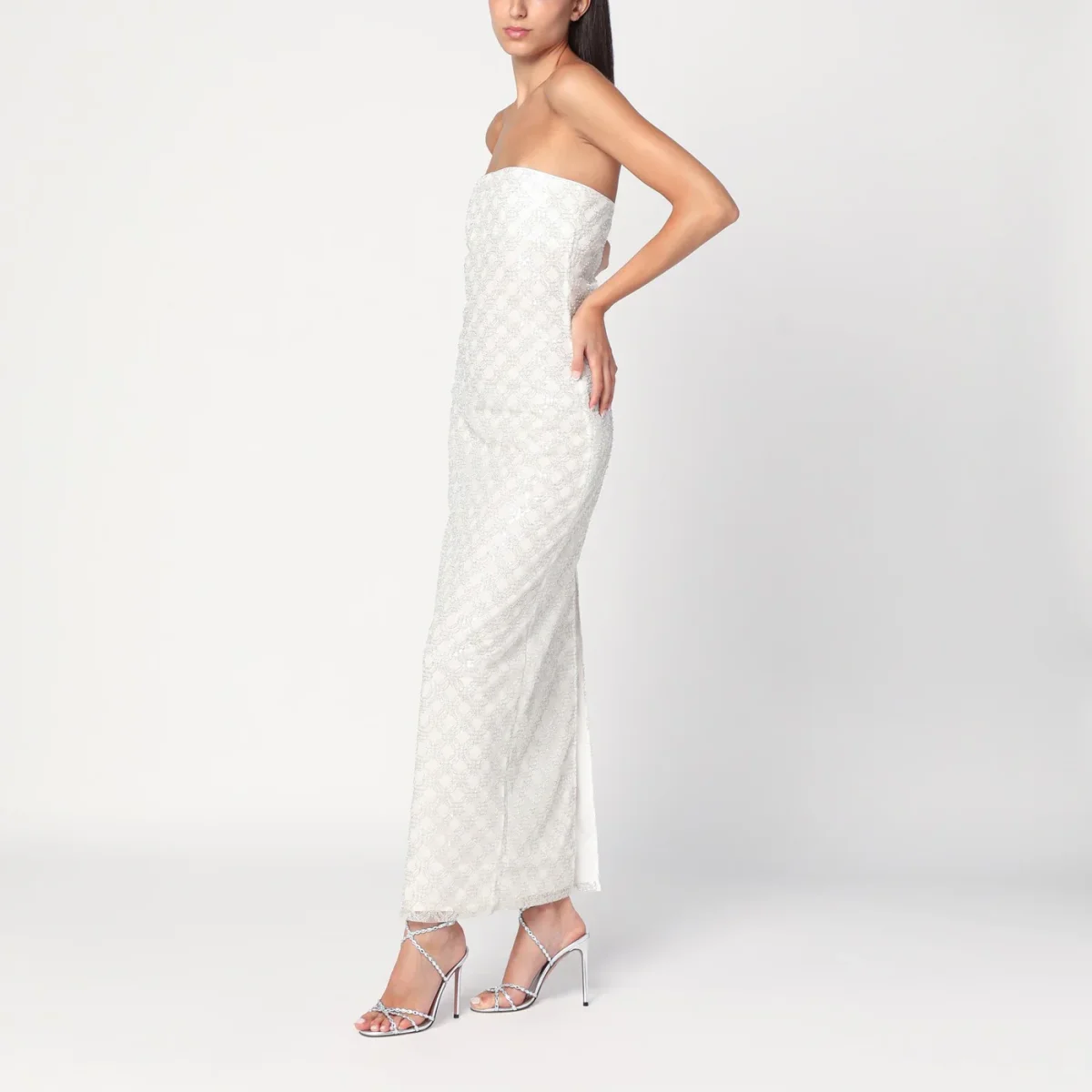 Abito lungo a tubino di Rotate color crema con motivo di perline all over, caratterizzato da design senza spalline, silhouette aderente, scollatura dritta, chiusura con zip sul retro e spacco posteriore.