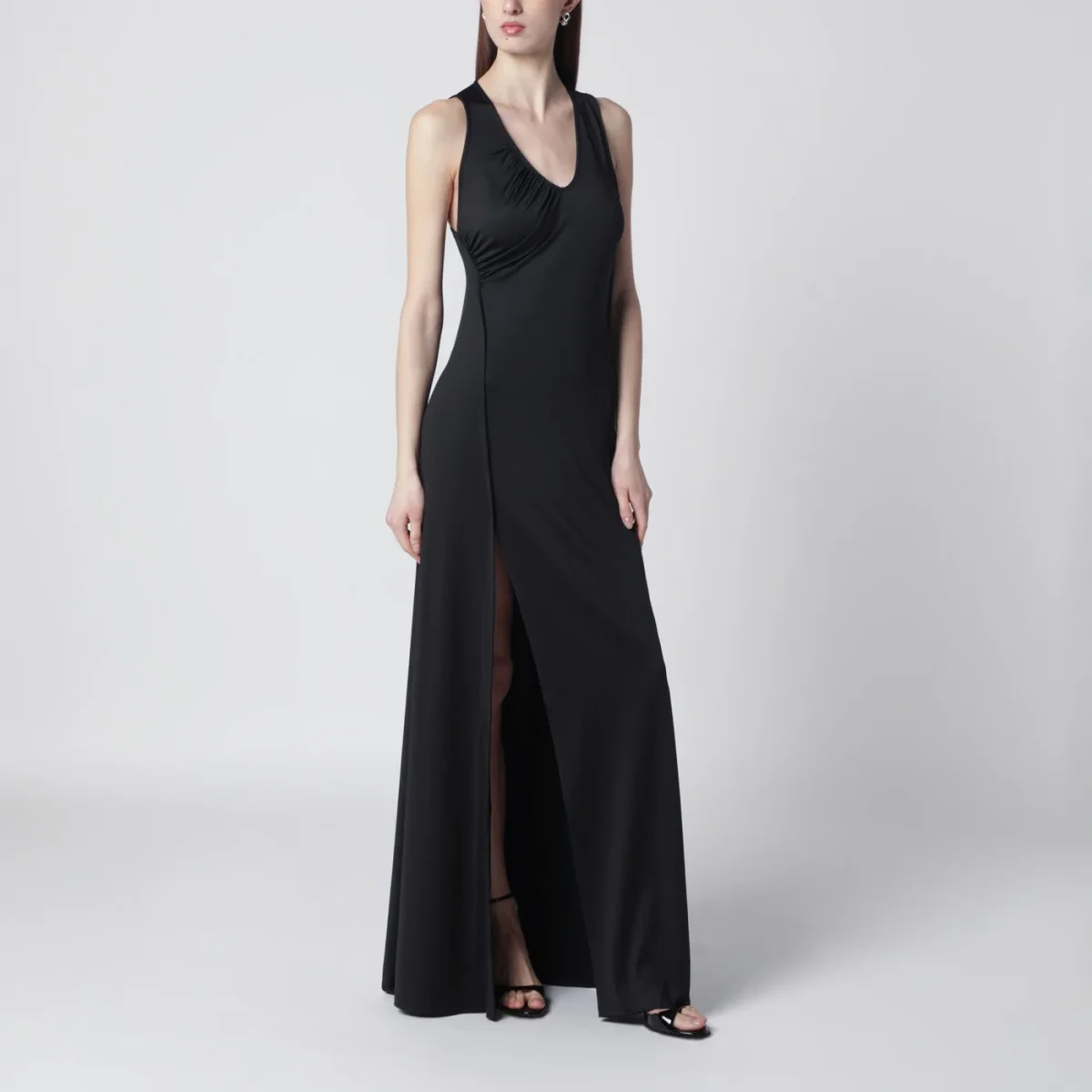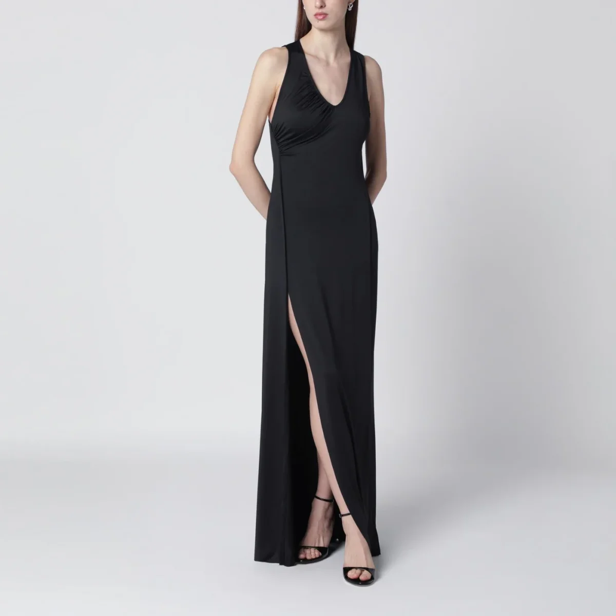 Abito lungo smanicato di Victoria Beckham in jersey nero, caratterizzato da scollo a V, profondo spacco laterale e corpetto con arricciature.