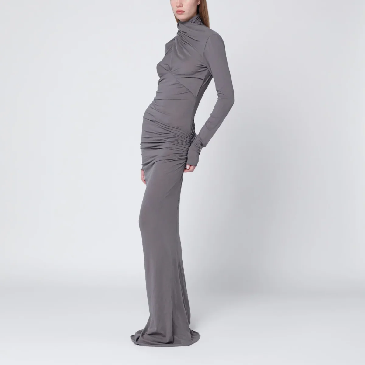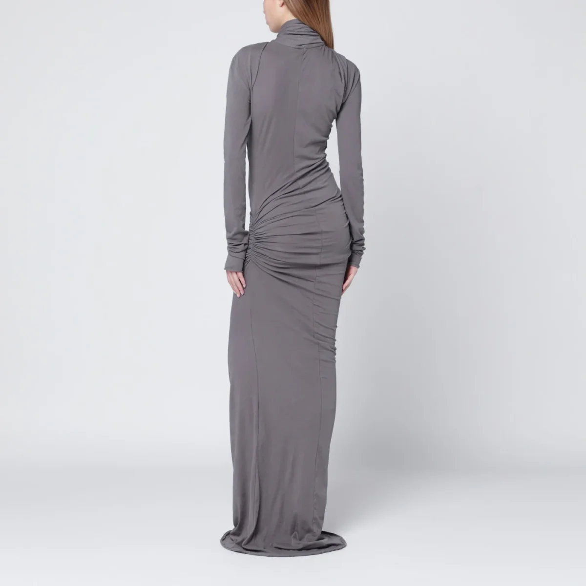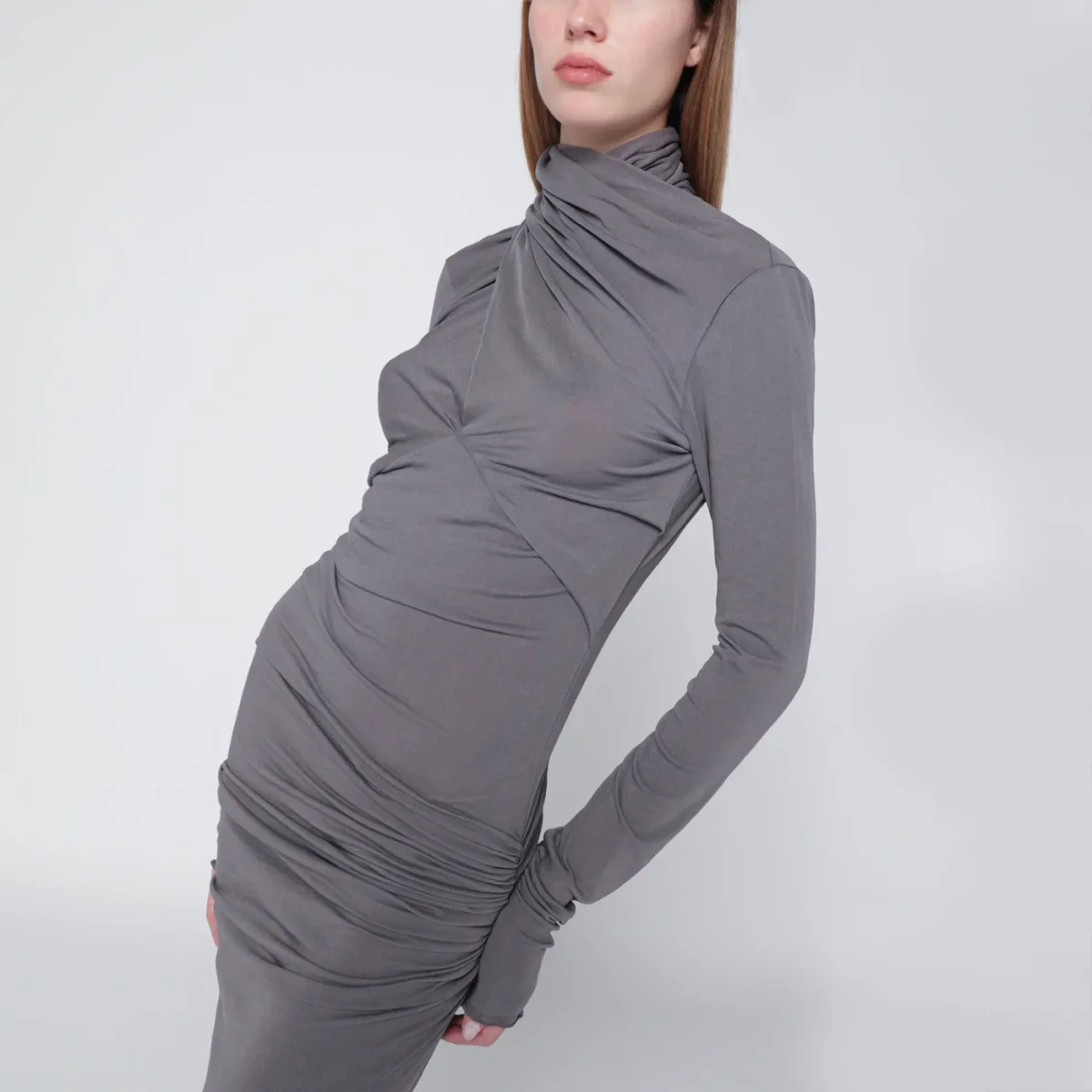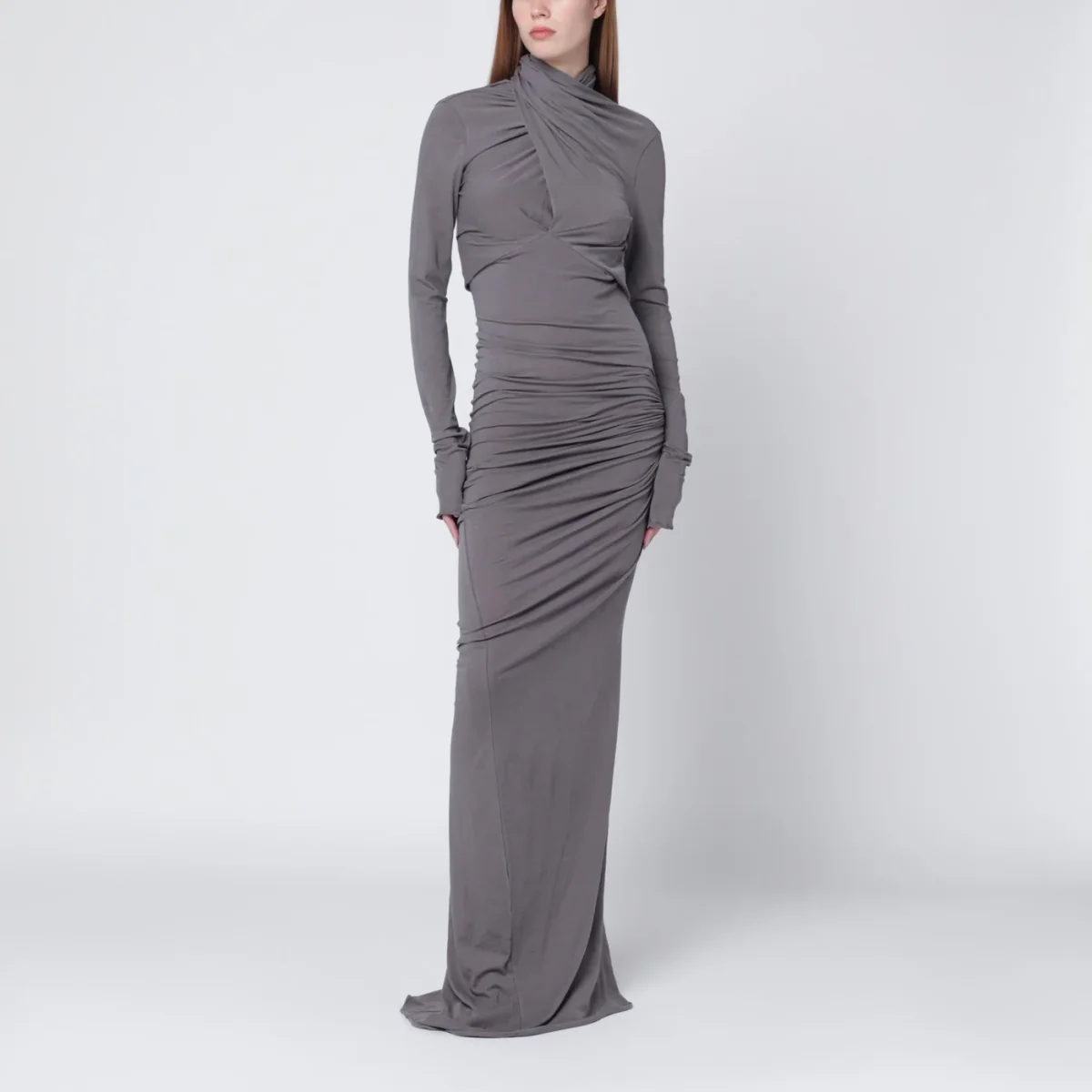 Abito lungo di Entire Studios in misto cotone grigio, caratterizzato da maniche lunghe, collo alto e design drappeggiato con pieghe e arricciature.