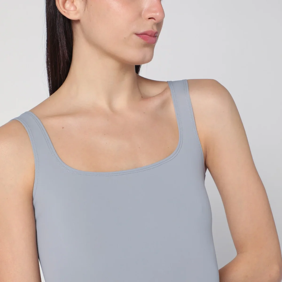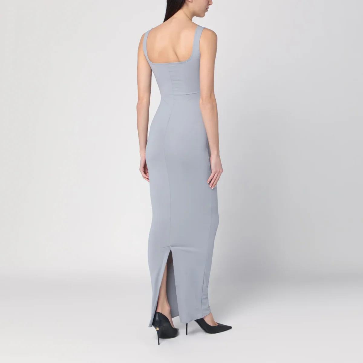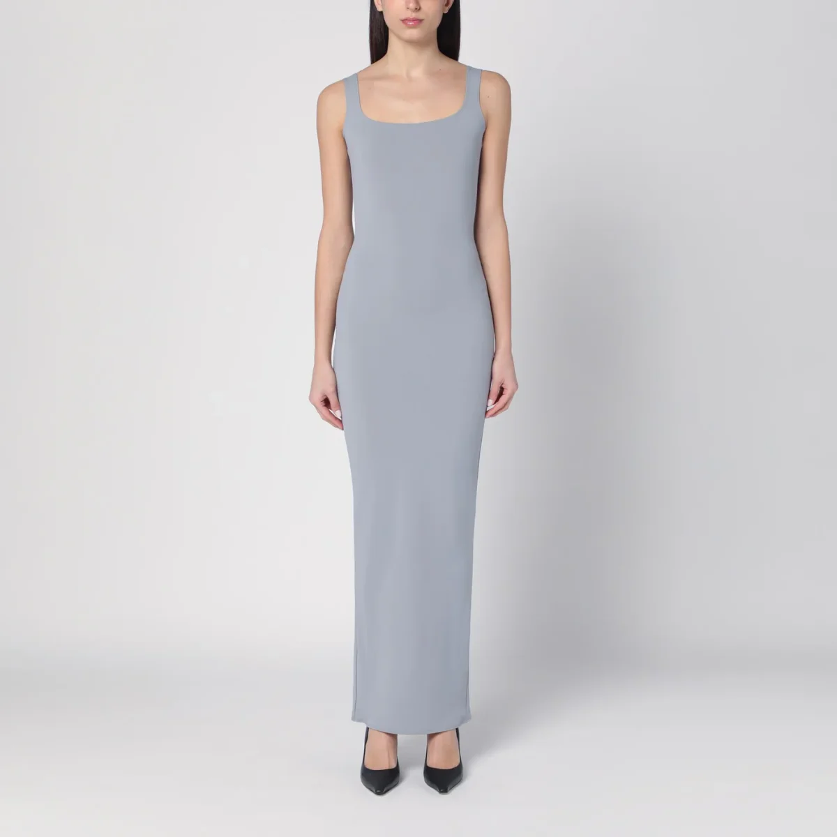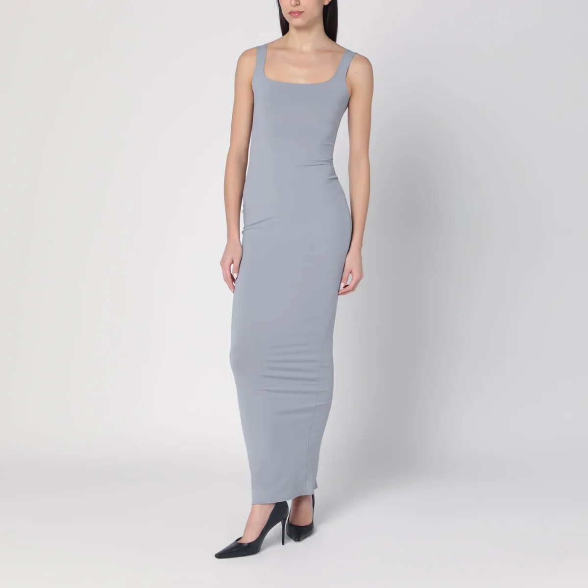 Abito lungo smanicato di Entire Studios in misto nylon elasticizzato grigio, caratterizzato da ampio girocollo, spalline, spacco posteriore e vestibilità aderente.