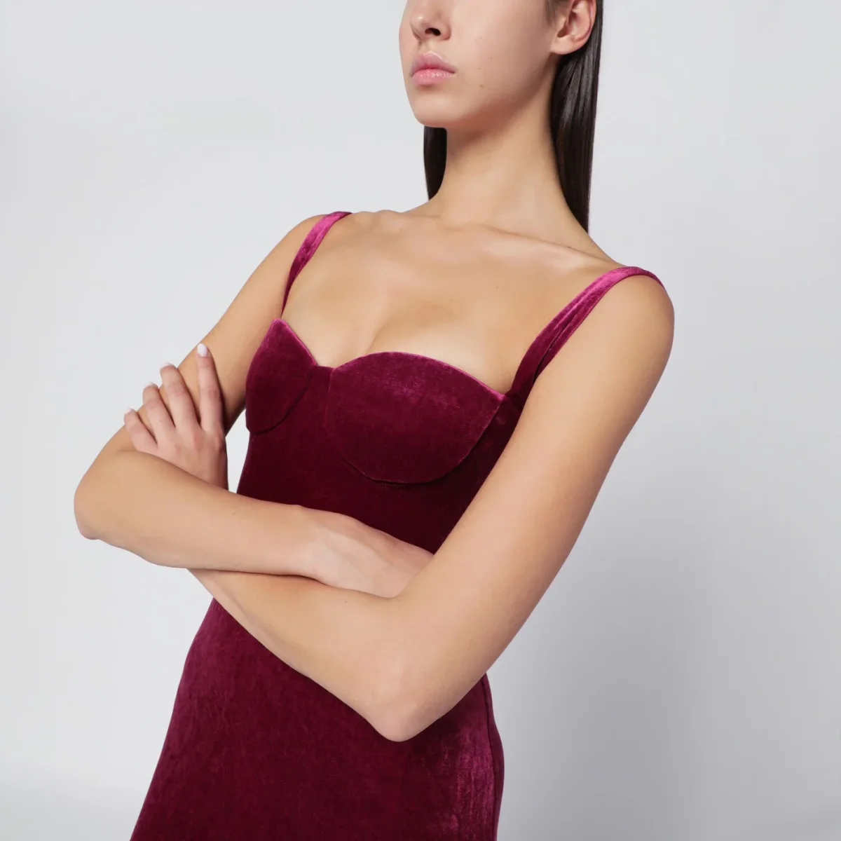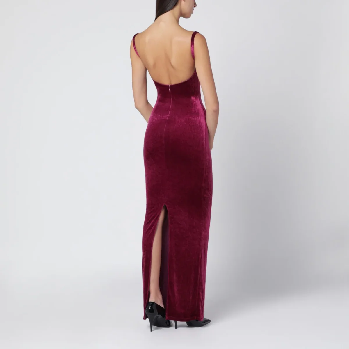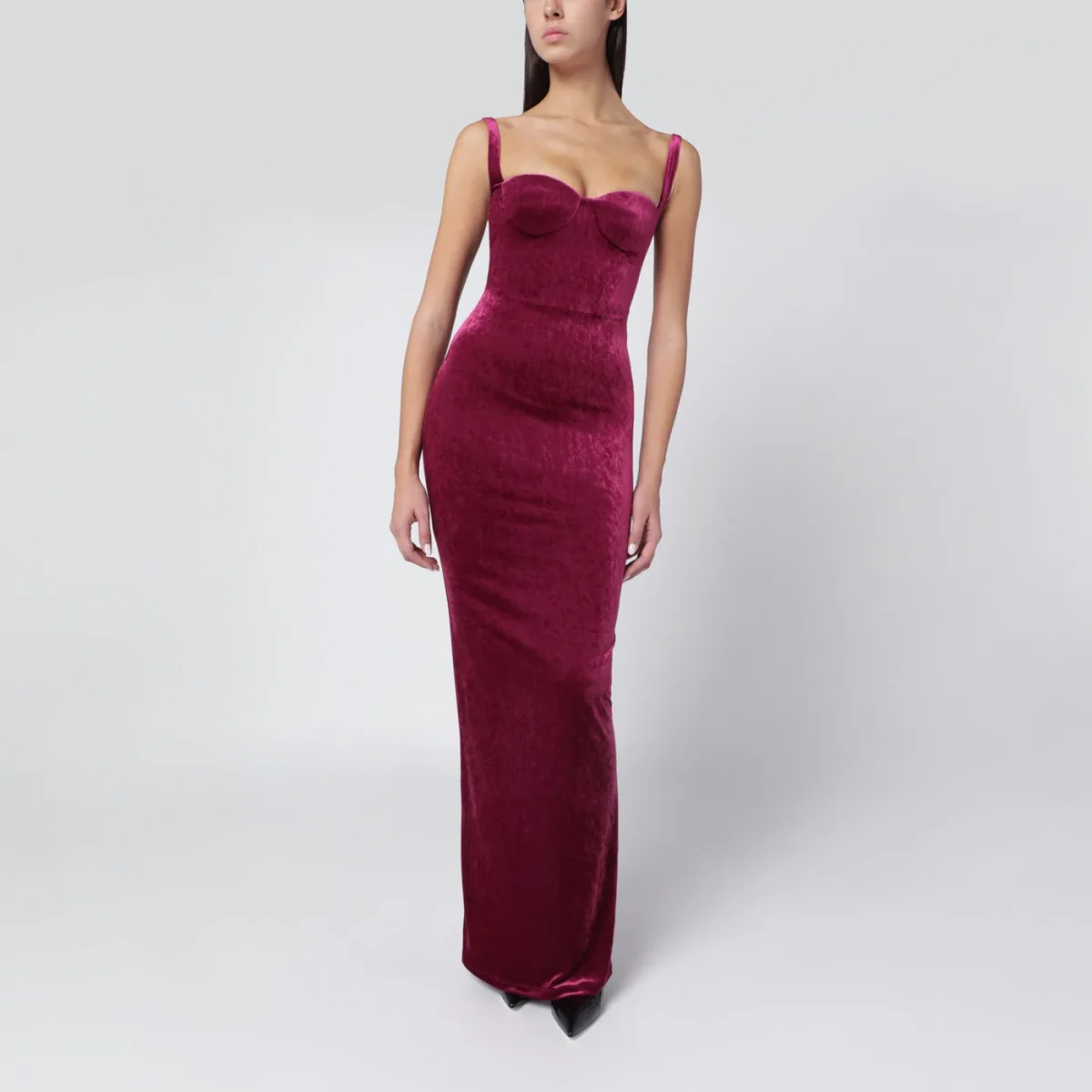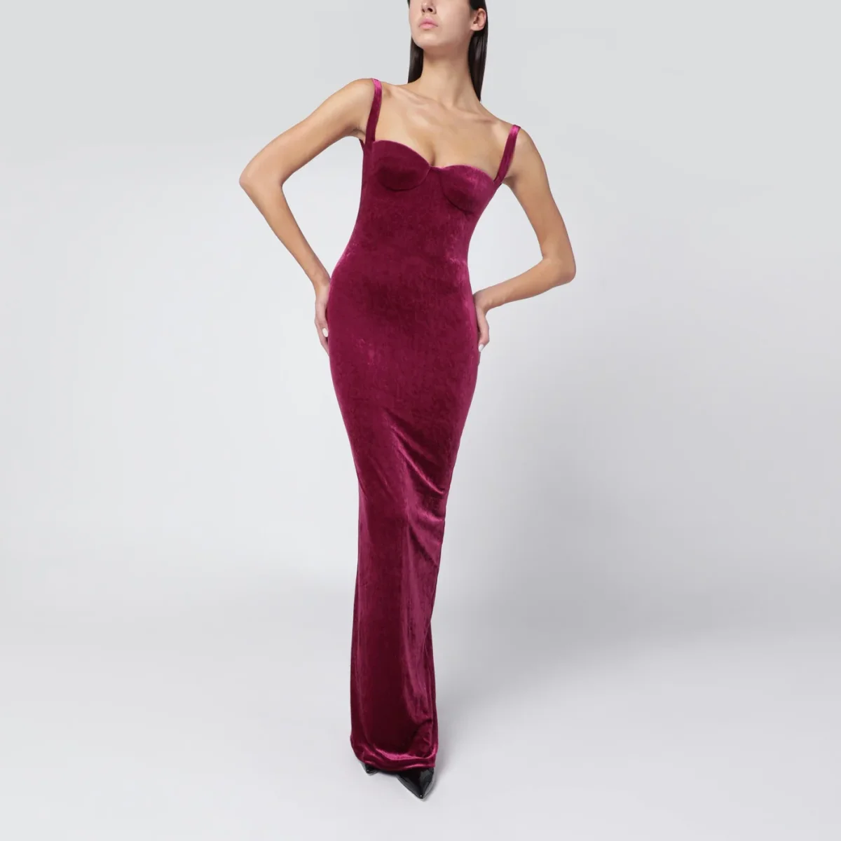 Abito lungo di Balenciaga in velluto color prugna, caratterizzato da design aderente, spalline sottili, bustier con ferretto, scollo profondo sul retro e chiusura posteriore con zip.
