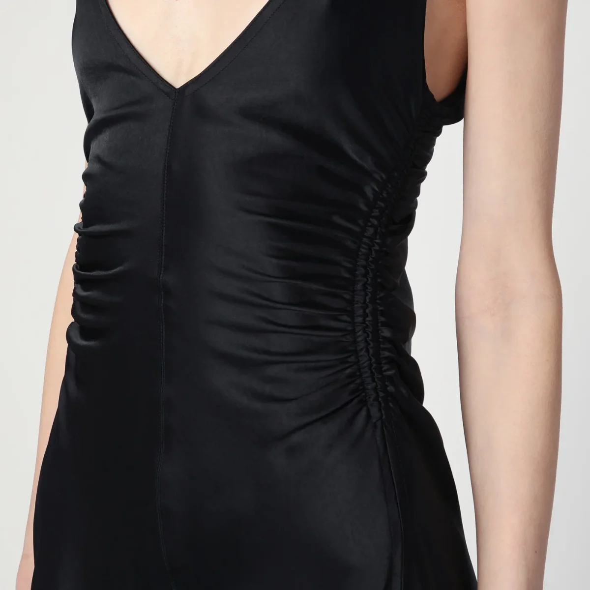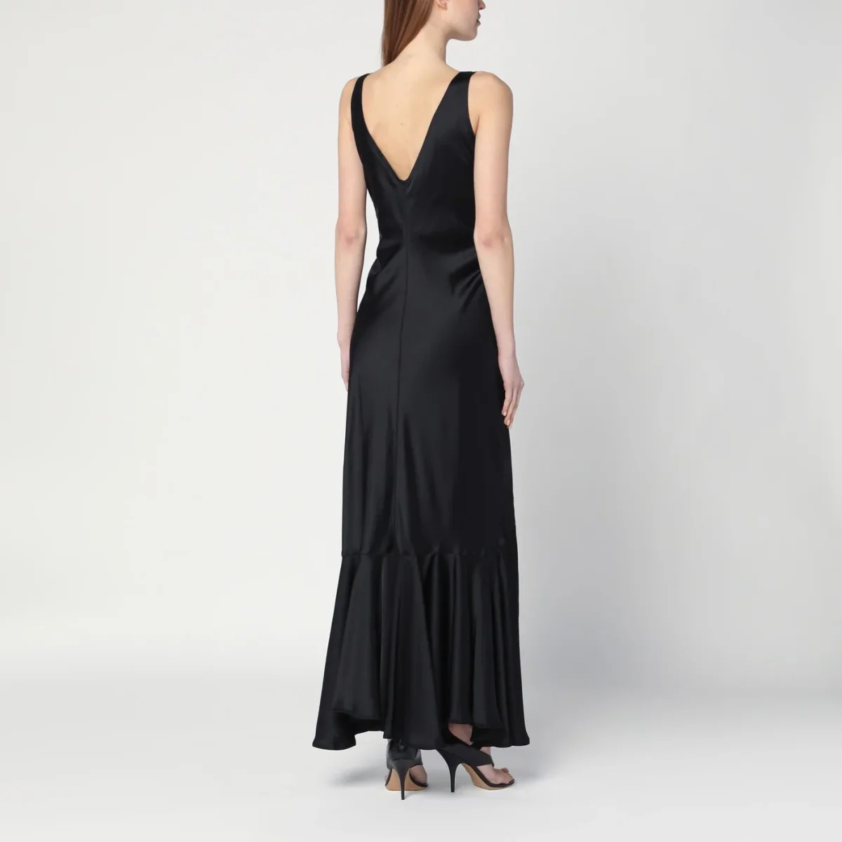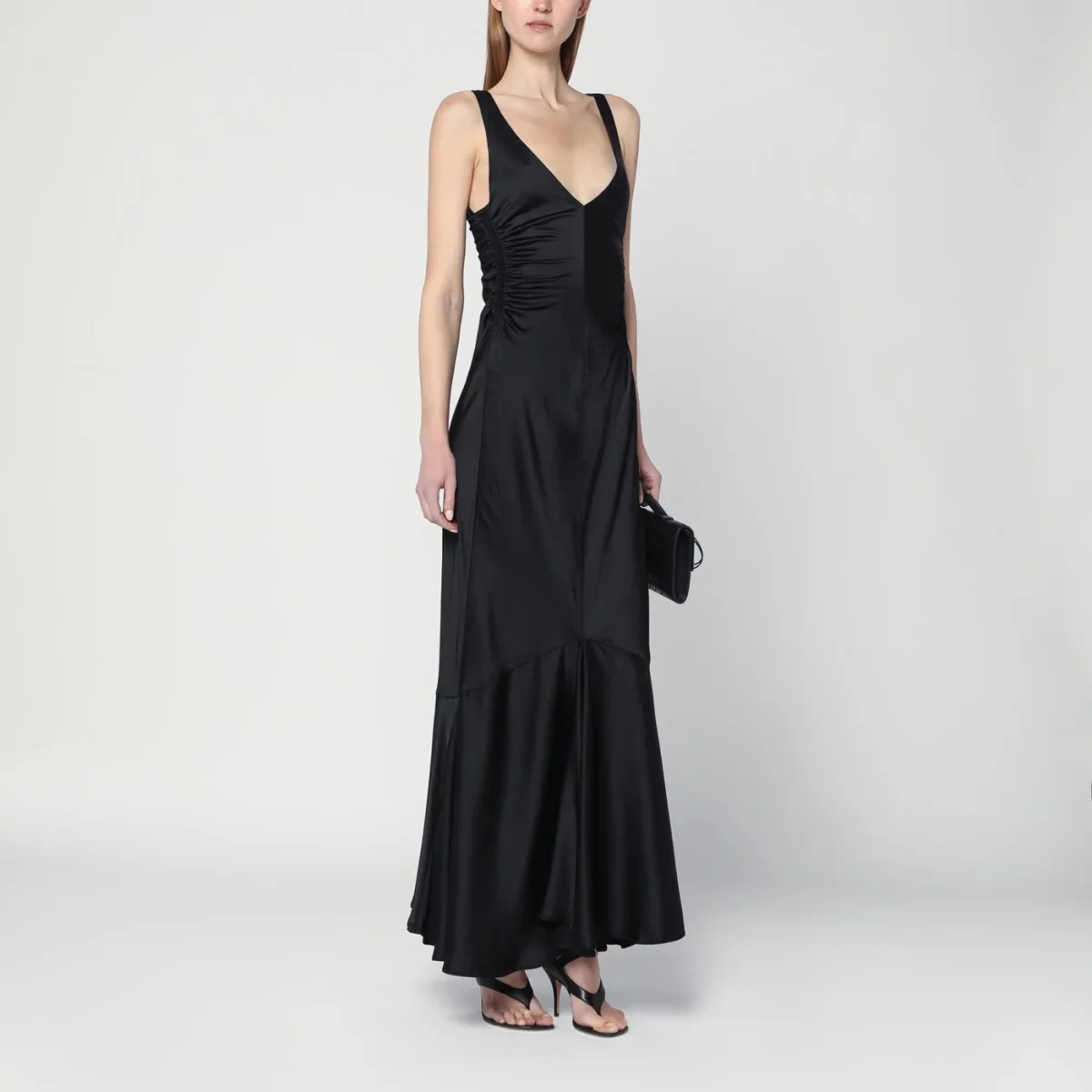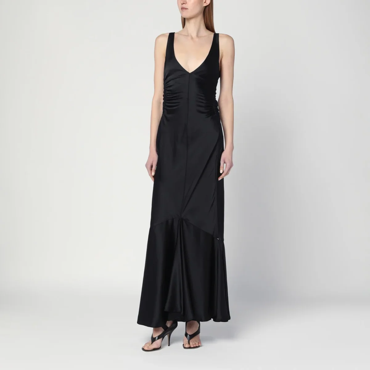 Abito lungo smanicato di Sportmax in raso nero, caratterizzato da scollo profondo sul davanti e sul retro e fianchi con arricciature.