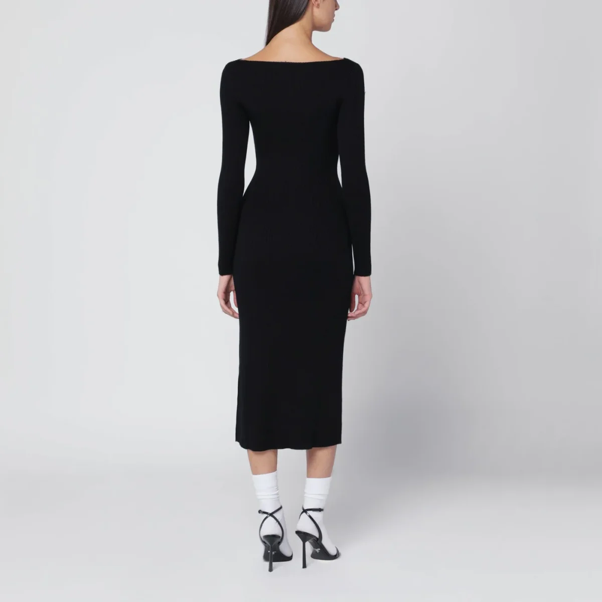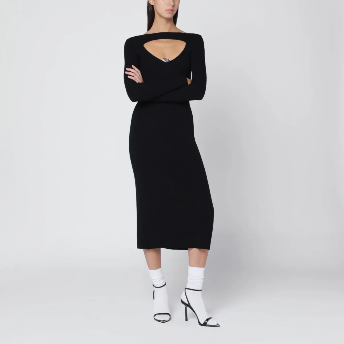 Abito midi di Diesel in lana nero, caratterizzato da design a costine, maniche lunghe, cut-out frontale triangolare con logo Oval D sulla scollatura e vestibilità aderente.