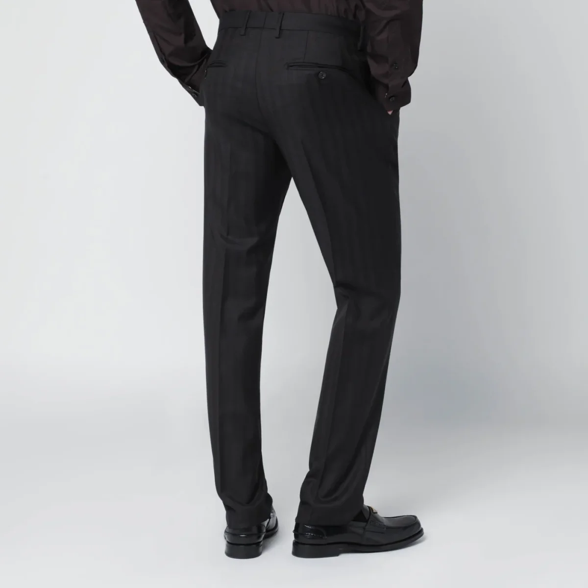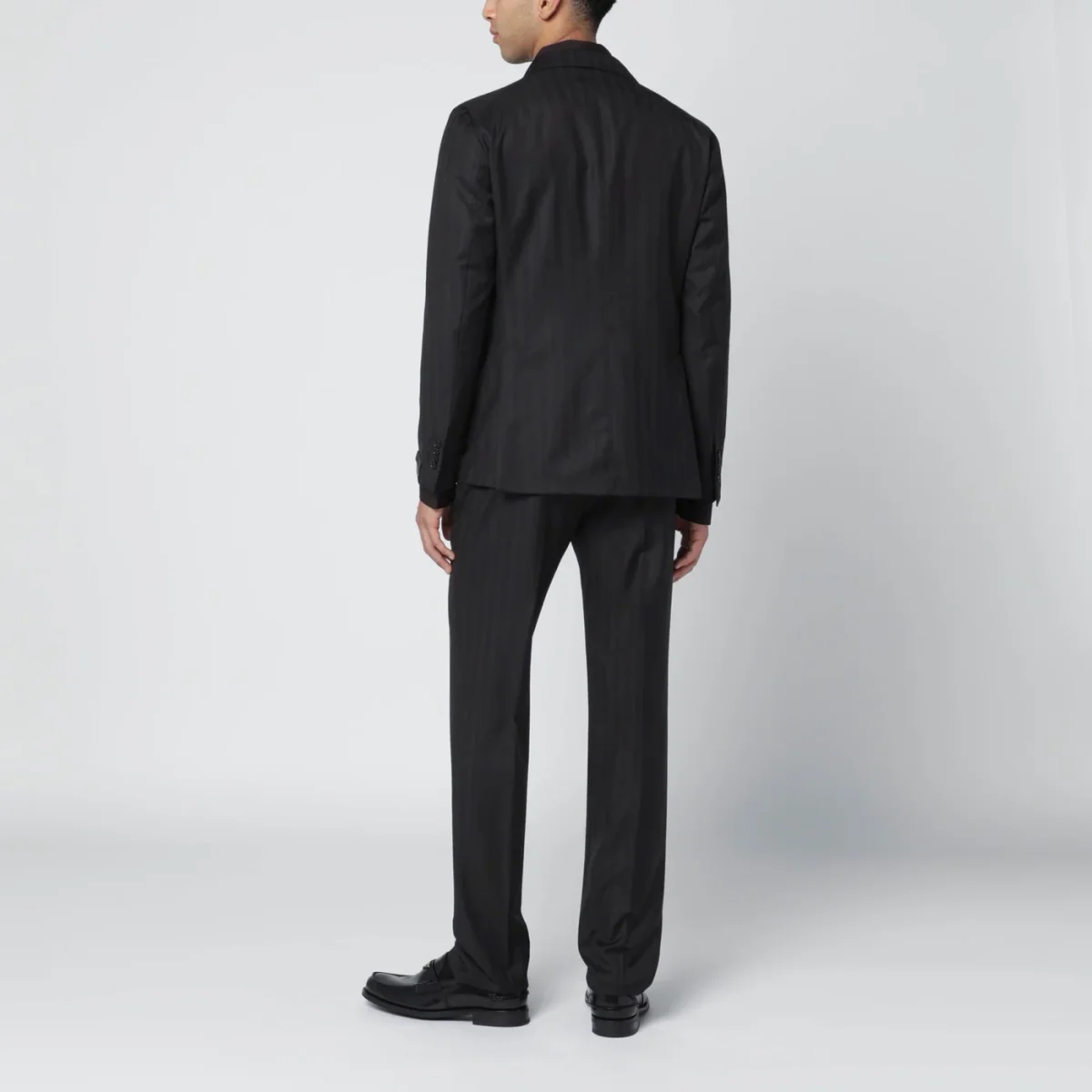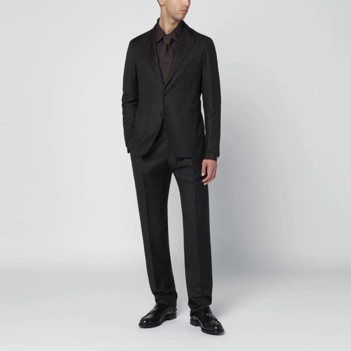 Abito monopetto di Tagliatore in lana marrone rigato, caratterizzato da manica lunga, chiusura tramite bottoni, due tasche sul davanti, una tasca a filetto e doppio spacco posteriore. Pantalone con chiusura frontale, passanti per cintura, due tasche a filetto sui lati e due tasche a filetto sul retro.