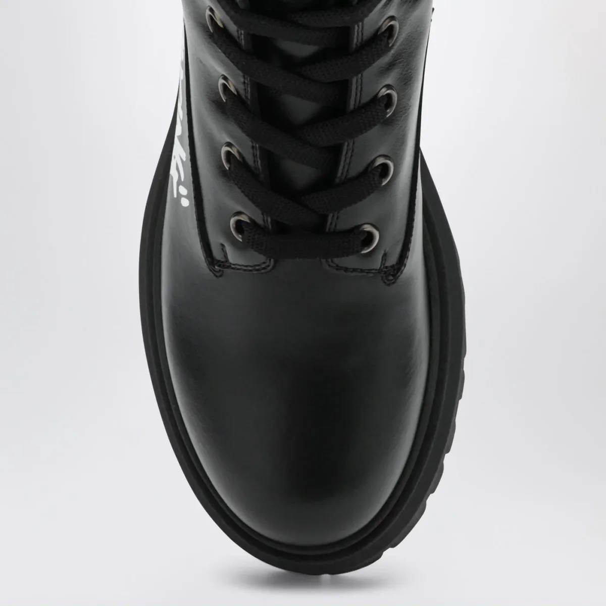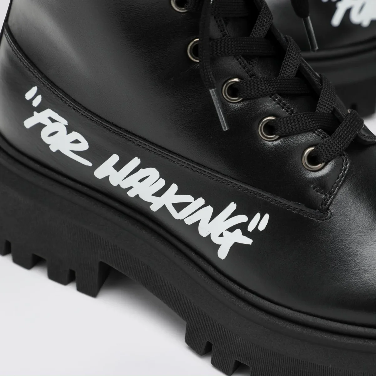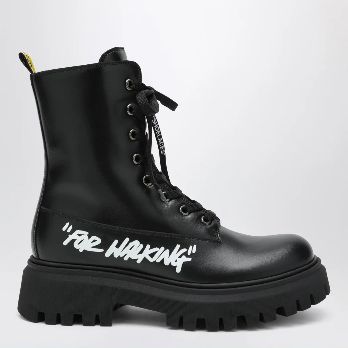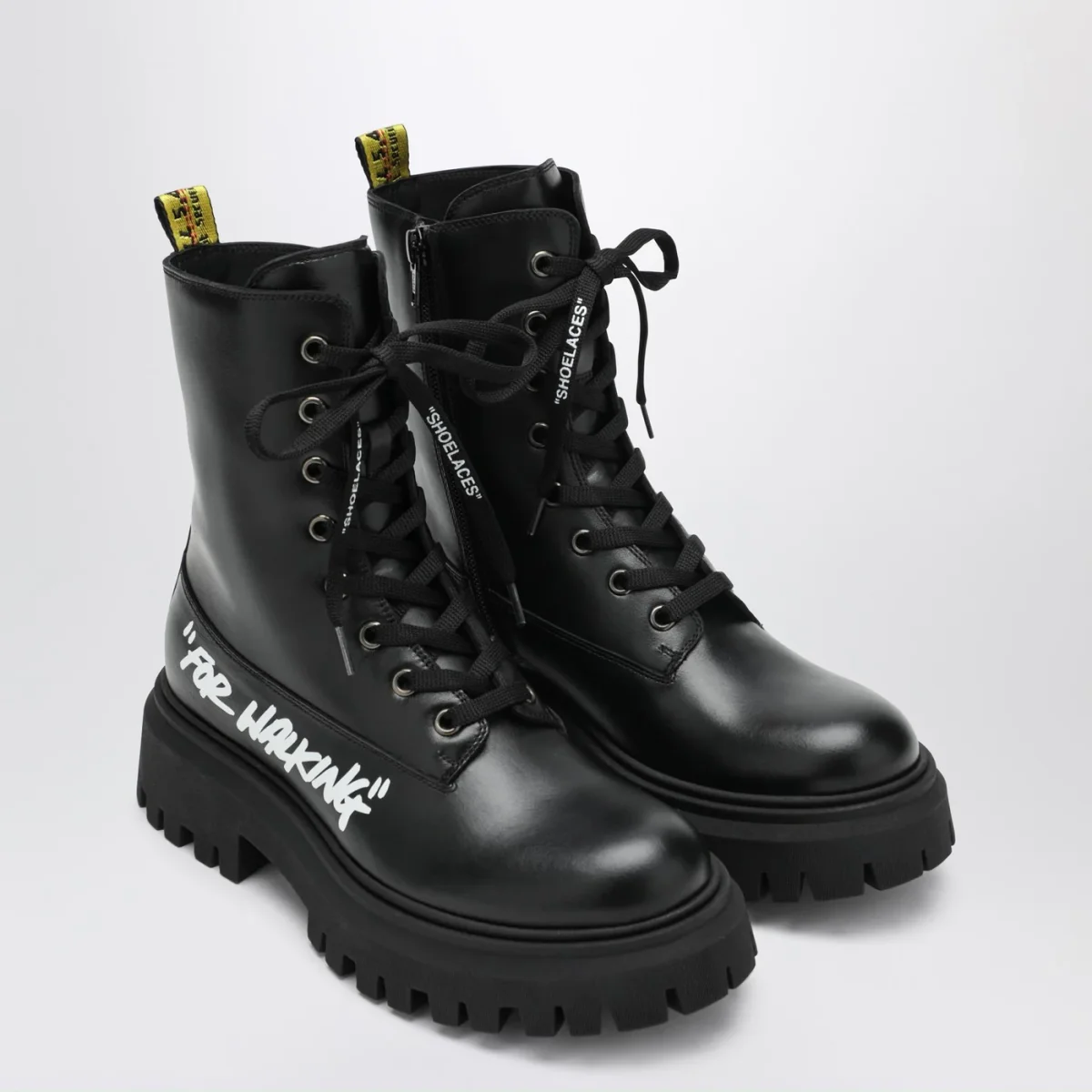 Anfibi Off-White da bambina neri in pelle, caratterizzati da chiusura con cerniera laterale, lacci frontali, suola in gomma e scritta bianca « For Walking » sul lato.