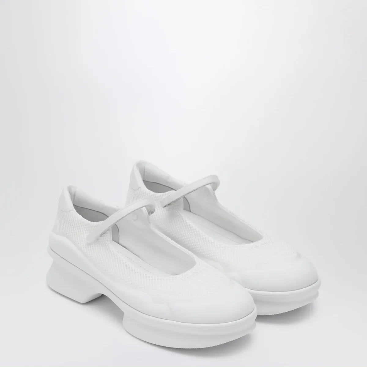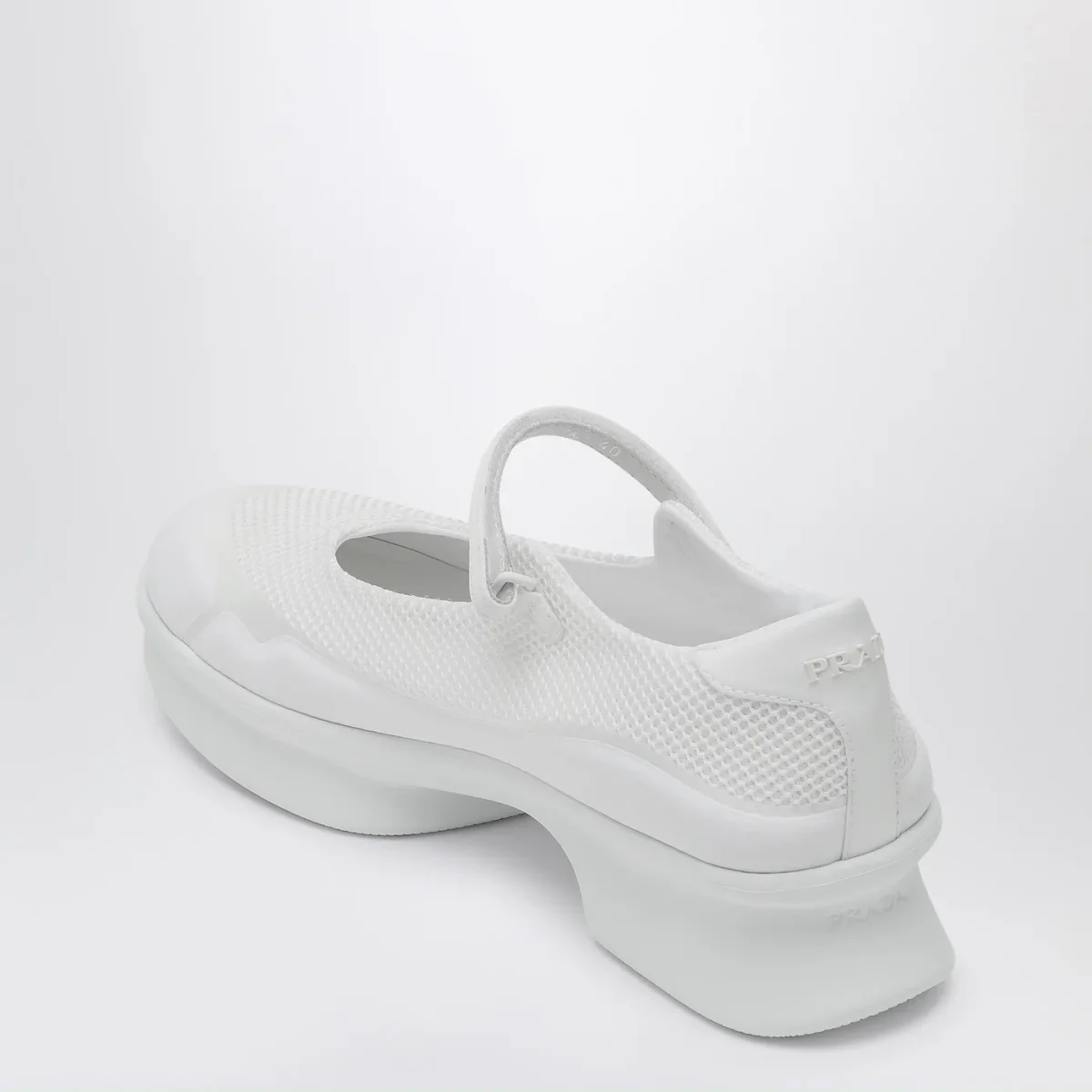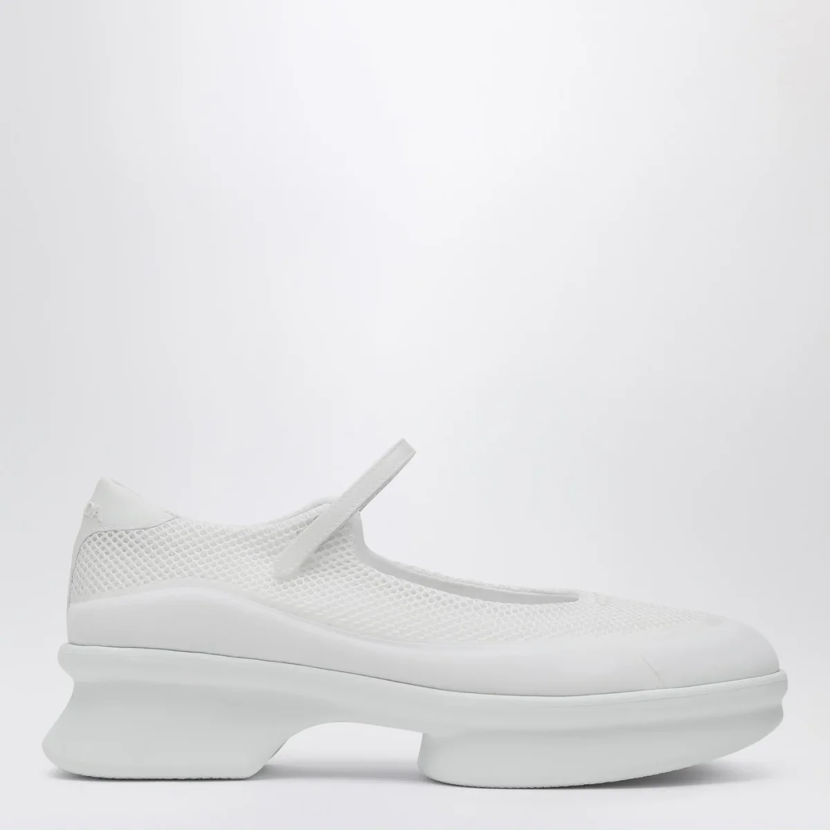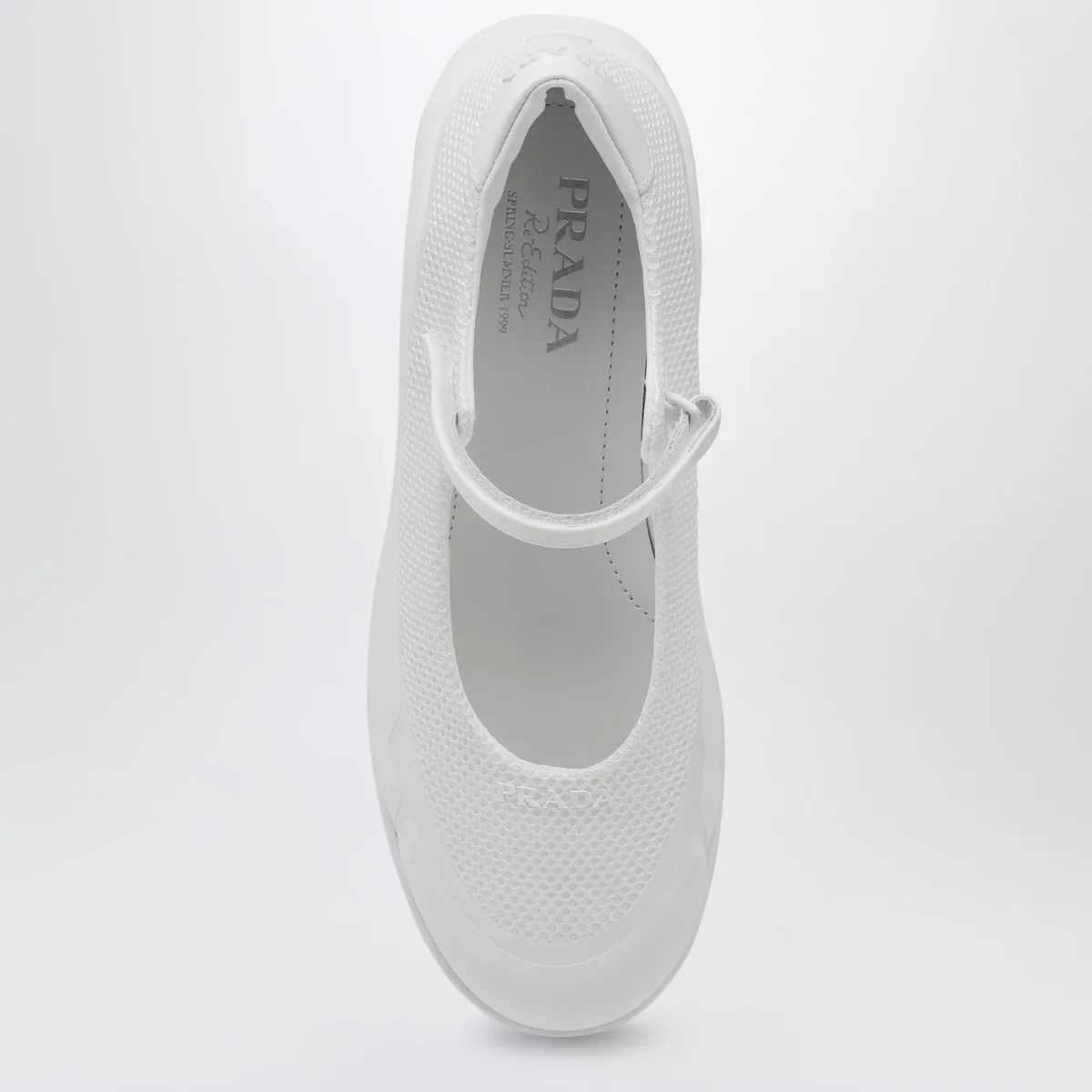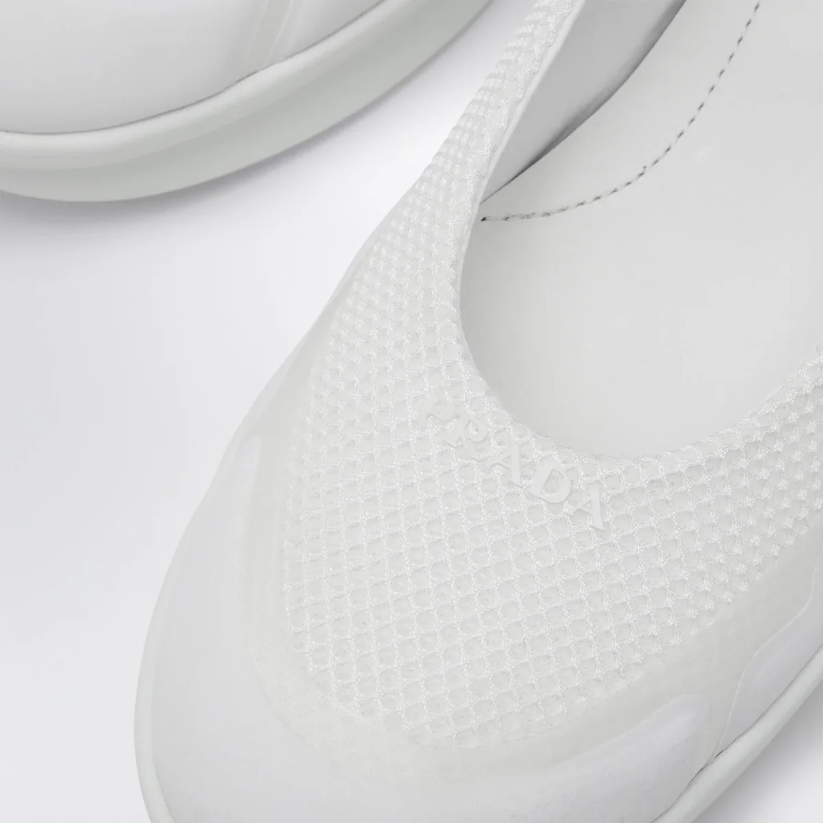 Ballerina di Prada in mesh bianca, caratterizzata da punta tonda, logo lettering tono su tono sul davanti e sul retro, cinturino con velcro e suola in gomma.