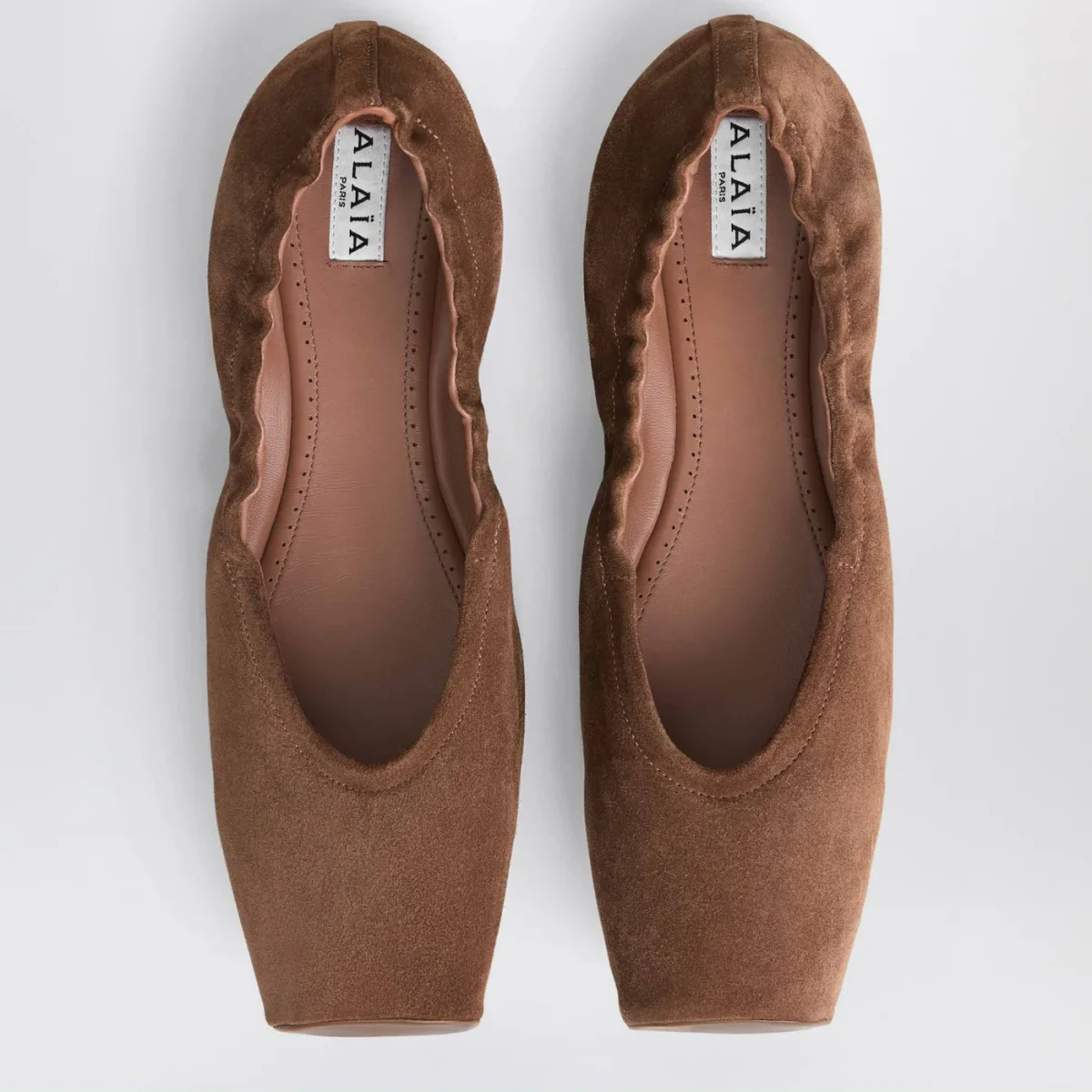 Ballerina di Alaïa con tomaia in pelle scamosciata e pelle liscia marrone, caratterizzata da punta squadrata, bordo elastico e suola in cuoio e gomma.