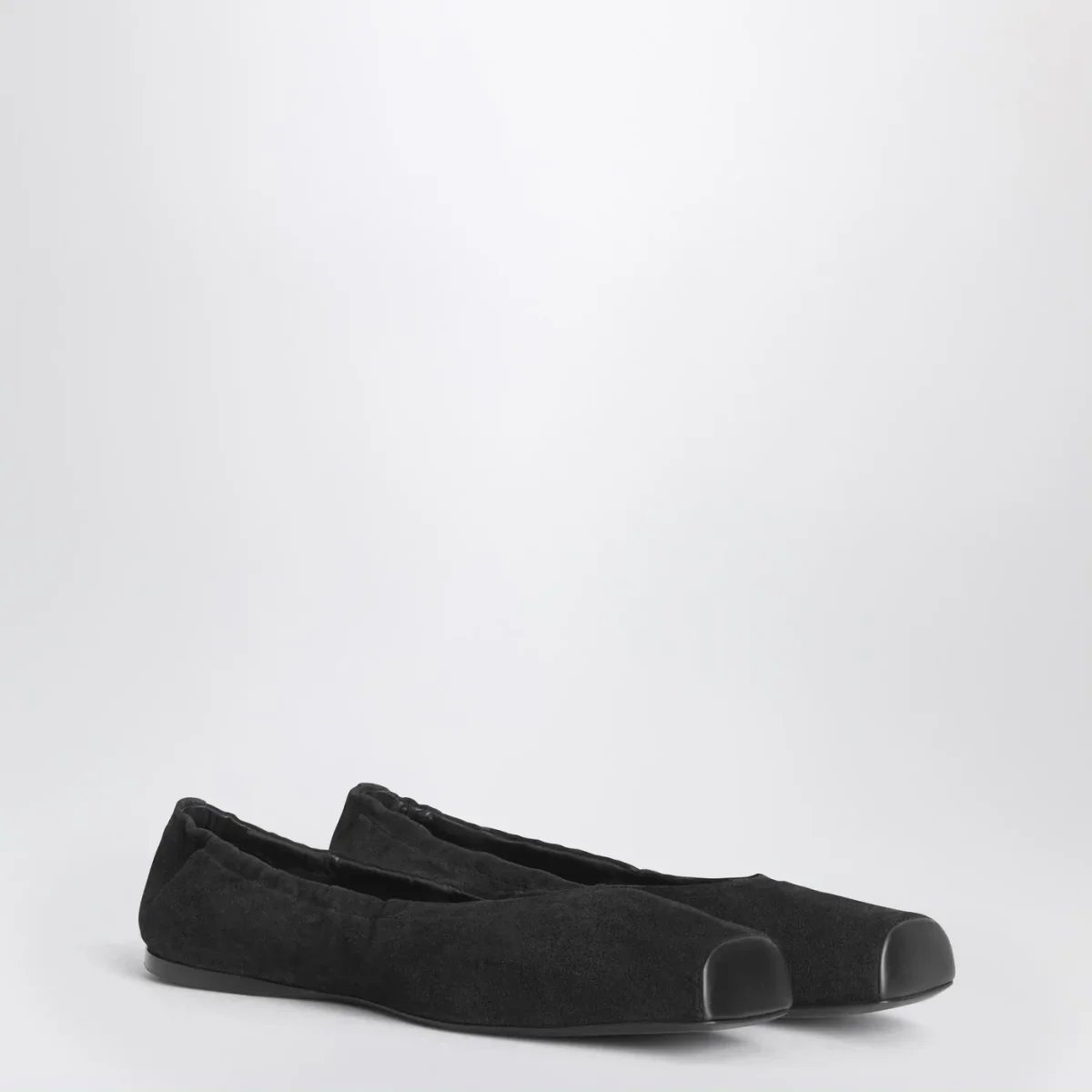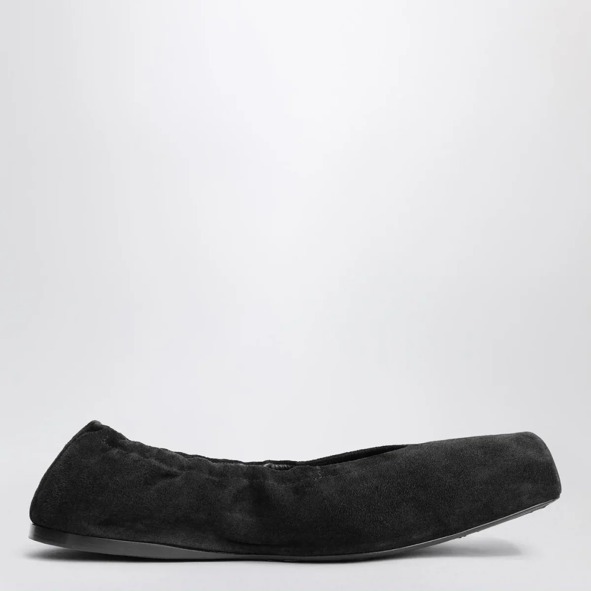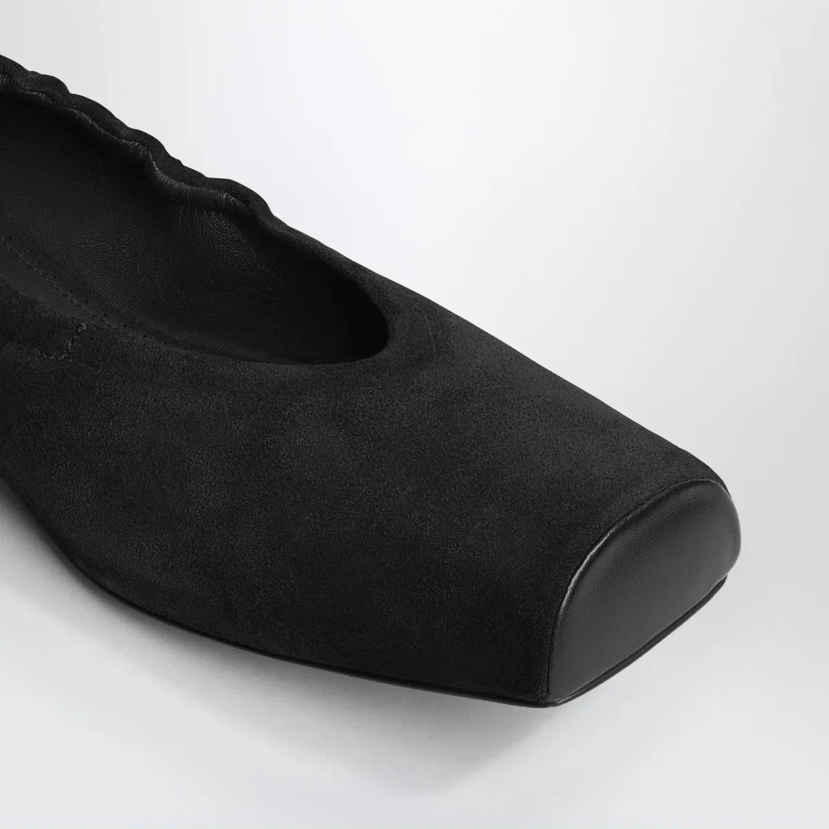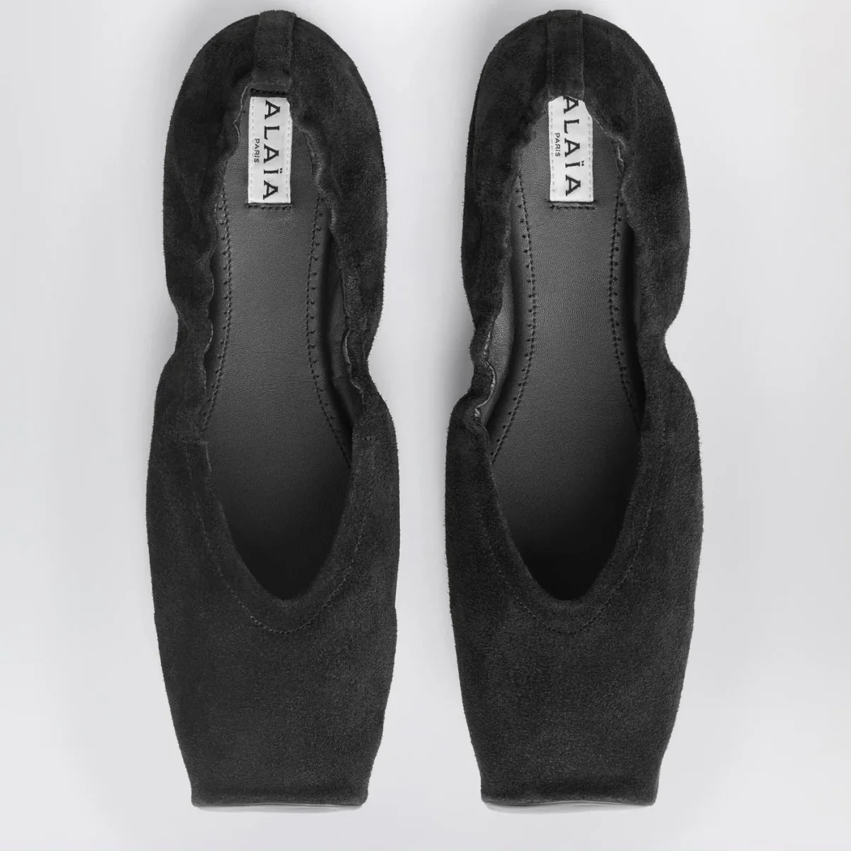 Ballerina di Alaïa con tomaia in pelle scamosciata e pelle liscia nera, caratterizzata da punta squadrata, bordo elastico e suola in cuoio e gomma.