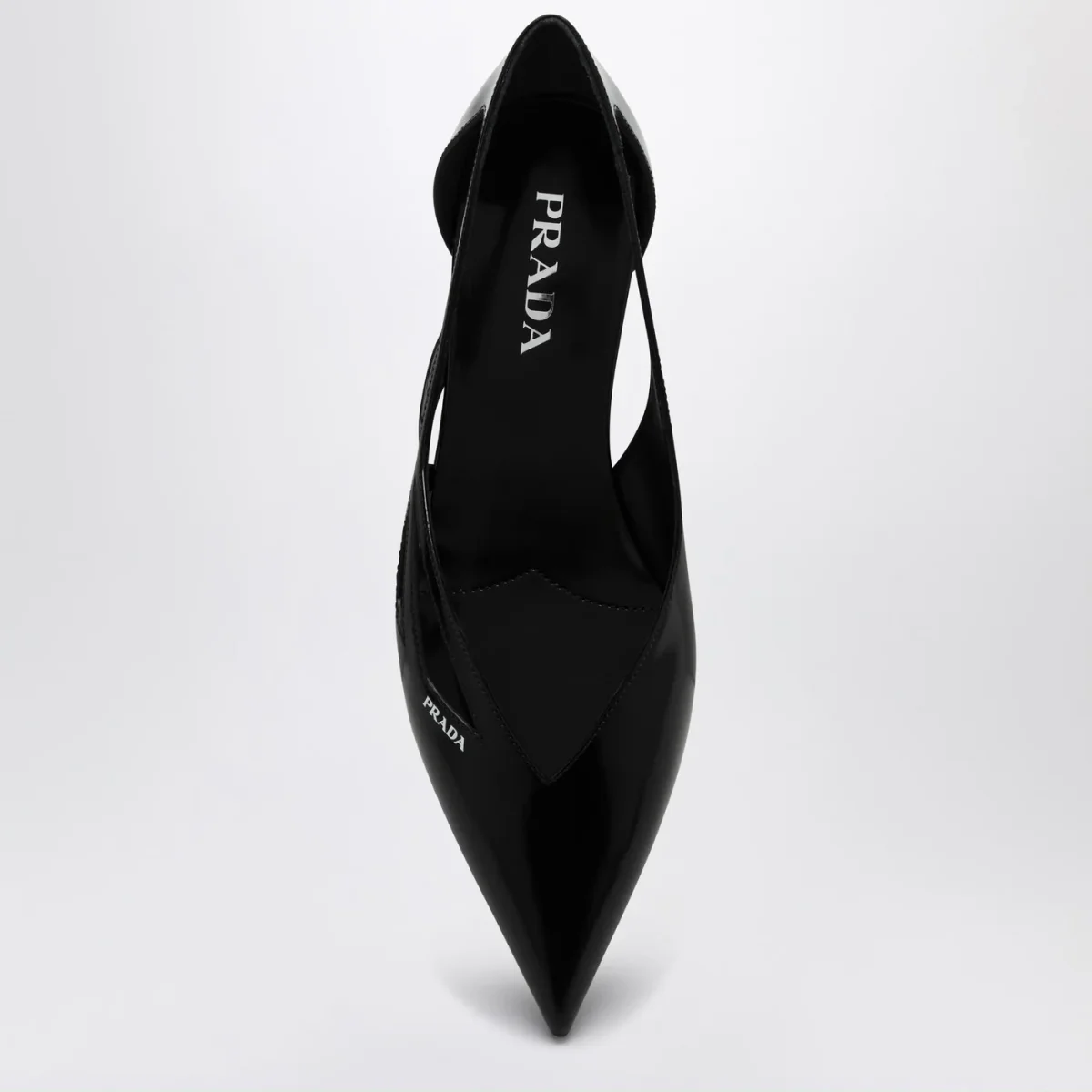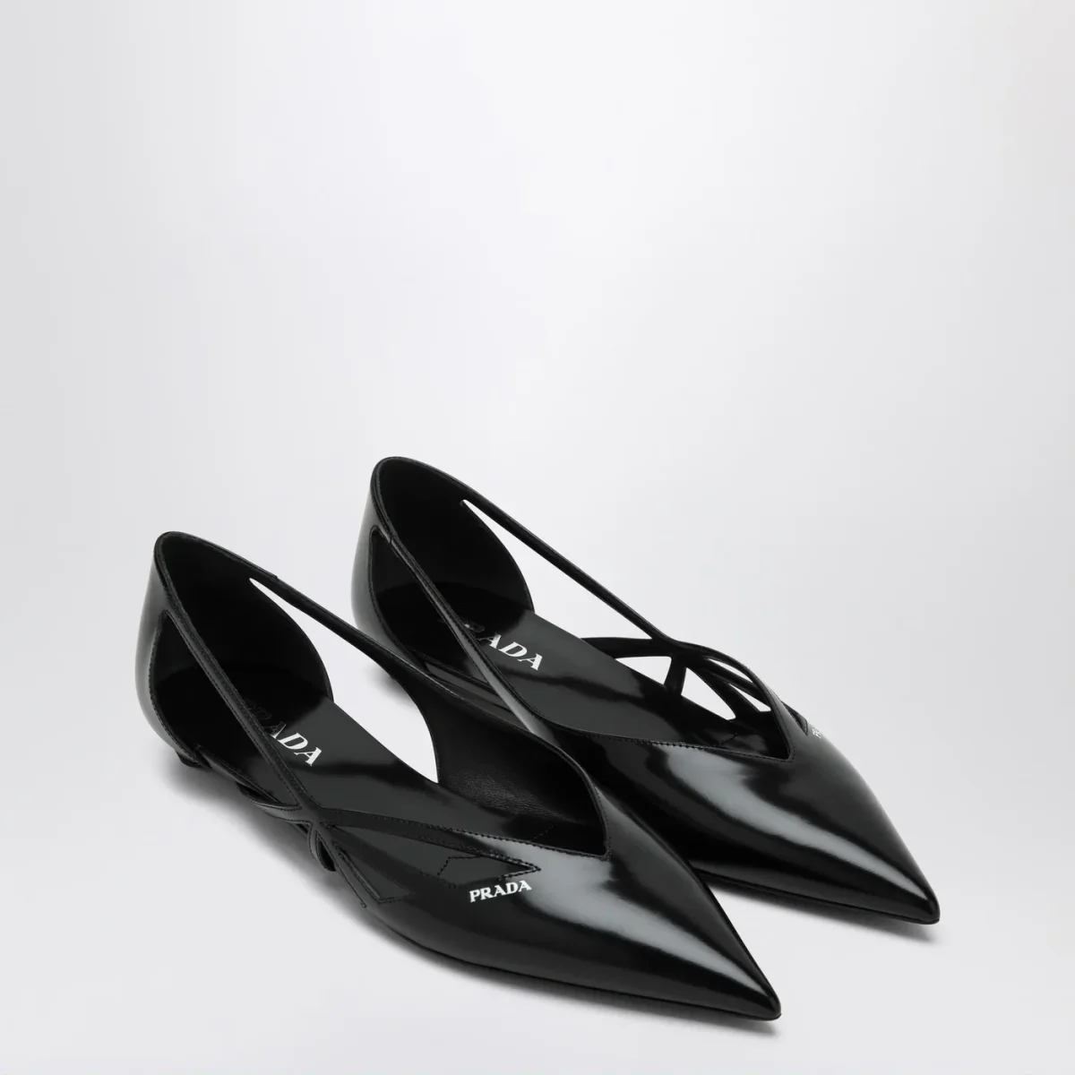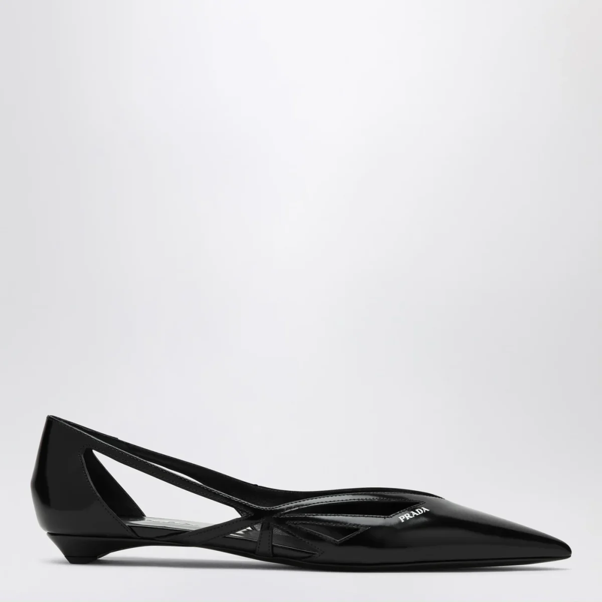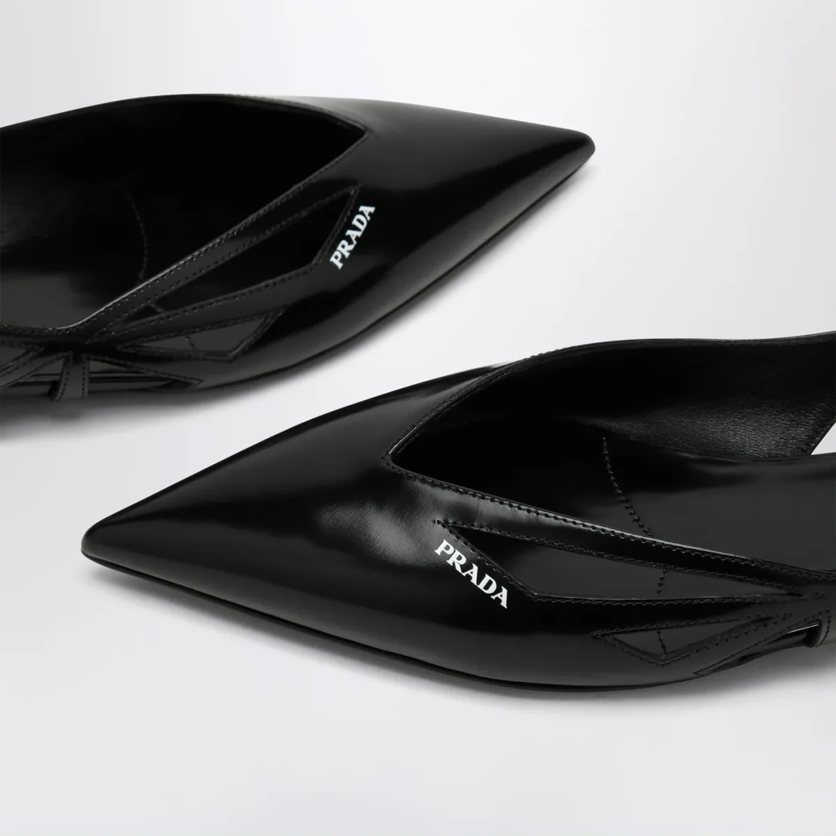 Ballerina di Prada in pelle spazzolata nera, caratterizzata da design a punta, logo lettering a contrasto serigrafato sul davanti, design geometrico con cut out laterali e suola in cuoio.