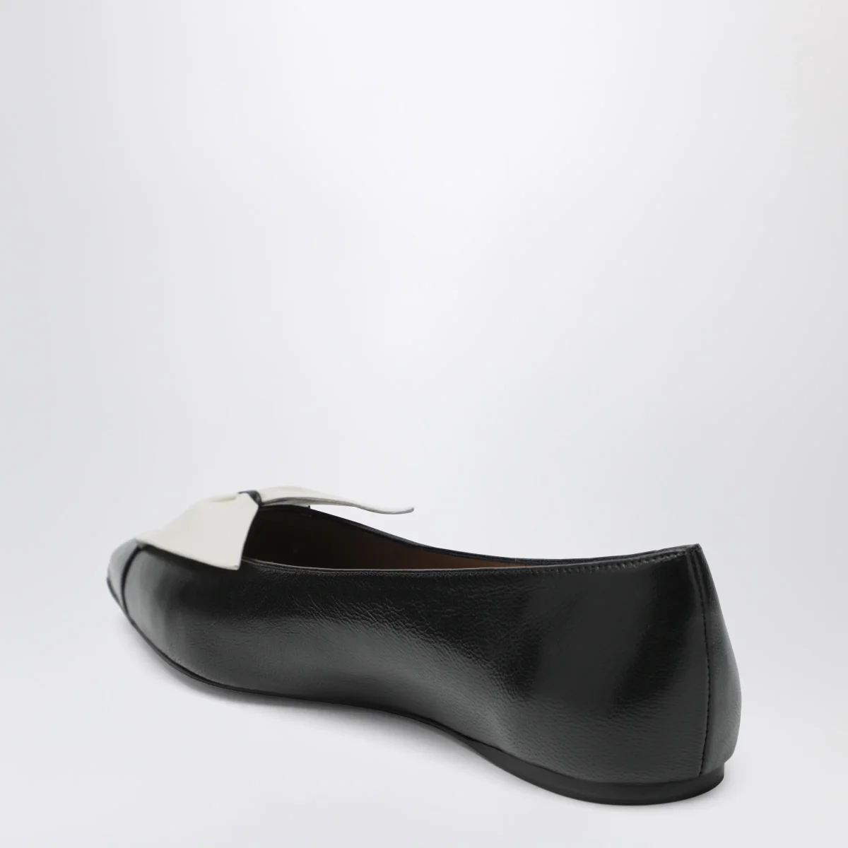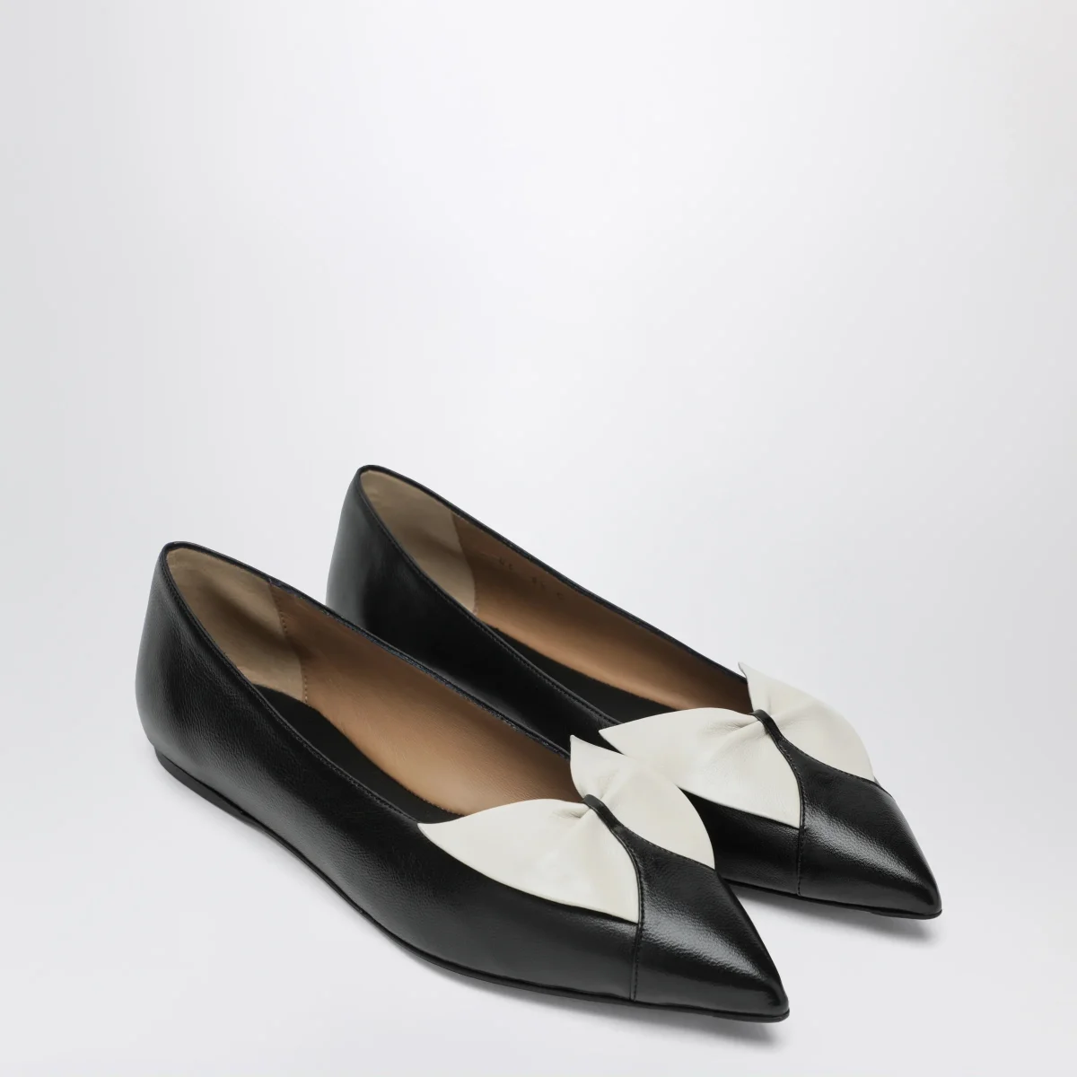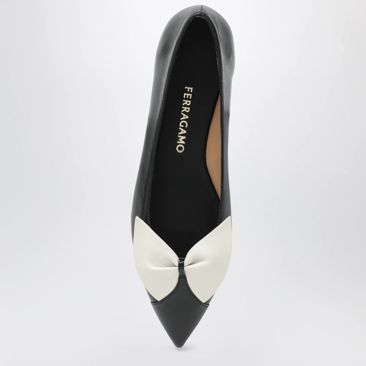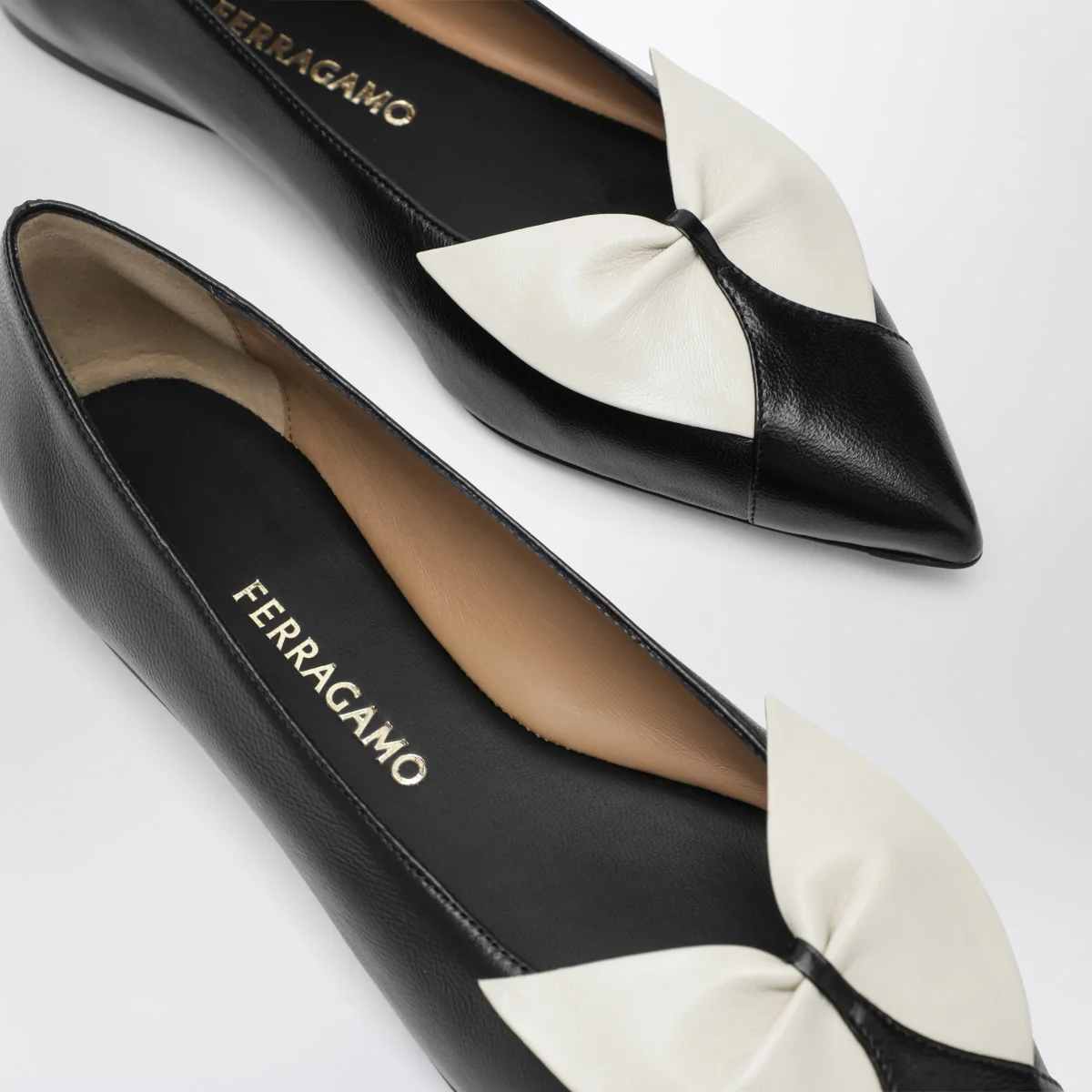 Ballerina di Ferragamo in nappa• Nero / Mascarpone• Dettaglio fiocco a contrasto• Design a punta• Suola in cuoio