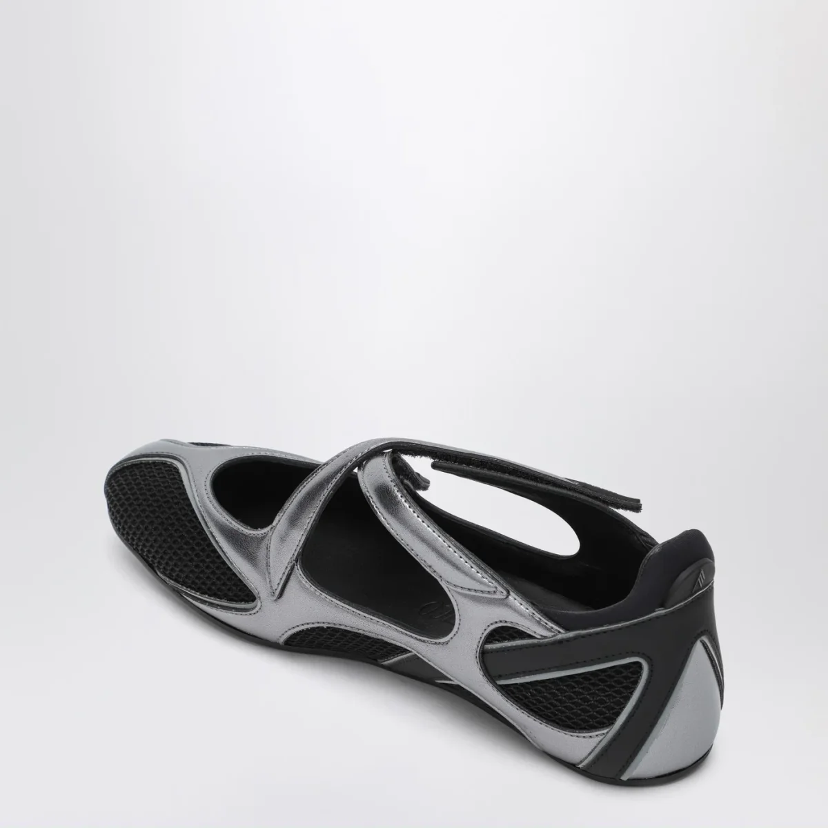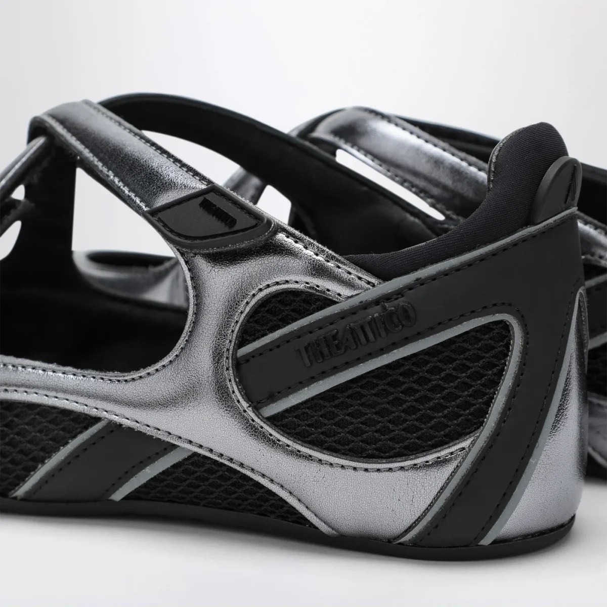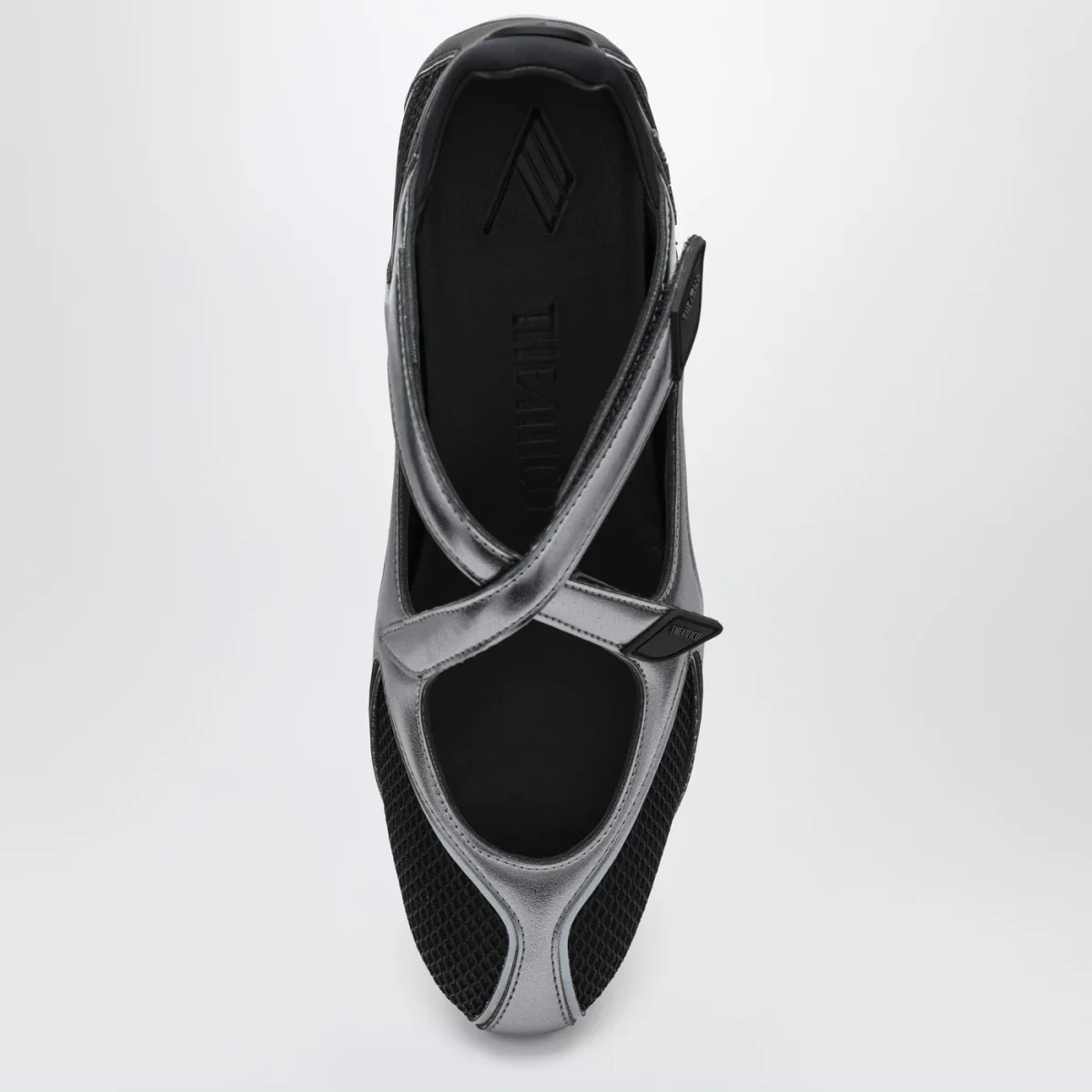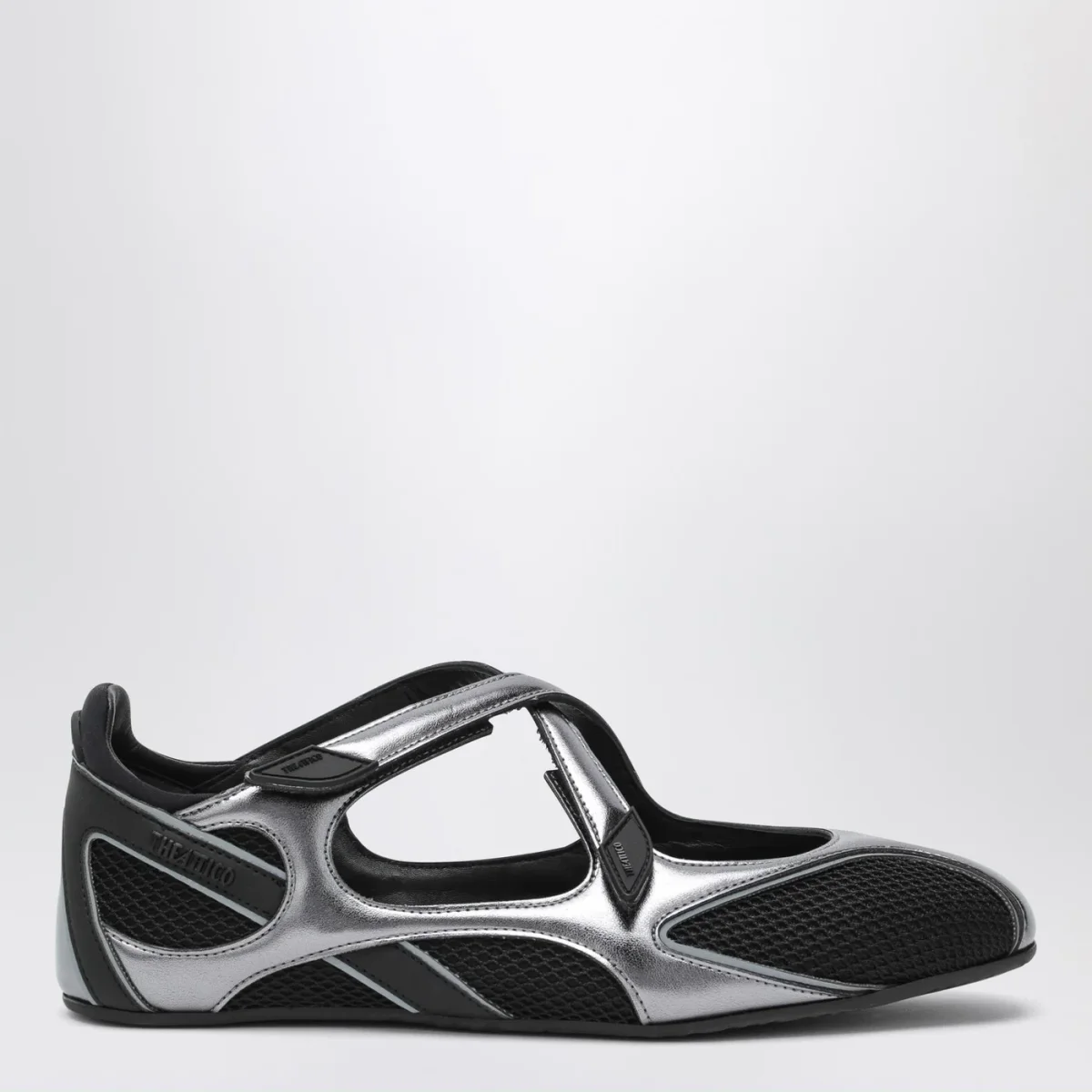 Ballerina di The Attico in tessuto sintetico nera•argento• punta a mandorla• chiusura incrociata con velcro• dettagli in gomma con logo lettering• dettagli cut-out• suola in gomma